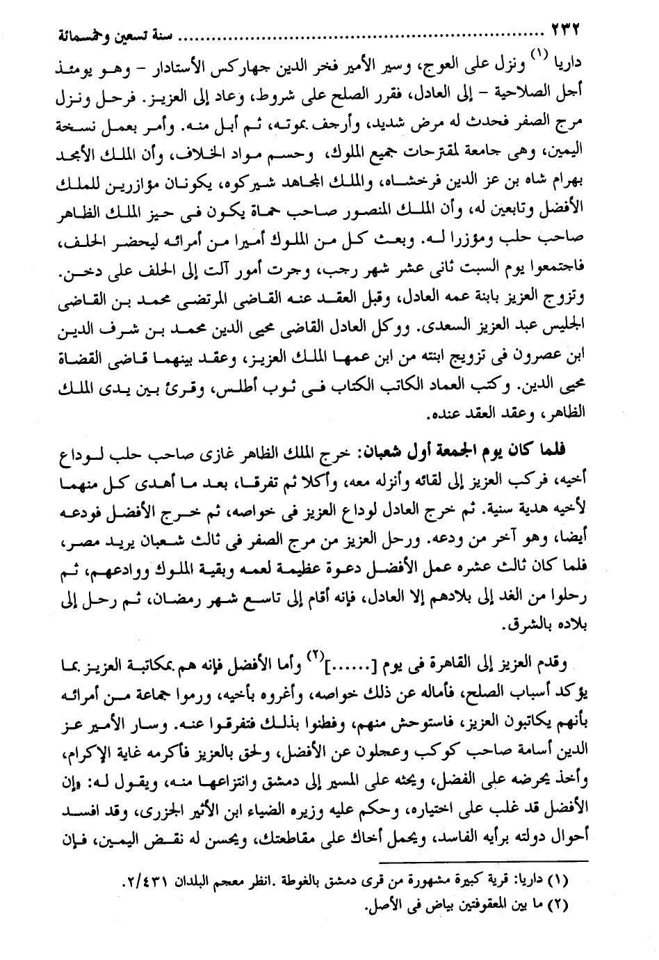 داريا وَنزل على العوج وسير الْأَمِير فَخر الدّين جهاركس الأستادار وَهُوَ يَوْمئِذٍ أجل الصلاحية إِلَى الْعَادِل فقرر الصُّلْح على شُرُوط وَعَاد إِلَى الْعَزِيز فَرَحل وَنزل مرج الصفر فَحدث لَهُ مرض شَدِيد وأرجف بِمَوْتِهِ ثمَّ أبل مِنْهُ. وَأمر بِعَمَل نُسْخَة الْيمن وهى جَامِعَة لمقترحات جَمِيع الْمُلُوك وحسم مواد الْخلاف وَأَن الْملك الأمجد بهْرَام شاه بن عز الدّين فرخشاه وَالْملك الْمُجَاهِد شيركوه يكونَانِ مؤازرين للْملك الْأَفْضَل وتابعين لَهُ وَأَن الْملك الْمَنْصُور صَاحب حماة يكون فِي حيّز الْملك الظَّاهِر صَاحب حلب ومؤزرا لَهُ. وَبعث كل من الْمُلُوك أَمِيرا من أمرائه ليحضر الْحلف فَاجْتمعُوا يَوْم السبت ثَانِي عشر شهر رَجَب وَجَرت أُمُور آلت إِلَى الْحلف على دخن. وَتزَوج الْعَزِيز بابنة عَمه الْعَادِل وَقبل العقد عَنهُ القَاضِي المرتضى مُحَمَّد بن القَاضِي الجليس عبد الْعَزِيز السَّعْدِيّ. ووكل الْعَادِل القَاضِي محيي الدّين مُحَمَّد بن شرف الدّين بن عصرون فِي تَزْوِيج ابْنَته من ابْن عَمها الْملك الْعَزِيز وَعقد بَينهمَا قَاضِي الْقُضَاة محيي الدّين. وَكتب الْعِمَاد الْكَاتِب الْكتاب فِي ثوب أطلس وَقُرِئَ بَين يَدي الْملك الظَّاهِر وَعقد العقد عِنْده. فَلَمَّا كَانَ يَوْم الْجُمُعَة أول شعْبَان: خرج الْملك الظَّاهِر غَازِي صَاحب حلب لوداع أَخِيه فَركب الْعَزِيز إِلَى لِقَائِه وأنزله مَعَه وأكلا ثمَّ تفَرقا بعد مَا أهْدى كل مِنْهُمَا لِأَخِيهِ هَدِيَّة سنية. ثمَّ خرج الْعَادِل لوداع الْعَزِيز فِي خواصه ثمَّ خرج الْأَفْضَل فودعه أَيْضا وَهُوَ آخر من ودعه. ورحل الْعَزِيز من مرج الصفر فِي ثَالِث شعْبَان يُرِيد مصر فَلَمَّا كَانَ ثَالِث عشره عمل الْأَفْضَل دَعْوَة عَظِيمَة لِعَمِّهِ وَبَقِيَّة الْمُلُوك ووادعهم ثمَّ رحلوا من الْغَد إِلَى بِلَادهمْ إِلَّا الْعَادِل فَإِنَّهُ أَقَامَ إِلَى تَاسِع شهر رَمَضَان ثمَّ رَحل إِلَى بِلَاده بالشرق. وَقدم الْعَزِيز إِلَى الْقَاهِرَة فِي يَوْم وَأما الْأَفْضَل فَإِنَّهُ هم بمكاتبة الْعَزِيز بِمَا يُؤَكد أَسبَاب الصُّلْح فأماله عَن ذَلِك خواصه وأغروه بأَخيه ورموا جمَاعَة من أمرائه بِأَنَّهُم يكاتبون الْعَزِيز فاستوحش مِنْهُم وفطنوا بذلك فَتَفَرَّقُوا عَنهُ. وَسَار الْأَمِير عز الدّين أُسَامَة صَاحب كَوْكَب وعجلون عَن الْأَفْضَل وَلحق بالعزيز فَأكْرمه غَايَة الْإِكْرَام وَأخذ يحرضه على الْفضل ويحثه على الْمسير إِلَى دمشق وانتزاعها مِنْهُ وَيَقُول لَهُ: إِن الْأَفْضَل قد غلب على اخْتِيَاره وَحكم عَلَيْهِ وزيره الضياء ابْن الْأَثِير الْجَزرِي وَقد افسد أَحْوَال دولته بِرَأْيهِ الْفَاسِد وَيحمل أَخَاك على مقاطعتك وَيحسن لَهُ نقض الْيمن فَإِن