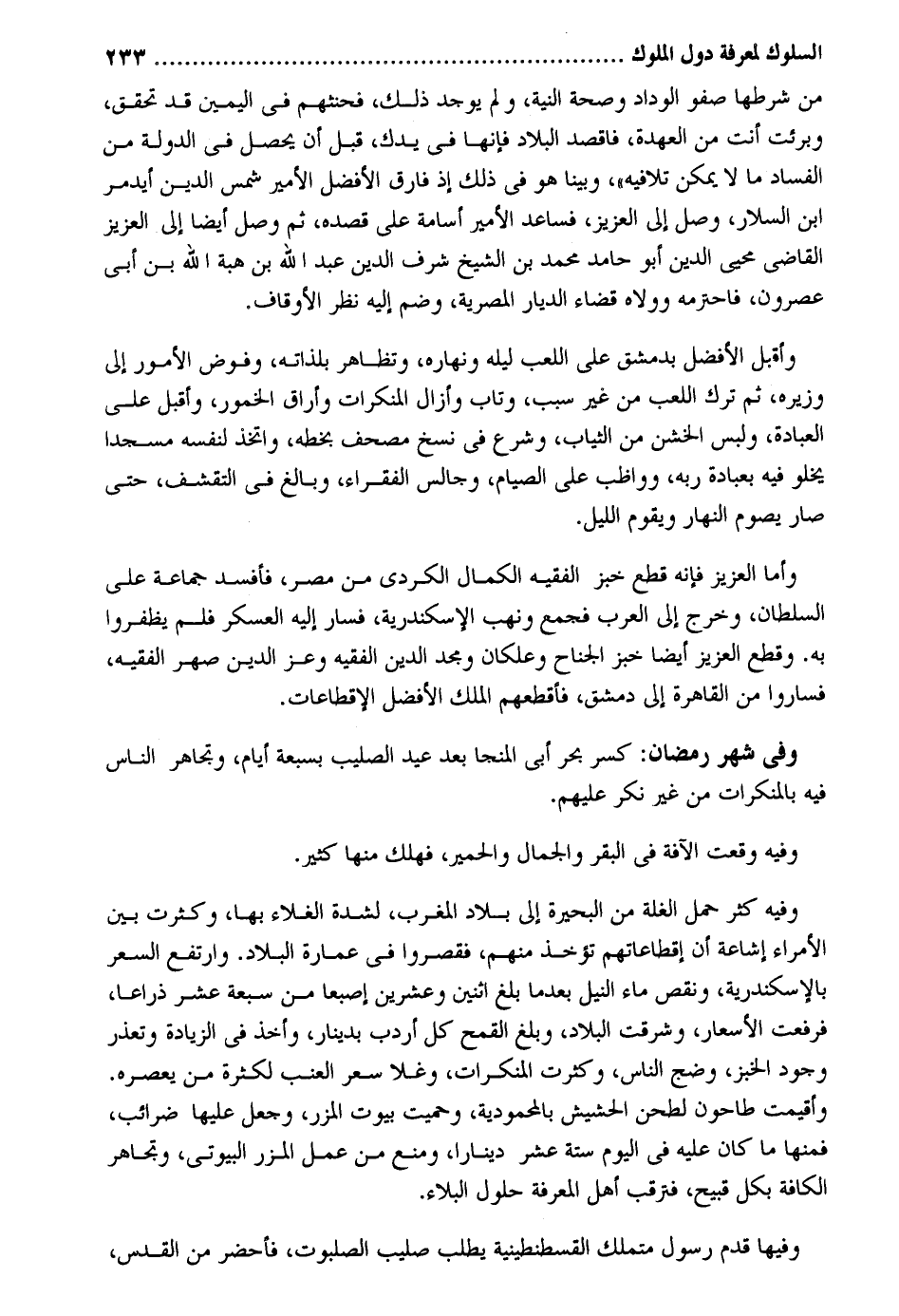 من شَرطهَا صفو الوداد وَصِحَّة النِّيَّة وَلم يُوجد ذَلِك فحنثهم فِي الْيَمين قد تحقق وبرئت أَنْت من الْعهْدَة فاقصد الْبِلَاد فَإِنَّهَا فِي يدك قبل أَن يحصل فِي الدولة من الْفساد مَا لَا يُمكن تلافيه وَبينا هُوَ فِي ذَلِك إِذْ فَارق الْأَفْضَل الْأَمِير شمس الدّين أيدمر بن السلار وصل إِلَى الْعَزِيز فساعد الْأَمر أُسَامَة على قَصده ثمَّ وصل أَيْضا إِلَى الْعَزِيز القَاضِي محيي الدّين أَبُو حَامِد مُحَمَّد بن الشَّيْخ شرف الدّين عبد الله بن هبة الله بق أبي عصرون فاحترمه وولاه قَضَاء الديار المصرية وَضم إِلَيْهِ نظر الْأَوْقَاف. وَأَقْبل الْأَفْضَل بِدِمَشْق على اللّعب ليله ونهاره وتظاهر بلذاته وفوض الْأُمُور إِلَى وزيره ثمَّ ترك اللّعب من غير سَبَب وَتَابَ وأزال الْمُنْكَرَات وأراق الْخُمُور وَأَقْبل على الْعِبَادَة وَلبس الخشن من الثِّيَاب وَشرع فِي نسخ مصحف بِخَطِّهِ وَاتخذ لنَفسِهِ مَسْجِدا يَخْلُو فِيهِ بِعبَادة ربه وواظب على الصّيام وجالس الْفُقَرَاء وَبَالغ فِي التقشف حَتَّى صَار يَصُوم النَّهَار وَيقوم اللَّيْل. وَأما الْعَزِيز فَإِنَّهُ قطع خبز الْفَقِيه الْكَمَال الْكرْدِي من مصر فأفسد جمَاعَة على السُّلْطَان وَخرج إِلَى الْعَرَب فَجمع وَنهب الْإسْكَنْدَريَّة فَسَار إِلَيْهِ الْعَسْكَر فَلم يظفروا بِهِ. وَقطع الْعَزِيز أَيْضا خبز الْجنَاح وعلكان ومجد الدّين الْفَقِيه وَعز الدّين صهر الْفَقِيه فَسَارُوا من الْقَاهِرَة إِلَى دمشق فأقطعهم الْملك الْأَفْضَل الإقطاعات. وَفِي شهر رَمَضَان: كسر بَحر أبي المنجا بعد عيد الصَّلِيب بسبعة أَيَّام وتجاهر النَّاس فِيهِ وَفِيه وَقعت الآفة فِي الْبَقر وَالْجمال وَالْحمير مهلك مِنْهَا كثير. وَفِيه كثر حمل الْغلَّة من الْبحيرَة إِلَى بِلَاد الْمغرب لشدَّة الغلاء بهَا وَكَثُرت بَين الْأُمَرَاء إِشَاعَة أَن إقطاعاتهم تُؤْخَذ مِنْهُم فقصروا فِي عمَارَة الْبِلَاد. وارتفع السّعر بالإسكندرية وَنقص مَاء النّيل بَعْدَمَا بلغ اثْنَيْنِ وَعشْرين إصبعا من سَبْعَة عشر ذِرَاعا فَرفعت الأسعار وشرقت الْبِلَاد وَبلغ الْقَمْح كل أردب بِدِينَار وَأخذ فِي الزِّيَادَة وَتعذر وجود الْخبز وضج النَّاس وَكَثُرت الْمُنْكَرَات وغلا سعر الْعِنَب لِكَثْرَة من يعصره. وأقيمت طاحون لطحن الْحَشِيش بالمحمودية وحميت بيُوت المزر وَجعل عَلَيْهَا ضَرَائِب فَمِنْهَا مَا كَانَ عَلَيْهِ فِي الْيَوْم سِتَّة عشر دِينَارا وَمنع من عمل المزر البيوتي وتجاهر الكافة بِكُل قَبِيح فترقب أهل الْمعرفَة حُلُول الْبلَاء. وفيهَا قدم رَسُول متملك الْقُسْطَنْطِينِيَّة يطْلب صَلِيب الصلبوت فأحضر من الْقُدس