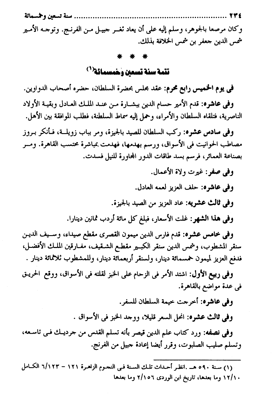 وَكَانَ مرصعا بالجوهر وَسلم إِلَيْهِ على أَن يُعَاد ثغر جبيل من الفرنج. وَتوجه الْأَمِير شمس الدّين جَعْفَر بن شمس الْخلَافَة بذلك. سنة تسعين وَخَمْسمِائة تَتِمَّة سنة تسعين وَخَمْسمِائة فِي يَوْم الْخَمِيس رَابِع محرم: عقد مجْلِس بِحَضْرَة السُّلْطَان حَضَره أَصْحَاب الدَّوَاوِين. وَفِي عاشره: قدم الْأَمِير حسام الدّين بِبِشَارَة من عِنْد الْملك الْعَادِل وَبَقِيَّة الْأَوْلَاد الناصرية فَتَلقاهُ السُّلْطَان والأمراء وَحمل إِلَيْهِ سماط السلطنة فَطلب الْمُوَافقَة بَين الْأَهْل. وَفِي سادس عشره: ركب السُّلْطَان للصَّيْد بالجيزة وَمر بِبَاب زويلة فَأنْكر بروز مصاطب الحوانيت فِي الْأَسْوَاق ورسم بهدمها فهدمت بِمُبَاشَرَة محتسب الْقَاهِرَة. وَمر بصناعة العمائر فرسم بسد طلقات الدّور الْمُجَاورَة للنيل فَسدتْ. وَفِي صفر: غيرت وُلَاة الْأَعْمَال. وَفِي عاشره: حلف الْعَزِيز لِعَمِّهِ الْعَادِل. وَفِي ثَالِث عشريه: عَاد الْعَزِيز من الصَّيْد بالجيزة. وَفِي هَذَا الشَّهْر: غلت الأسعار فَبلغ كل مائَة أردب ثَمَانِينَ دِينَارا. وَفِي خَامِس عشره: قدم فَارس الدّين مَيْمُون القصري مقطع صيداء وَسيف الدّين سنقر المشطوب وشمس الدّين سنقر الْكَبِير مقطع الشقيف مفارقين الْملك الْأَفْضَل فَدفع الْعَزِيز لميمون خَمْسمِائَة دِينَار ولسنقر أَرْبَعمِائَة دِينَار وللمشطوب ثَلَاثمِائَة دِينَار. وَفِي ربيع الأول: اشْتَدَّ الْأَمر فِي للزحام على الْخبز لقلته فِي الْأَسْوَاق وَوَقع الْحَرِيق فِي عدَّة مراضع بِالْقَاهِرَةِ. وَفِي ثَالِث عشره: انحل السّعر قَلِيلا وَوجد الْخبز فِي الْأَسْوَاق. وَفِي نصفه: ورد كتاب علم الدّين قَيْصر بِأَنَّهُ تسلم الْقُدس من جرديك فِي تاسعه وتسلم صَلِيب الصلبوت وَقرر أَيْضا إِعَادَة جبيل من الفرنج.