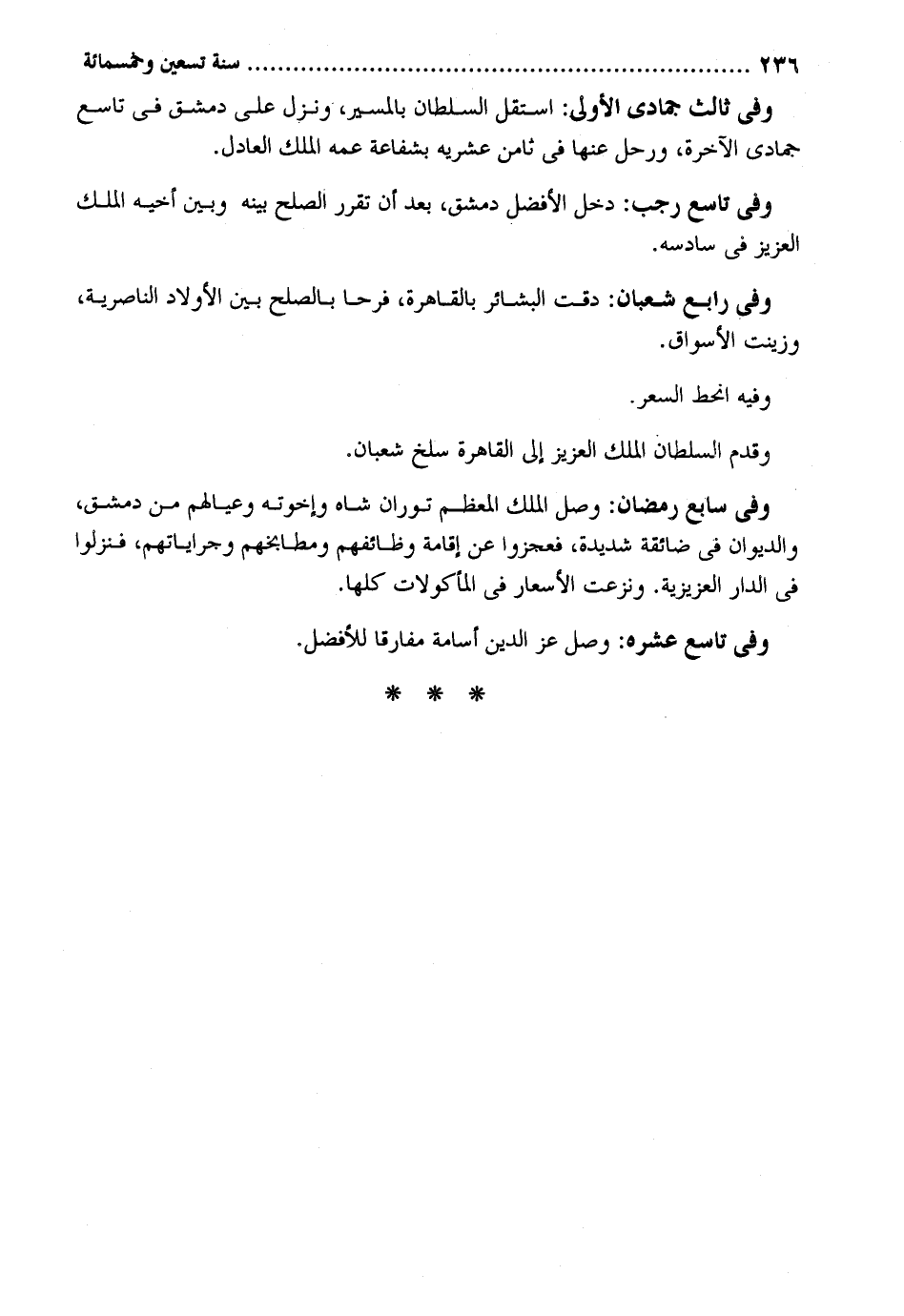 وَفِي ثَالِث جُمَادَى الأولى: اسْتَقل السُّلْطَان بِالْمَسِيرِ وَنزل على دمشق فِي تَاسِع جُمَادَى الْآخِرَة ورحل عَنْهَا فِي ثامن عشريه بشفاعة عَمه الْملك الْعَادِل. وَفِي تَاسِع رَجَب: دخل الْأَفْضَل دمشق بعد أَن تقرر الصُّلْح بَينه وبن أَخِيه الْملك الْعَزِيز فِي سادسه. وَفِي رَابِع شعْبَان: دقَّتْ البشائر بِالْقَاهِرَةِ فَرحا بِالصُّلْحِ بَين الْأَوْلَاد الناصرية وزينت الْأَسْوَاق. وَقدم السُّلْطَان الْملك الْعَزِيز إِلَى الْقَاهِرَة سلخ شعْبَان. وَفِي سَابِع رَمَضَان: وصل الْملك الْمُعظم توران شاه وَإِخْوَته وعيالهم من دمشق والديوان فِي ضائقة شَدِيدَة فعجزوا عَن إِقَامَة وظائفهم ومطابخهم وجراياتهم فنزلوا فِي الدَّار العزيزية. ونزعت الأسعار فِي المأكولات كلهَا. وَفِي تَاسِع عشره: وصل عز الدّين أُسَامَة مفارقا للأفضل.