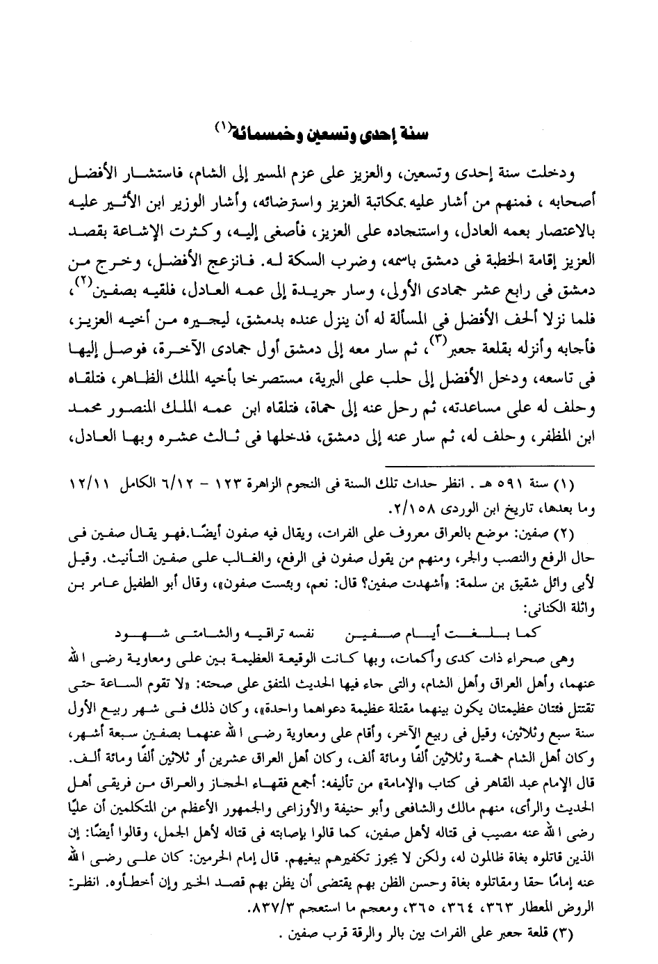 سنة إِحْدَى وَتِسْعين وَخَمْسمِائة وَدخلت سنة إِحْدَى وَتِسْعين والعزيز على عزم الْمسير إِلَى الشَّام فَاسْتَشَارَ الْأَفْضَل أَصْحَابه فَمنهمْ من أَشَارَ عَلَيْهِ بمكاتبة الْعَزِيز واسترضائه وَأَشَارَ الْوَزير ابْن الْأَثِير عَلَيْهِ بالاعتصار بِعَمِّهِ الْعَادِل واستنجاده على الْعَزِيز فأصغى إِلَيْهِ وَكَثُرت الإشاعة بِقصد الْعَزِيز إِقَامَة الْخطْبَة فِي دمشق باسمه وَضرب السِّكَّة لَهُ. فانزعج الْأَفْضَل وَخرج من دمشق فِي رَابِع عشر جُمَادَى الأولى وَسَار جَرِيدَة إِلَى عَمه الْعَادِل فَلَقِيَهُ بصفين فَلَمَّا نزلا ألحف الْأَفْضَل فِي الْمَسْأَلَة لَهُ أَن ينزل عِنْده بِدِمَشْق ليجيره من أَخِيه الْعَزِيز فَأَجَابَهُ وأنزله بقلعة جعبر ثمَّ سَار مَعَه إِلَى دمشق أول جُمَادَى الْآخِرَة فوصل إِلَيْهَا فِي تاسعه وَدخل الْأَفْضَل إِلَى حلب على الْبَريَّة مستصرخا بأَخيه الْملك الظَّاهِر فَتَلقاهُ وَحلف لَهُ على مساعدته ثمَّ رَحل عَنهُ إِلَى حماة فَتَلقاهُ ابْن عَمه الْملك الْمَنْصُور مُحَمَّد ابْن المظفر وَحلف لَهُ ثمَّ سَار عَنهُ إِلَى دمشق فَدَخلَهَا فِي ثَالِث عشره وَبهَا الْعَادِل