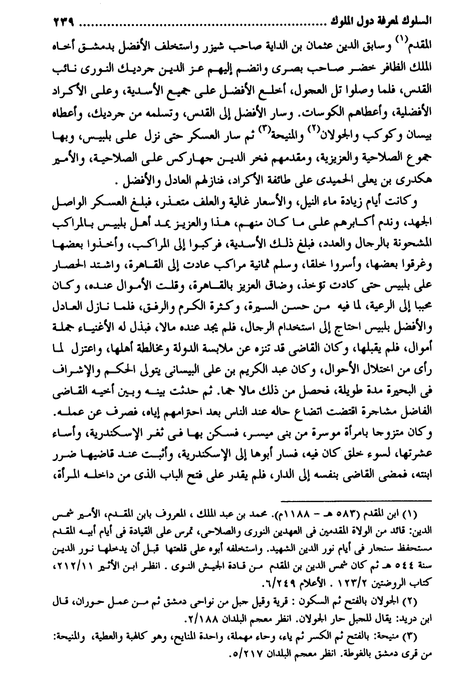 الْمُقدم وسابق الدّين عُثْمَان بن الداية صَاحب شيزر واستخلف الْأَفْضَل بِدِمَشْق أَخَاهُ الْملك الظافر خضر صَاحب بصرى وانضم إِلَيْهِم عز الدّين جرديك النوري نَائِب الْقُدس فَلَمَّا وصلوا تل العجول أَخْلَع الْأَفْضَل على جَمِيع الأَسدِية وعَلى الأكراد الْأَفْضَلِيَّة وَأَعْطَاهُمْ الكوسات. وَسَار الْأَفْضَل إِلَى الْقُدس وتسلمه من جرديك وَأَعْطَاهُ بيسان وكوكب والجولان والمنيحة ثمَّ سَار الْعَسْكَر حَتَّى نزل على بلبيس وَبهَا جموع الصلاحية والعزيزية ومقدمهم فَخر الدّين جهاركس على الصلاحية والأمير هكدري ابْن يعلي الْحميدِي على طَائِفَة الأكراد فنازلهم الْعَادِل وَالْأَفْضَل. وَكَانَت أَيَّام زِيَادَة مَاء النّيل والأسعار غَالِيَة والعلف مُتَعَذر فَبلغ الْعَسْكَر الْوَاصِل الْجهد وَنَدم أكابرهم على مَا كَانَ مِنْهُم هَذَا والعزيز يمد أهل بلبيس بالمراكب المشحونة بِالرِّجَالِ وَالْعدَد فَبلغ ذَلِك الأَسدِية فَرَكبُوا إِلَى المراكب وَأخذُوا بَعْضهَا وغرقوا بَعْضهَا وأسروا خلقا وَسلم ثَمَانِيَة مراكب عَادَتْ إِلَى الْقَاهِرَة وَاشْتَدَّ الحصارعلى بلبيس حَتَّى كَادَت تُؤْخَذ وضاق الْعَزِيز بِالْقَاهِرَةِ وَقلت الْأَمْوَال عِنْده وَكَانَ محببا إِلَى الرّعية لما فِيهِ من حسن السِّيرَة وَكَثْرَة الْكَرم والرفق فَلَمَّا نَازل الْعَادِل وَالْأَفْضَل بلبيس احْتَاجَ إِلَى اسْتِخْدَام الرِّجَال فَلم يجد عِنْده مَالا فبذل لَهُ الْأَغْنِيَاء جملَة أَمْوَال فَلم يقبلهَا وَكَانَ القَاضِي قد تنزه عَن مُلَابسَة الدولة ومخالطة أَهلهَا وَاعْتَزل لما رأى من اختلال الْأَحْوَال وَكَانَ عبد الْكَرِيم بن عَليّ البيساني يتَوَلَّى الحكم والإشراف فِي الْبحيرَة مُدَّة طَوِيلَة فَحصل من ذَلِك مَالا جما. ثمَّ حدثت بَينه وَبَين أَخِيه القَاضِي الْفَاضِل مشاجرة اقْتَضَت اتضاع حَاله عِنْد النَّاس بعد احترامهم إِيَّاه فصرف عَن عمله. وَكَانَ متزوجا بِامْرَأَة موسرة من بنى ميسر فسكن بهَا فِي ثغر الْإسْكَنْدَريَّة وأساء عشرتها لسوء خلق كَانَ فِيهِ فَسَار أبرها إِلَى الْإسْكَنْدَريَّة وَأثبت عِنْد قاضيها ضَرَر ابْنَته فَمضى القَاضِي بِنَفسِهِ إِلَى الدَّار فَلم يقدر على فتح الْبَاب الَّذِي من دَاخله الْمَرْأَة