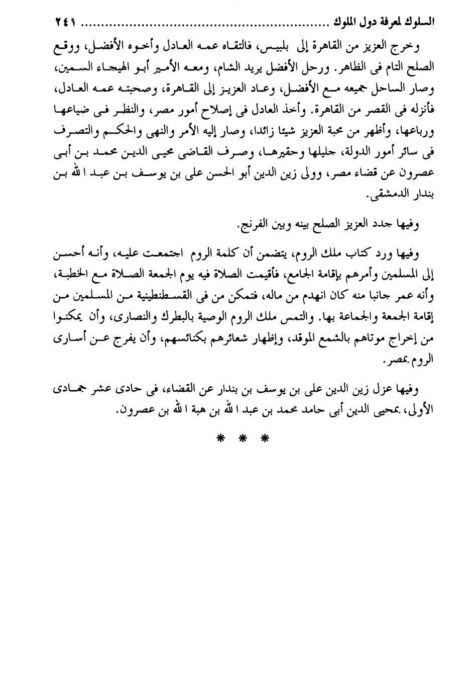 وَخرج الْعَزِيز من الْقَاهِرَة إِلَى بلبيس فالتقاه عَمه الْعَادِل وَأَخُوهُ الْأَفْضَل وَوَقع الصُّلْح التَّام فِي الظَّاهِر. ورحل الْأَفْضَل يُرِيد الشَّام وَمَعَهُ الْأَمِير أَبُو الهيجاء السمين وَصَارَ السَّاحِل جَمِيعه مَعَ الْأَفْضَل وَعَاد الْعَزِيز إِلَى الْقَاهِرَة وصحبته عَمه الْعَادِل فأنزله فِي الْقصر من الْقَاهِرَة. وَأخذ الْعَادِل فِي إصْلَاح أُمُور مصر وَالنَّظَر فِي ضياعها ورباعها وَأظْهر من محبَّة الْعَزِيز شَيْئا زَائِدا وَصَارَ إِلَيْهِ الْأَمر وَالنَّهْي وَالْحكم وَالتَّصَرُّف فِي سَائِر أُمُور الدولة جليلها وحقيرها وَصرف القَاضِي محيي الدّين مُحَمَّد بن أبي عصرون عَن قَضَاء مصر وَولى زين الدّين أَبُو الْحسن عَليّ بن يُوسُف بن عبد الله بن بنْدَار الدِّمَشْقِي. وفيهَا جدد الْعَزِيز الصُّلْح بَينه وَبَين الفرنج. وفيهَا ورد كتاب ملك الرّوم يتَضَمَّن أَن كلمة الرّوم اجْتمعت عَلَيْهِ وَأَنه أحسن إِلَى الْمُسلمين وَأمرهمْ بِإِقَامَة الْجَامِع فأقيمت الصَّلَاة فِيهِ يَوْم الْجُمُعَة الصَّلَاة مَعَ الْخطْبَة وَأَنه عمر جانبا مِنْهُ كَانَ انْهَدم من مَاله فَتمكن من فِي الْقُسْطَنْطِينِيَّة من الْمُسلمين من إِقَامَة الْجُمُعَة وَالْجَمَاعَة بهَا. وَالْتمس ملك الرّوم الْوَصِيَّة بالبطرك وَالنَّصَارَى وَأَن يمكنوا من إِخْرَاج موتاهم بالشمع الموقد وفيهَا عزل زين الدّين عَليّ بن يُوسُف بن بنْدَار عَن الْقَضَاء فِي حادي عشر جُمَادَى الأولى بمحيي الدّين أبي حَامِد مُحَمَّد بن عبد الله بن هبة الله بن عصرون.