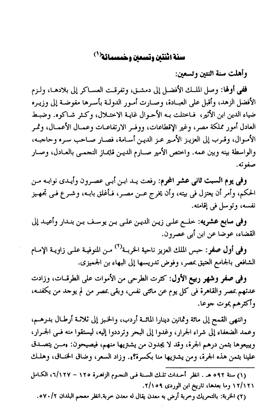 وأهلت سنة اثْنَتَيْنِ وَتِسْعين: فَفِي أَولهَا: وصل الْملك الْأَفْضَل إِلَى دمشق وَتَفَرَّقَتْ العساكر إِلَى بلادها وَلزِمَ الْأَفْضَل الزّهْد وَأَقْبل على الْعِبَادَة وَصَارَت أُمُور الدولة بأسرها مفوضة إِلَى وزيره ضِيَاء الدّين ابْن الْأَثر فاختلت بِهِ الْأَحْوَال غَايَة الاختلال وَكثر شاكوه. وَضبط الْعَادِل أُمُور مملكة مصر وَغير الإقطاعات ووفر الارتفاعات وعمال الْأَعْمَال وثمر الْأَمْوَال وَقرب إِلَى الْعَزِيز الْأَمِير عز الدّين أُسَامَة فَصَارَ صَاحب سره وحاجبه والواسطة بَينه وَبَين عَمه. واختص الْأَمِير صارم الدّين قايماز النجمي بالعادل وَصَارَ صفوته. وَفِي يَوْم السبت ثَانِي عشر الْمحرم: رفعت يَد ابْن أبي عصرون وأيدي نوابه من الحكم وَأمر أَن يعتزل فِي بَيته وَأَن يخرج عَن مصر فأغلق بَابه وَشرع فِي تجهيز نَفسه وتوسل فِي إِقَامَته. وَفِي سَابِع عشريه: خلع عَليّ زين الدّين عَليّ بن يُوسُف بن بنْدَار وأعيد إِلَى الْقَضَاء عوضا وَفِي أول صفر: حبس الْملك الْعَزِيز نَاحيَة الخربة من المنوفية على زَاوِيَة الإِمَام الشَّافِعِي بالجامع العميق بِمصْر وَفرض تدريسها إِلَى الْبَهَاء بن الجميزي. وَفِي صفر وَشهر ربيع الأول: كثرت الطرحى من الْأَمْوَات على الطرقات وزادت عدتهمْ بِمصْر والقاهرة فِي كل يَوْم عَن مِائَتي نفس وَبَقِي بِمصْر من لم يُوجد من يُكَفِّنهُ وَأَكْثَرهم يَمُوت جوعا. وانْتهى الْقَمْح إِلَى مائَة وَثَمَانِينَ دِينَارا الْمِائَة أردب وَالْخبْز إِلَى ثَلَاثَة أَرْطَال بدرهم وَعمد الضُّعَفَاء إِلَى شِرَاء الجرار وغدوا إِلَى الْبَحْر وترددوا إِلَيْهِ ليستقوا مِنْهُ فِي الجرار ويبيعوها بِثمن دِرْهَم الجرة وَقد لَا يَجدونَ من يَشْتَرِيهَا مِنْهُم فيصيحون: من يتَصَدَّق علينا بِثمن هَذِه الجرة وَمن يَشْتَرِيهَا منا بكسرة. وَزَاد السّعر وضاق الخناق وَهلك