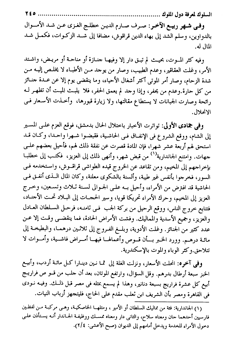 وَفِي شهر ربيع الآخر: صرف صارم الدّين خطلج الْغَزِّي عَن شدّ الْأَمْوَال بالدواوين وَسلم الشد إِلَى بهاء الدّين قراقوش مُضَافا إِلَى شدّ الزكوات فكمل شدّ المَال لَهُ. وَفِيه كثر الْمَوْت بِحَيْثُ لم تبْق دَار إِلَّا وفيهَا جَنَازَة أَو مناحة أَو مَرِيض وَاشْتَدَّ الْأَمر وغلت العقاقير وَعدم الطَّبِيب وَصَارَ من يُوجد من الْأَطِبَّاء لَا يخلص إِلَيْهِ من شدَّة الزحام وَصَارَ أَمر الْمَوْتَى أكئر أشغال الْأَحْيَاء وَمَا يَنْقَضِي يَوْم إِلَّا عَن عدَّة جنائز من كل حارة. وَعدم من يحْفر وَإِذا وجد لم يعمق الْحفر فَلَا يلبث الْمَيِّت أَن تظهر لَهُ رَائِحَة وَصَارَت الجبانات لَا يُسْتَطَاع مقالتها وَلَا زِيَارَة قبورها وَأخذت الأسعار فِي الانحلال. وَفِي جُمَادَى الأولى: تَوَاتَرَتْ الْأَخْبَار باختلال الْحَال بِدِمَشْق فَوَقع الْعَزْم على الْمسير إِلَى الشَّام وَوَقع الشُّرُوع فِي الْإِنْفَاق فِي الْحَاشِيَة فقبضوا شهرا وَاحِدًا وَكَانَ قد اسْتحق لَهُم أَرْبَعَة عشر شهرا فَإِن الْمَادَّة قصرت عَن نَفَقَة ذَلِك لَهُم فأحيل بَعضهم على جِهَات. وَامْتنع الجاندارية من قبض شهر وأنهى ذَلِك إِلَى الْعَزِيز فَكتب إِلَى خطلبا بإخراجهم إِلَى المخيم وَمن تقاعد عَن الْخُرُوج قَيده الطواشي قراقوش واستخدمه فِي السُّور فَخَرجُوا بأنفس غير طيبَة وألسنة بالشكوى معلنة وَكَاد المَال الَّذِي أنْفق فِي الْحَاشِيَة قد افْترض من الْأُمَرَاء وأحيل بِهِ على الجوالي لسنة ثَلَاث وَتِسْعين وَخرج الْعَزِيز إِلَى المخيم وحرك الْأُمَرَاء تحريكا قَوِيا وسير الحجات إِلَى الْبِلَاد تَحت الأجناد فتتابع خُرُوج النَّاس وَوَقع الرحيل من بركَة الْجب فِي ثامنه فَرَحل السُّلْطَان الْعَادِل والعزيز وَجَمِيع الأَسدِية والمماليك. وفشت الْأَمْرَاض الحادة فَمَا يَنْقَضِي وَقت إِلَّا عَن عدد كثير من الْجَنَائِز. وغلت الْأَدْوِيَة وَبلغ الْفروج إِلَى ثَلَاثِينَ درهما والبطيخة إِلَى مائَة دِرْهَم. وَورد الْخَبَر بِأَن قوص وأعمالها فِيهَا أمراض فَاشِية وأموات لَا تتلاحق. وَكثر الوباء وَالْمَوْت بالإسكندرية. وَفِي آخِره: انْحَلَّت الأسعار وَنزلت الْغلَّة إِلَى ثَمَانِينَ دِينَارا كل مائَة أردب وأبيع الْخبز سَبْعَة أَرْطَال بدرهم. وَقل السُّؤَال وارتفع الموتان بعد أَن جلب من قو ص فراريج أبيع كل عشرَة فراريج بسبعة دَنَانِير وَهَذَا لم يسمع بِمثلِهِ فِي مصر قبل ذَلِك. وَفِيه نُودي فِي الْقَاهِرَة ومصر بِأَن الشريف ابْن ثَعْلَب مقدم على الْحَاج فليتجهز أَرْبَاب النيات.
