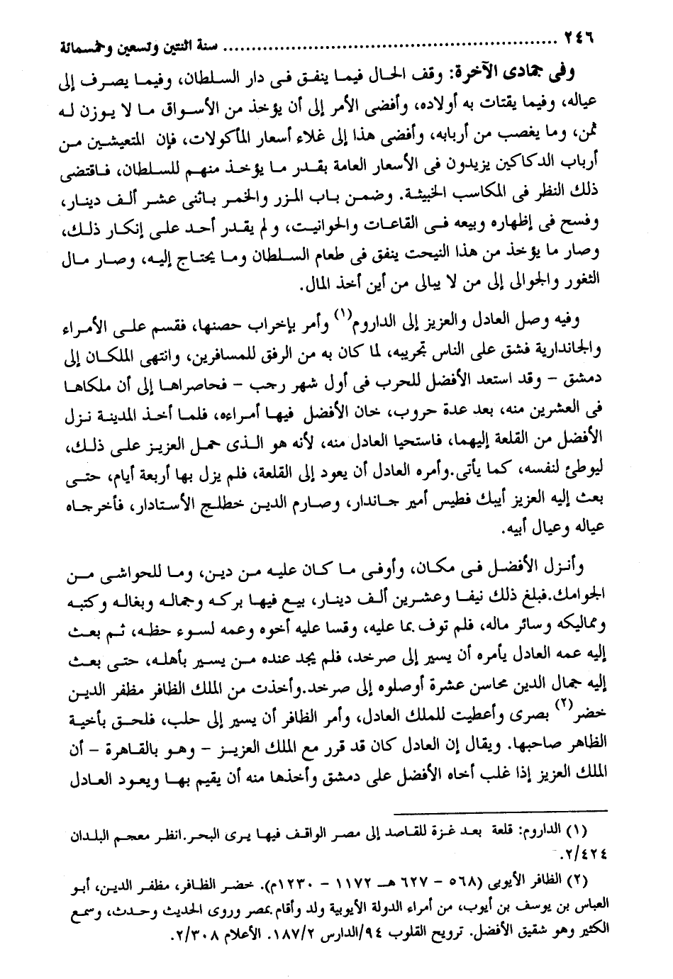 وَفِي جُمَادَى الْآخِرَة: وقف الْحَال فِيمَا ينْفق فِي دَار السُّلْطَان وَفِيمَا يصرف إِلَى عِيَاله وَفِيمَا يقتات بِهِ أَوْلَاده وأفضى الْأَمر إِلَى أَن يُؤْخَذ من الْأَسْوَاق مَا لَا يُوزن لَهُ ثمن وَمَا يغصب من أربابه وأفض هَذَا إِلَى غلاء أسعار المأكولات فَإِن المتعيشين من أَرْبَاب الدكاكين يزِيدُونَ فِي الأسعار الْعَامَّة بِقدر مَا يُؤْخَذ مِنْهُم للسُّلْطَان فَاقْتضى ذَلِك النّظر فِي المكاسب الخبيثة. وَضمن بَاب المزر وَالْخمر بِاثْنَيْ عشر ألف دِينَار وفسح فِي إِظْهَاره وَبيعه فِي القاعات والحوانيت وَلم يقدر أحد على إِنْكَار ذَلِك وَصَارَ مَا يُؤْخَذ من هَذَا النيحت ينْفق فِي طَعَام السُّلْطَان وَمَا يحْتَاج إِلَيْهِ وَصَارَ مَال الثغور والجوالي إِلَى من لَا يُبَالِي من أَيْن أَخذ المَال. وَفِيه وصل الْعَادِل والعزيز إِلَى الداروم وَأمر بإخراب حصنها فقسم على الْأُمَرَاء والجاندارية فشق على النَّاس تجريبه لما كَانَ بِهِ من الرِّفْق للمسافرين وانْتهى الْملكَانِ إِلَى دمشق وَقد استعد الْأَفْضَل للحرب فِي أول شهر رَجَب فحاصراها إِلَى أَن ملكاها فِي الْعشْرين مِنْهُ بعد عدَّة حروب خَان الْأَفْضَل فِيهَا أمراءه فَلَمَّا أَخذ الْمَدِينَة نزل الْأَفْضَل من القلعة إِلَيْهِمَا فاستحيا الْعَادِل مِنْهُ لِأَنَّهُ هُوَ الَّذِي حمل الْعَزِيز على ذَلِك ليوطيء لنَفسِهِ كَمَا يَأْتِي. وَأمره الْعَادِل أَن يعود إِلَى القلعة فَلم يزل بهَا أَرْبَعَة أَيَّام حَتَّى بعث إِلَيْهِ الْعَزِيز أيبك فطيس أَمِير جاندار وصارم الدّين خطلج الأستادار فأخرجاه عِيَاله وعيال أَبِيه. وَأنزل الْأَفْضَل فِي مَكَان وأوفي مَا كَانَ عَلَيْهِ من دين وَمَا للحواشي من الجوامك. فَبلغ ذَلِك نيفا وَعشْرين ألف دِينَار بيع فِيهَا بركه وجماله وبغاله وَكتبه ومماليكه وَسَائِر مَاله فَلم توف بِمَا عَلَيْهِ وقسا عَلَيْهِ أَخُوهُ وَعَمه لسوء حَظه ثمَّ بعث إِلَيْهِ عَمه الْعَادِل يَأْمُرهُ أَن يسير إِلَى صرخد فَلم يجد عِنْده من يسير بأَهْله حَتَّى بعث إِلَيْهِ جمال الدّين محَاسِن عشرَة أوصلوه إِلَى صرخد. وَأخذت من الْملك الظافر مظفر الدّين خضر بصرى وَأعْطيت للْملك الْعَادِل وَأمر الظافر أَن يسير إِلَى حلب فلحق بأَخيه الظَّاهِر صَاحبهَا. وَيُقَال إِن الْعَادِل كَانَ قد قرر مَعَ الْملك الْعَزِيز وَهُوَ بِالْقَاهِرَةِ أَن الْملك الْعَزِيز إِذا غلب أَخَاهُ الْأَفْضَل على دمشق وَأَخذهَا مِنْهُ أَن يُقيم بهَا وَيعود الْعَادِل