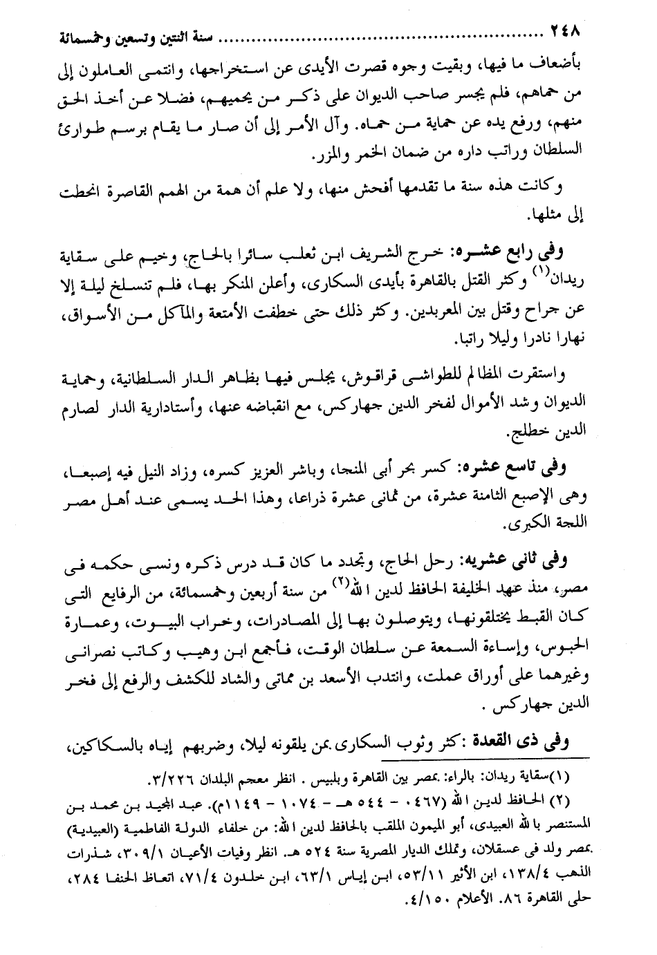 بأضعاف مَا فِيهَا وَبقيت وُجُوه قصرت الْأَيْدِي عَن استخراجها وانتمى الْعَامِلُونَ إِلَى من حماهم فَلم يَجْسُر صَاحب الدِّيوَان على ذكر من بحميهم فضلا عَن أَخذ الْحق مِنْهُم وَرفع يَده عَن حماية من حماه. وَآل الْأَمر إِلَى أَن صَار مَا يُقَام برسم طوارئ السُّلْطَان وراتب دَاره من ضَمَان الْخمر والمزر. وَكَانَت هَذِه سنة مَا تقدمها أفحش مِنْهَا وَلَا علم أَن همة من الهمم القاصرة انحطت إِلَى مثلهَا. وَفِي رَابِع عشره: خرج الشريف ابْن ثَعْلَب سائرا بالحاج وخيم على سِقَايَة ريدان وَكثر الْقَتْل بِالْقَاهِرَةِ بأيدي السكارى وأعلن الْمُنكر بهَا فَلم تنسلخ لَيْلَة إِلَّا عَن جراح وَقتل بَين المعربدين. واستقرت الْمَظَالِم للطواشي قراقوش يجلس فِيهَا بِظَاهِر الدَّار السُّلْطَانِيَّة وحماية الدِّيوَان وَشد الْأَمْوَال لفخرالدين جهاركس مَعَ انقباضه عَنْهَا وأستادارية الدَّار لصارم الدّين خطلج. وَفِي تَاسِع عشره: كسر بَحر أبي المنجا وباشر الْعَزِيز كَسره وَزَاد النّيل فِيهِ إصبعا وَهِي الإصبع الثَّامِنَة عشرَة من ثَمَانِي عشرَة ذِرَاعا وَهَذَا الْحَد يُسمى عِنْد أهل مصر اللجة الْكُبْرَى. وَفِي ثَانِي عشريه: رَحل الْحَاج وتجدد مَا كَانَ قد درس ذكره وَنسي حكمه فِي مصر مُنْذُ عهد الْخَلِيفَة الْحَافِظ لدين الله من سنة أَرْبَعِينَ وَخَمْسمِائة من الرفايع الَّتِي كَانَ القبط يختلقونها ويتوصلون بهَا إِلَى المصادرات وخراب الْبيُوت وَعمارَة الحبوس وإساءة السمعة عَن سُلْطَان الْوَقْت فأجمع ابْن وهيب وَكَاتب نَصْرَانِيّ وَغَيرهمَا على أوراق عملت وانتدب الأسعد بن مماتي والشاد للكشف وَالرَّفْع إِلَى فَخر الدّين جهاركس. وَفِي ذِي الْقعدَة: كثر وثوب السكارى بِمن يلقونه لَيْلًا وضربهم إِيَّاه بالسكاكين