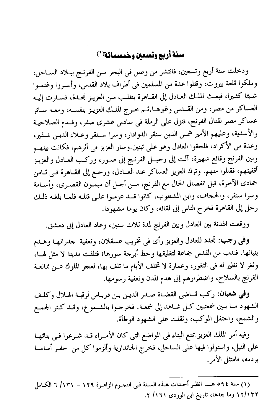 سنة أَربع وَتِسْعين وَخَمْسمِائة وَدخلت سنة أَربع وَتِسْعين فانتشر من وصل فِي الْبَحْر من الفرنج بِبِلَاد السَّاحِل وملكوا قلعة بيروت وَقتلُوا عدَّة من الْمُسلمين فِي أَطْرَاف بِلَاد الْقُدس وأسروا وغنموا شَيْئا كثيرا فَبعث الْملك الْعَادِل إِلَى الْقَاهِرَة يطْلب من الْعَزِيز نجدة فسارت إِلَيْهِ العساكر من مصر وَمن الْقُدس وَغَيرهَا. ثمَّ خرج الْملك الْعَزِيز بِنَفسِهِ وَمَعَهُ سَائِر عَسَاكِر مصر لقِتَال الفرنج فَنزل على الرملة فِي سادس عشري صفر وَقدم الصلاحية والأسدية وَعَلَيْهِم الْأَمِير شمس الدّين سنقر الدوادار وسرا سنقر وعلاء الدّين شقير وعدة من الأكراد فَلَحقُوا الْعَادِل وَهُوَ على تبنين. وَسَار الْعَزِيز فِي أَثَرهم فَكَانَت بَينهم وَبَين الفرنج وقائع شهيرة آلت إِلَى رحيل الفرنج إِلَى صور وَركب الْعَادِل والعزيز أقفيتهم فَقتلُوا مِنْهُم. وَترك الْعَزِيز العساكر عِنْد الْعَادِل وَرجع إِلَى الْقَاهِرَة فِي ثامن جُمَادَى الْآخِرَة قبل انْفِصَال الْحَال مَعَ الفرنج من أجل أَن مَيْمُون القصري وَأُسَامَة وسرا سنقر والحجاف وَابْن المشطوب كَانُوا قد عزموا على قَتله فَلَمَّا بلغه ذَلِك رَحل إِلَى الْقَاهِرَة فَخرج النَّاس إِلَى لِقَائِه وَكَانَ يَوْمًا مشهودا. وَوَقعت الْهُدْنَة بَين الْعَادِل وَبَين الفرنج سنة ثَلَاث سِنِين وَعَاد الْعَادِل إِلَى دمشق. وَفِي رَجَب: تجدّد للعادل والعزيز رَأْي فِي تخريب عسقلان وتعفية جدرانها وَهدم بنيانها. فندب من الْقُدس جمَاعَة لتغليقها وَحط أبرجة سورها فَتلفت مَدِينَة لَا مثل لَهَا وثغر لَا نَظِير لَهُ فِي الثغور وَعمارَة لَا تخلف الْأَيَّام مَا تلف بهَا لعجز الْمُلُوك عَن ممانعة الفرنج بِالسِّلَاحِ واضطرارهم إِلَى هدم المدن وتعفية رسومها. وَفِي شعْبَان: ركب قَاضِي الْقُضَاة صدر الدّين بن درباس لرقبة الْهلَال وكلف الشُّهُود مَا بَين شمعتي كل شَاهد إِلَى شمعة. فَخَرجُوا بالشموع وَقد كثر الْجمع والشمع واحتفل الموكب وثقلت على الشُّهُود الْوَطْأَة. وَفِيه أَمر الْملك الْعَزِيز بِمَنْع الْبناء فِي الْمَوَاضِع الَّتِي كَانَ الْأُمَرَاء قد شرعوا فِي بنائها على النّيل واستولوا فِيهَا على السَّاحِل فَخرج الجاندارية وألزموا كل من حفر أساسا بردمه فامتثل الْأَمر.