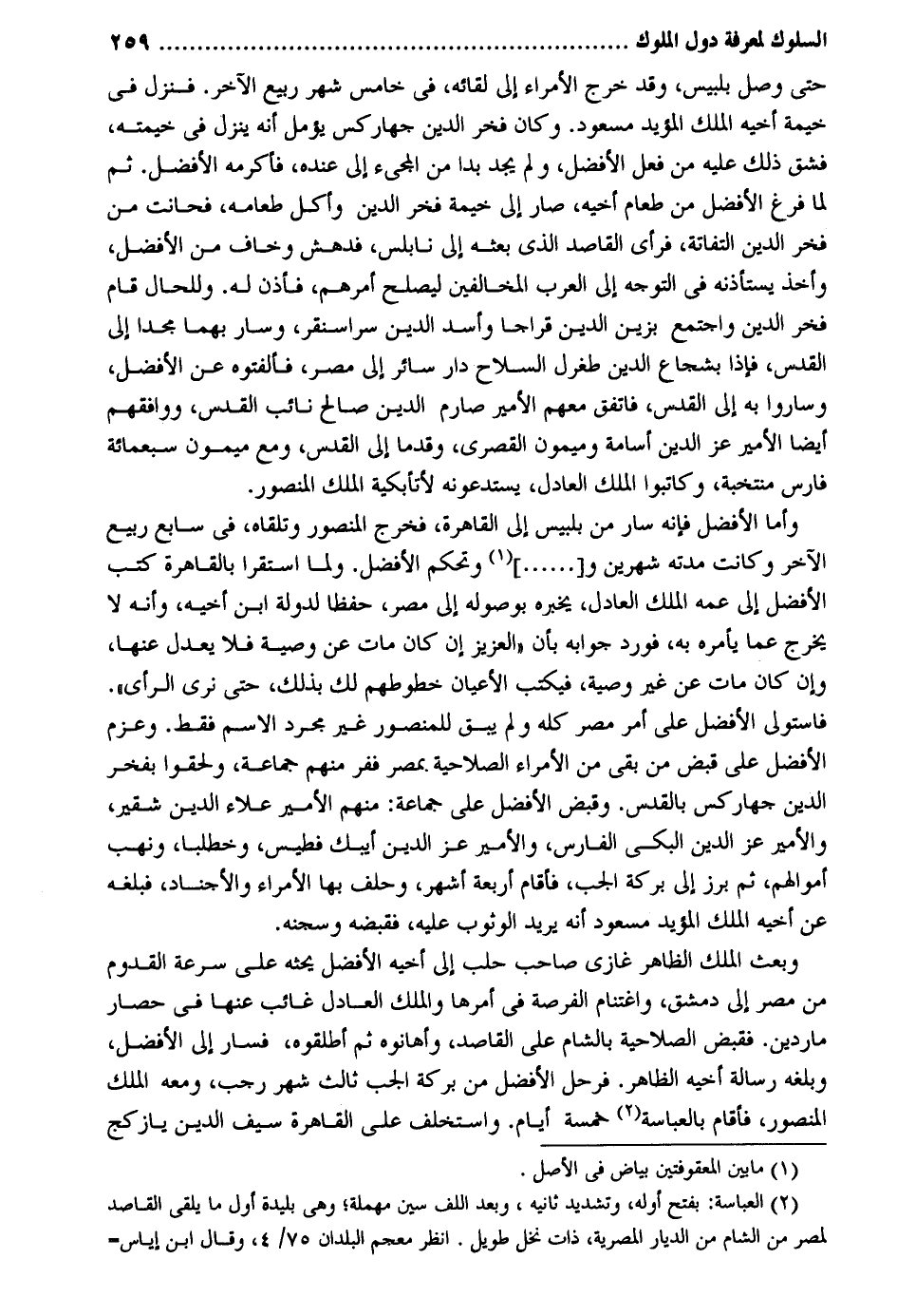 حَتَّى وصل بلبيس وَقد خرج الْأُمَرَاء إِلَى لِقَائِه فِي خَامِس شهر ربيع الآخر. فَنزل فِي خيمة أَخِيه الْملك الْمُؤَيد مَسْعُود. وَكَانَ فَخر الدّين جهاركس يؤمل أَنه ينزل فِي خيمته فشق ذَلِك عَلَيْهِ من فعل الْأَفْضَل وَلم يجد بدا من المجىء إِلَى عِنْده فَأكْرمه الْأَفْضَل. ثمَّ لما فرغ الْأَفْضَل من طَعَام أَخِيه صَار إِلَى خيمة فَخر الدّين وَأكل طَعَامه فحانت من فَخر الدّين التفاتة فَرَأى القاصد الَّذِي بَعثه إِلَى نابلس فدهش وَخَافَ من الْأَفْضَل وَأخذ يَسْتَأْذِنهُ فِي التَّوَجُّه إِلَى الْعَرَب الْمُخَالفين ليصلح أَمرهم فَأذن لَهُ. وللحال قَامَ فَخر الدّين وَاجْتمعَ بزين الدّين قراجا وَأسد الدّين سراسنقر وَسَار بهما مجداً إِلَى الْقُدس فَإِذا بِشُجَاعٍ الدّين طغرل السِّلَاح دَار سَائِر إِلَى مصر فألفتوه عَن الْأَفْضَل وَسَارُوا بِهِ إِلَى الْقُدس فاتفق مَعَهم الْأَمر صارم الدّين صَالح نَائِب الْقُدس وَوَافَقَهُمْ أَيْضا الْأَمِير عز الدّين أُسَامَة وَمَيْمُون الْقصرى وقدما إِلَى الْقُدس وَمَعَ مَيْمُون سَبْعمِائة فَارس منتخبة وكاتبوا الْملك الْعَادِل يستدعونه لأتابكية الْملك الْمَنْصُور. وَأما الْأَفْضَل فَإِنَّهُ سَار من بلبيس إِلَى الْقَاهِرَة فَخرج الْمَنْصُور وتلقاه فِي سَابِع ربيع الآخر وَكَانَت مدَّته شَهْرَيْن وتحكم الْأَفْضَل. وَلما استقرا بِالْقَاهِرَةِ كتب الْأَفْضَل إِلَى عَمه الْملك الْعَادِل يُخبرهُ بوصوله إِلَى مصر حفظا لدولة ابْن أَخِيه وَأَنه لَا يخرج عَمَّا يَأْمُرهُ بِهِ فورد جَوَابه بَان الْعَزِيز إِن كَانَ مَاتَ عَن وَصِيَّة فَلَا يعدل عَنْهَا وَإِن كَانَ مَاتَ عَن غير وَصِيَّة فَيكْتب الْأَعْيَان خطوطهم لَك بذلك حَتَّى نرى الرَّأْي. فاستولى الْأَفْضَل على أَمر مصر كُله وَلم يبْق للمنصور غير مُجَرّد الِاسْم فَقَط. وعزم الْأَفْضَل على قبض من بقى من الْأُمَرَاء الصلاحية. بِمصْر ففر مِنْهُم جمَاعَة وَلَحِقُوا بفخر الدّين جهاركس بالقدس. وَقبض الْأَفْضَل على جمَاعَة: مِنْهُم الْأَمِير عَلَاء الدّين شقير والأمير عز الدّين البكى الْفَارِس والأمير عز الدّين أيبك فطيس وخطلبا وَنهب أَمْوَالهم ثمَّ برز إِلَى بركَة الْجب فَأَقَامَ أَرْبَعَة أشهر وَحلف بهَا الْأُمَرَاء والأجناد مبلغه عَن أَخِيه الْملك الْمُؤَيد مَسْعُود أَنه يُرِيد الْوُثُوب عَلَيْهِ فَقَبضهُ وسجنه. وَبعث الْملك الظَّاهِر غَازِي صَاحب حلب إِلَى أَخِيه الْأَفْضَل يحثه على سرعَة الْقدوم من مصر إِلَى دمشق واغتنام الفرصة فِي أمرهَا وَالْملك الْعَادِل غَائِب عَنْهَا فِي حِصَار ماردين. فَقبض الصلاحية بِالشَّام على القاصد وأهانوه ثمَّ أَطْلقُوهُ فَسَار إِلَى الْأَفْضَل وبلغه رِسَالَة أَخِيه الظَّاهِر. فَرَحل الْأَفْضَل من بركَة الْجب ثَالِث شهر رَجَب وَمَعَهُ الْملك الْمَنْصُور فَأَقَامَ بالعباسة خَمْسَة أَيَّام. واستخلف على الْقَاهِرَة سيف الدّين يازكج