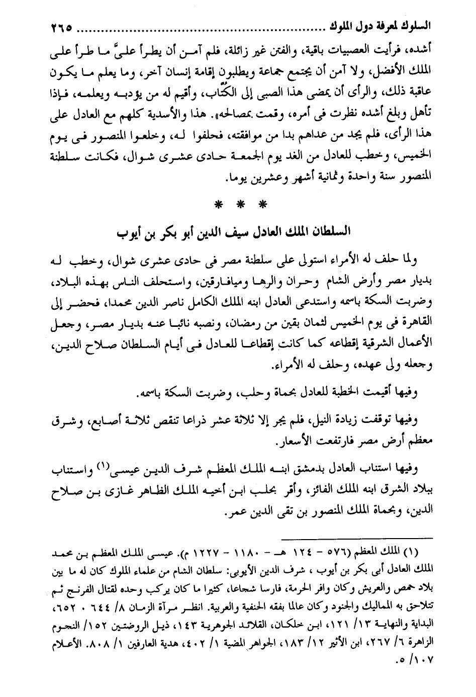 أشده فَرَأَيْت العصبيات بَاقِيَة والفتن غير زائلة فَلم آمن أَن يطْرَأ على مَا طَرَأَ على الْملك الْأَفْضَل وَلَا آمن أَن يجْتَمع جمَاعَة وَيطْلبُونَ إِقَامَة إِنْسَان آخر وَمَا يعلم مَا يكون عَاقِبَة ذَلِك والرأي أَن يمْضِي هَذَا الصَّبِي إِلَى الْكتاب وأقيم لَهُ من يؤدبه ويعلمه فَإِذا تأهل وَبلغ أشده نظرت فِي أمره وَقمت بمصالحه. هَذَا والأسدية كلهم مَعَ الْعَادِل على هَذَا الرَّأْي فَلم يجد من عداهم بدا من مُوَافَقَته فَحَلَفُوا لَهُ وخلعوا الْمَنْصُور فِي يَوْم الْخَمِيس وخطب للعادل من الْغَد يَوْم الْجُمُعَة حادي عشرى شَوَّال فَكَانَت سلطنة الْمَنْصُور سنة وَاحِدَة وَثَمَانِية أشهر وَعشْرين يَوْمًا. السُّلْطَان سيف الدّين أَبُو بكر بن أَيُّوب السُّلْطَان الْملك الْعَادِل سيف الدّين أَبُو بكر بن أَيُّوب وَلما حلف لَهُ الْأُمَرَاء استولى على سلطنة مصر فِي حادي عشرى شَوَّال وخطب لَهُ بديار مصر وَأَرْض الشَّام وحران والرها وميافارقن واستحلف النلس بِهَذِهِ الْبِلَاد وَضربت السِّكَّة باسمه واستدعى الْعَادِل ابْنه الْملك الْكَامِل نَاصِر الدّين مُحَمَّدًا فَحَضَرَ إِلَى الْقَاهِرَة فِي يَوْم الْخَمِيس لثمان بَقينَ من رَمَضَان ونصبه نَائِبا عَنهُ بديار مصر وَجعل الْأَعْمَال الشرقية إقطاعه كَمَا كَانَت إقطاعاً للعادل فِي أَيَّام السُّلْطَان صَلَاح الدّين وَجعله ولي عَهده وَحلف لَهُ الْأُمَرَاء. وفيهَا أُقِيمَت الْخطْبَة للعادل بحماة وحلب وَضربت السِّكَّة باسمه. وفيهَا توقفت زِيَادَة النّيل فَلم يجر إِلَّا ثَلَاثَة عشر ذِرَاعا تنقص ثَلَاثَة أَصَابِع وشرق مُعظم أَرض مصر فارتفعت الأسعار. وفيهَا استناب الْعَادِل بِدِمَشْق ابْنه الْملك الْمُعظم شرف الدّين عِيسَى واستناب بِبِلَاد الشرق ابْنه الْملك الفائز وَأقر بحلب ابْن أَخِيه الْملك الظَّاهِر غَازِي بن صَلَاح الدّين وبحماة الْملك الْمَنْصُور بن تَقِيّ الدّين عمر.
