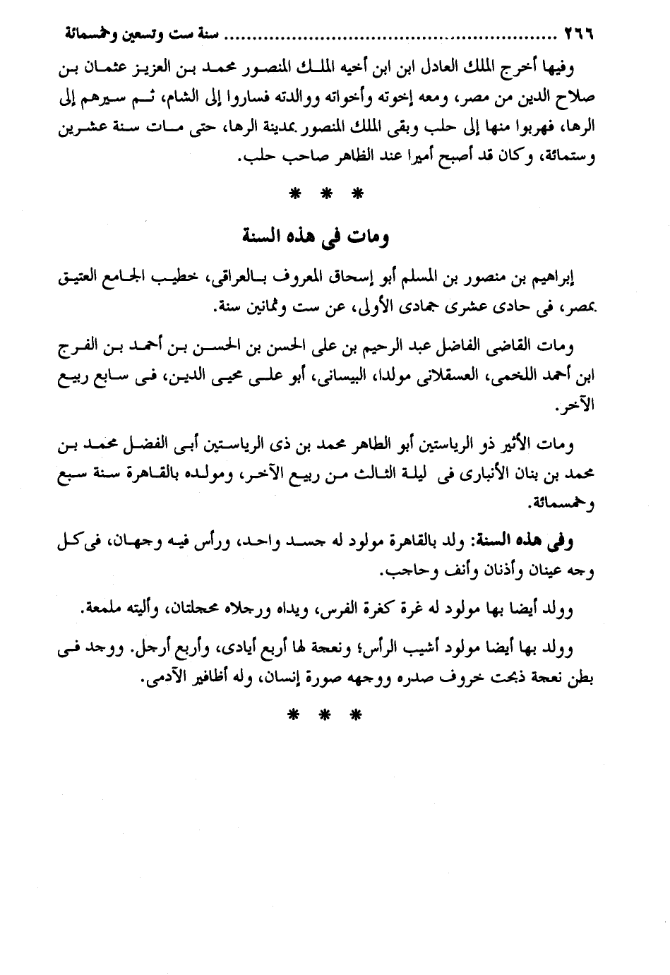 وفيهَا أخرج الْملك الْعَادِل ابْن ابْن أَخِيه الْملك الْمَنْصُور مُحَمَّد بن الْعَزِيز عُثْمَان بن صَلَاح الدّين من مصر وَمَعَهُ إخْوَته وأخواته ووالدته فَسَارُوا إِلَى الشَّام ثمَّ سيرهم إِلَى الرها فَهَرَبُوا مِنْهَا إِلَى حلب وَبَقِي الْملك الْمَنْصُور. بِمَدِينَة الرها حَتَّى مَاتَ سنة عشْرين وسِتمِائَة وَكَانَ قد أصبح أَمِيرا عِنْد الظَّاهِر صَاحب حلب. إِبْرَاهِيم بن مَنْصُور بن الْمُسلم أَبُو إِسْحَاق الْمَعْرُوف بالعراقي خطيب الْجَامِع الْعَتِيق بِمصْر فِي حادي عشرى جُمَادَى الأولى عَن سِتّ وَثَمَانِينَ سنة. وَمَات القَاضِي الْفَاضِل عبد الرَّحِيم بن عَليّ الْحسن بن الْحسن بن أَحْمد بن الْفرج ابْن أَحْمد اللَّخْمِيّ الْعَسْقَلَانِي مولداً البيساني أَبُو عَليّ محيى الدّين فى سَابِع ربيع الآخر. وَمَات الْأَثِير ذُو الرياستين أَبُو الطَّاهِر مُحَمَّد بن ذِي الرياستين أبي الْفضل مُحَمَّد بن مُحَمَّد بن بنان الْأَنْبَارِي فِي لَيْلَة الثَّالِث من ربيع الآخر ومولده بِالْقَاهِرَةِ سنة سبع وَخَمْسمِائة. وَفِي هَذِه السّنة: ولد بِالْقَاهِرَةِ مَوْلُود لَهُ جَسَد وَاحِد وَرَأس فِيهِ وَجْهَان فى كل وَجه عينان وأذنان وأنف وحاجب. وَولد أَيْضا بهَا مَوْلُود لَهُ غرَّة كغرة الْفرس ويداه وَرجلَاهُ محجلتان وأليته مُلَمَّعَة. وَولد بهَا أَيْضا مَوْلُود أشيب الرَّأْس ونعجة لَهَا أَربع أيادي وَأَرْبع أرجل. وَوجد فِي بطن نعجة ذبحت خروف صَدره وَوَجهه صُورَة إِنْسَان وَله أظافير الْآدَمِيّ.