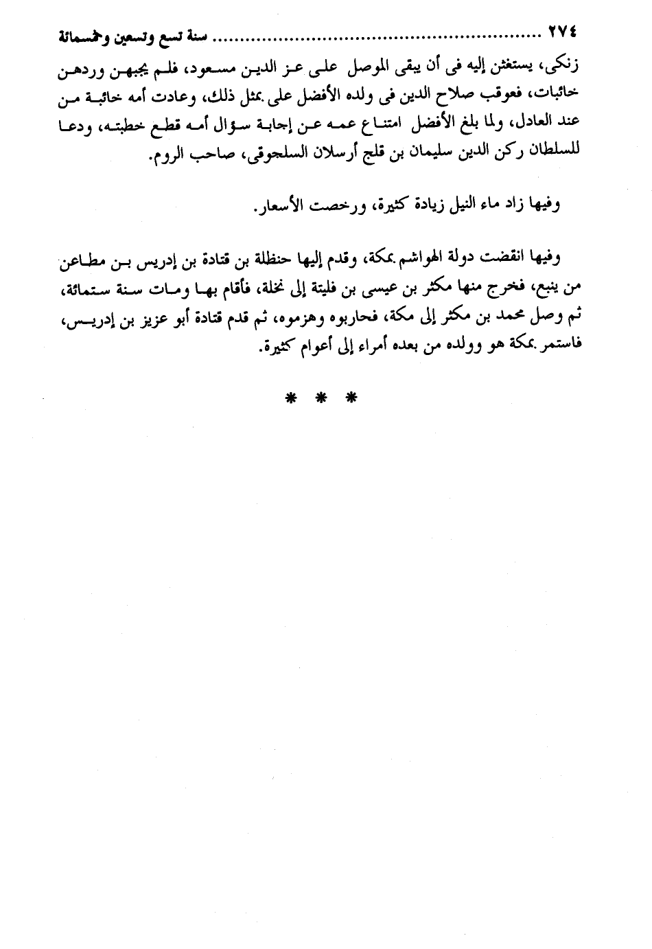 زنكى يستغثن إِلَيْهِ فى أَن يبْقى الْموصل على عز الدّين مَسْعُود فَلم يجبهن وردهن خائبات فَعُوقِبَ صَلَاح الدّين فى وَلَده الْأَفْضَل على بِمثل ذَلِك وعادت أمه خائبة من عِنْد الْعَادِل وَلما بلغ الْأَفْضَل امْتنَاع عَمه عَن إِجَابَة سُؤال أمه تُطِع خطبَته ودعا للسُّلْطَان ركن الدّين سُلَيْمَان بن قلج أرسلان السلجوقي صَاحب الرّوم. وفيهَا زَاد مَاء النّيل زِيَادَة كَثِيرَة ورخصت الأسعار. وفيهَا انْقَضتْ دولة الهواشم بِمَكَّة وَقدم إِلَيْهَا حَنْظَلَة بن قَتَادَة بن إِدْرِيس بن مطاعن من يَنْبع فَخرج مِنْهَا مكثر بن عِيسَى بن فليتة إِلَى نَخْلَة فَأَقَامَ بهَا وَمَات سنة سِتّمائَة ثمَّ وصل مُحَمَّد بن مكثر إِلَى مَكَّة فحاربوه وهزموه ثمَّ قدم قَتَادَة أَبُو عَزِيز بن إِدْرِيس فاستمر بِمَكَّة هُوَ وَولده من بعده أُمَرَاء إِلَى أَعْوَام كَثِيرَة.
