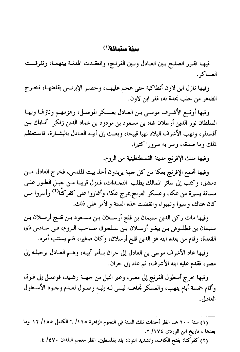 سنة سِتّمائَة فِيهَا تقرر الصُّلْح بَين الْعَادِل وَبَين الفرنج وانعقدت الْهُدْنَة بَينهمَا وَتَفَرَّقَتْ العساكر. وفيهَا نَازل ابْن لاون أنطاكية حَتَّى هجم عَلَيْهَا وَحصر الإبرنس بقلعتها فَخرج الظَّاهِر من حلب نجدة لَهُ ففر ابْن لاون. وفيهَا أوقع الْأَشْرَف مُوسَى بن الْعَادِل بعسكر الْموصل وَهَزَمَهُمْ ونازلها وَبهَا السُّلْطَان نور الدّين أرسلان شاه بن مَسْعُود بن مودود بن عماد الدّين زنكي أتابك بن آقسنقر وَنهب الْأَشْرَف الْبِلَاد نهباً قبيحاً وَبعث إِلَى أَبِيه الْعَادِل بالبشارة فاستعظم ذَلِك وَمَا صدقه وسر بِهِ سُرُورًا كثيرا. وفيهَا ملك الإفرنج مَدِينَة القسطنينية من الرّوم. وفيهَا تجمع الإفرنج بعكا من كل جِهَة يُرِيدُونَ أَخذ بَيت الْمُقَدّس فَخرج الْعَادِل من دمشق وَكتب إِلَى سَائِر الممالك يطْلب النجدات فَنزل قَرِيبا من جبل الطّور على مَسَافَة يسيرَة من عكا وعسكر الفرنج بمرج عكا وأغاروا على كفر كُنَّا وأسروا من كَانَ هُنَاكَ وَسبوا ونهبوا وَانْقَضَت هَذِه السّنة وَالْأَمر على ذَلِك. وفيهَا مَاتَ ركن الدّين سُلَيْمَان بن قلج أرسلان بن مَسْعُود بن قلج أرسلان بن سُلَيْمَان بن قطلوش بن بيغو أرسلان بن سلجوق صَاحب الرّوم فى سادس ذِي الْقعدَة وَقَامَ من بعده ابْنه وفيهَا عَاد الْأَشْرَف مُوسَى بن الْعَادِل إِلَى حران بِأَمْر أَبِيه وهم الْعَادِل برحيله إِلَى مصر فَقدم عَلَيْهِ ابْنه الْأَشْرَف ثمَّ عَاد إِلَى حران. وفيهَا خرج أسطول الفرنج إِلَى مصر وَعبر النّيل من جِهَة رشيد فوصل إِلَى فوة وَأقَام خَمْسَة أَيَّام ينهب والعسكر تجاهه لَيْسَ لَهُ إِلَيْهِ وُصُول لعدم وجود الأسطول العادلي.