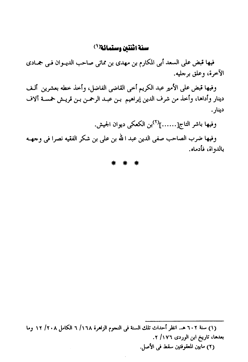 سنة اثْنَتَيْنِ وسِتمِائَة فِيهَا قبض على السعد أبي المكارم بن مهْدي بن مماتى صَاحب الدِّيوَان فِي جُمَادَى الْآخِرَة وعلق برجليه. وفيهَا قبض على الْأَمِير عبد الْكَرِيم أخي القَاضِي الْفَاضِل وَأخذ خطه بِعشْرين ألف دِينَار وأداها وَأخذ من شرف الدّين إِبْرَاهِيم بن عبد الرَّحْمَن بن قُرَيْش خَمْسَة آلَاف دِينَار. وفيهَا بَاشر التَّاج بن الكعكي ديوَان الْجَيْش. وفيهَا ضرب الصاحب صفي الدّين عبد الله بن عَليّ بن شكر الْفَقِيه نصرا فِي وَجهه بالدواة فأدماه.