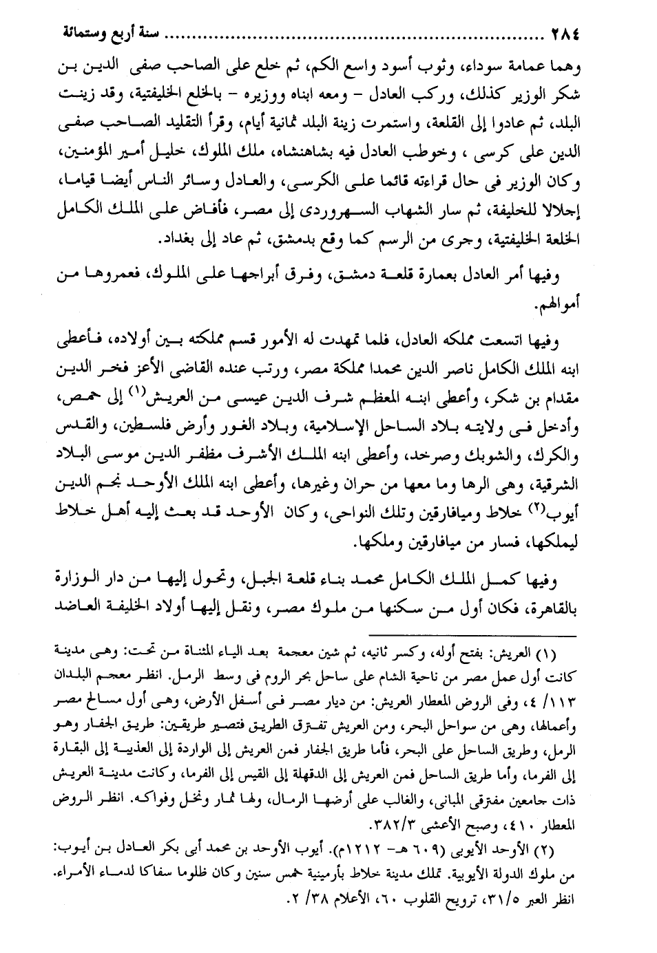 وهما عِمَامَة سَوْدَاء وثوب أسود وَاسع الْكمّ ثمَّ خلع على الصاحب صفي الدّين بن شكر الْوَزير كَذَلِك وَركب الْعَادِل - وَمَعَهُ ابناه ووزيره - بِالْخلْعِ الخليفتية وَقد زينت الْبَلَد ثمَّ عَادوا إِلَى القلعة واستمرت زِينَة الْبَلَد ثَمَانِيَة أَيَّام وَقَرَأَ التَّقْلِيد الصاحب صفي الدّين على كرْسِي وخوطب الْعَادِل فِيهِ بشاهنشاه ملك الْمُلُوك خَلِيل أَمِير الْمُؤمنِينَ وَكَانَ الْوَزير فِي حَال تركض قَائِما على الْكُرْسِيّ والعادل وَسَائِر النَّاس أَيْضا قيَاما إجلالاً للخليفة ثمَّ سَار الشهَاب السهروردي إِلَى مصر فَأَفَاضَ على الْملك الْكَامِل الخلعة الخليفتية وَجرى من الرَّسْم كَمَا وَقع بِدِمَشْق ثمَّ عَاد إِلَى بَغْدَاد. وفيهَا أَمر الْعَادِل بعمارة قلعة دمشق وَفرق أبراجها على الْمُلُوك فعمروها من أَمْوَالهم وفيهَا اتسعت مملكه الْعَادِل فَلَمَّا تمهدت لَهُ الْأُمُور قسم مَمْلَكَته بَين أَوْلَاده فاعطى ابْنه الْملك الْكَامِل نَاصِر الدّين مُحَمَّدًا مملكة مصر ورتب عِنْده القَاضِي الْأَعَز فَخر الدّين مِقْدَام بن شكر وَأعْطى ابْنه الْمُعظم شرف الدّين عِيسَى من الْعَريش إِلَى حمص وَأدْخل فى ولَايَته بِلَاد السَّاحِل الإسلامية وبلاد الْغَوْر وَأَرْض فلسطين والقدس والكرك والشوفي وصرخد وَأعْطى ابْنه الْملك الْأَشْرَف مظفر الدّين مُوسَى الْبِلَاد الشرقية وهى الرها وَمَا مَعهَا من حران وَغَيرهَا وَأعْطى ابْنه الْملك الأوحد نجم الدّين أَيُّوب خلاط وميافارقن وَتلك النواحي وَكَانَ الأوحد قد بعث إِلَيْهِ أهل خلاط ليملكها فَسَار من ميافارقن وملكها. وفيهَا كمل الْملك الْكَامِل مُحَمَّد بِنَاء قلعة الْجَبَل وتحول إِلَيْهَا من دَار الوزارة بِالْقَاهِرَةِ فَكَانَ أول من سكنها من مُلُوك مصر وَنقل إِلَيْهَا أَوْلَاد الْخَلِيفَة العاضد