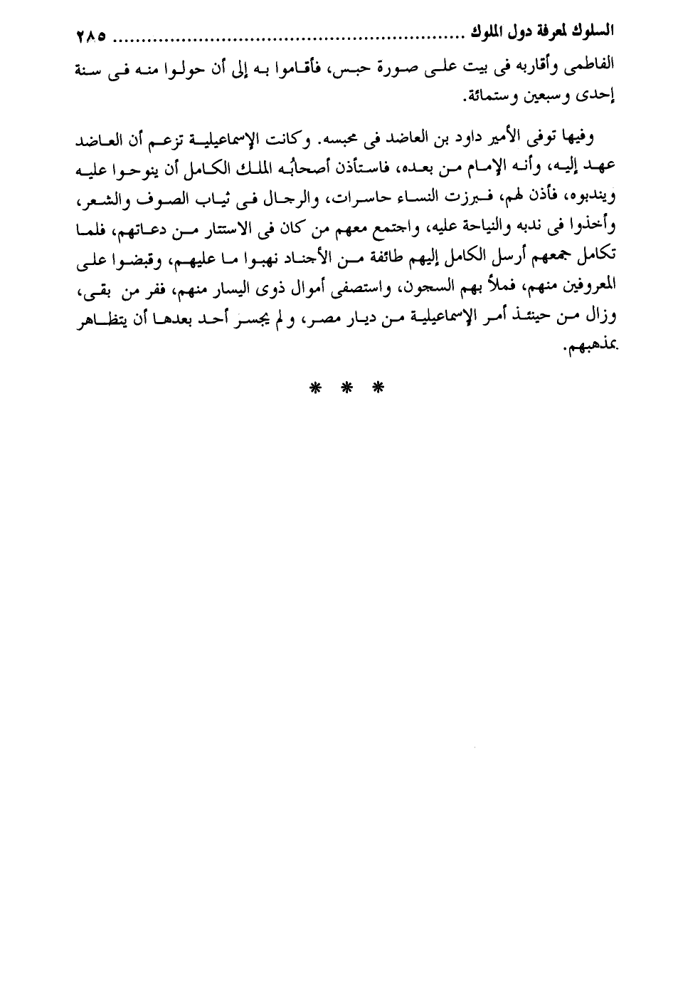 الفاطمي وأقاربه فى بَيت على صُورَة حبس، فأقاموا بِهِ إِلَى أَن حولوا مِنْهُ فِي سنة إِحْدَى وَسبعين وسِتمِائَة. وفيهَا توفى الْأَمِير دَاوُد بن العاضد فى محبسه. وَكَانَت الإسماعيلية تزْعم أَن العاضد عهد إِلَيْهِ وَأَنه الإِمَام من بعده فَاسْتَأْذن أَصْحَابه من الْكَامِل أَن ينوحوا عَلَيْهِ ويندبوه فَأذن لَهُم فبرزت النِّسَاء حاسرات وَالرِّجَال فى ثِيَاب الصُّوف وَالشعر وَأخذُوا فى نَدبه والنياحة عَلَيْهِ وَاجْتمعَ مَعَهم من كَانَ فى الاستتار من دعاتهم فَلَمَّا تَكَامل جمعهم أرسل الْكَامِل إِلَيْهِم طَائِفَة من الأجناد نهبوا مَا عَلَيْهِم وقبضوا على المعروفين مِنْهُم فَمَلَأ بهم السجون واستصفى أَمْوَال ذوى الْيَسَار مِنْهُم ففر من بَقِي وَزَالَ من حِينَئِذٍ أَمر الإسماعيلية من ديار مصر وَلم يَجْسُر أحد بعْدهَا أَن يتظاهر بمذهبهم.
