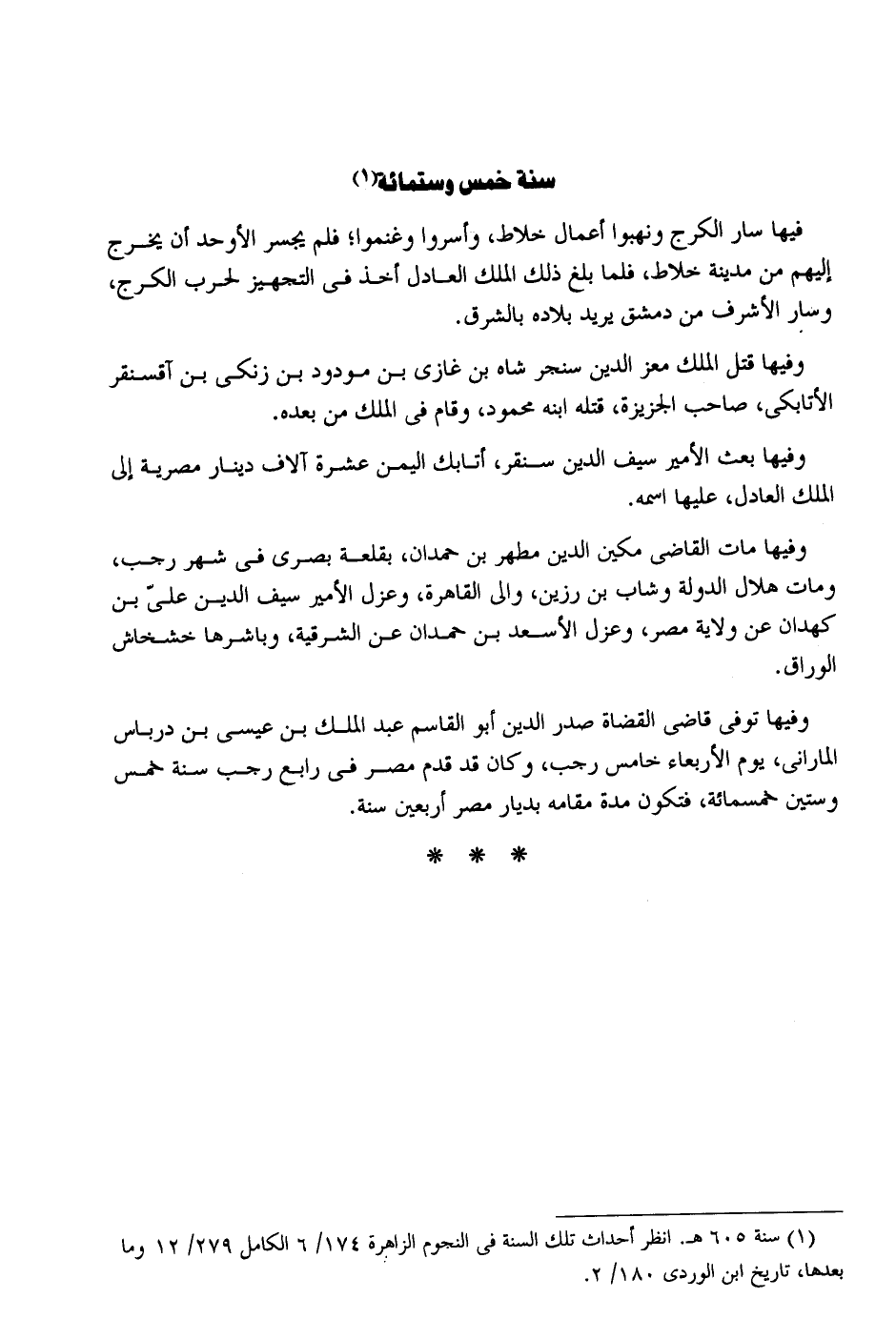 سنة خمس وسِتمِائَة فِيهَا سَار الكرج ونهبوا أَعمال خلاط وأسروا وغنموا فَلم يَجْسُر الأوحد أَن يخرج إِلَيْهِم من مَدِينَة خلاط فَلَمَّا بلغ ذَلِك الْملك الْعَادِل أَخذ فِي التَّجْهِيز لِحَرْب الكرج وَسَار الْأَشْرَف من دمشق يُرِيد بِلَاده بالشرق. وفيهَا قتل الْملك معز الدّين سنجر شاه بن غَازِي بن مودود بن زنكي بن آقسنقر الأتابكي صَاحب الجزيزة قَتله ابْنه مَحْمُود وَقَامَ فى الْملك من بعده. وفيهَا بعث الْأَمِير سيف الدّين سنقر أتابك الْيمن عشرَة آلَاف دِينَار مصرية إِلَى الْملك الْعَادِل عَلَيْهَا اسْمه. وفيهَا مَاتَ القَاضِي مكين الدّين مطهر بن حمدَان بقلعة بصرى فِي شهر رَجَب وَمَات هِلَال الدولة وشاب بن رزين وَالِي الْقَاهِرَة وعزل الْأَمر سيف الدّين على بن كهدان عَن ولَايَة مصر وعزل الأسعد بن حمدَان عَن الشرقية وباشرها خشخاش الْوراق. وفيهَا توفى قَاضِي الْقُضَاة صدر الدّين أَبُو الْقَاسِم عبد الْملك بن عِيسَى بن درباس الماراني يَوْم الْأَرْبَعَاء خَامِس رَجَب وَكَانَ قد قدم مصر فِي رَابِع رَجَب سنة خمس وَسِتِّينَ خَمْسمِائَة فَتكون مُدَّة مقَامه بديار مصر أَرْبَعِينَ سنة.