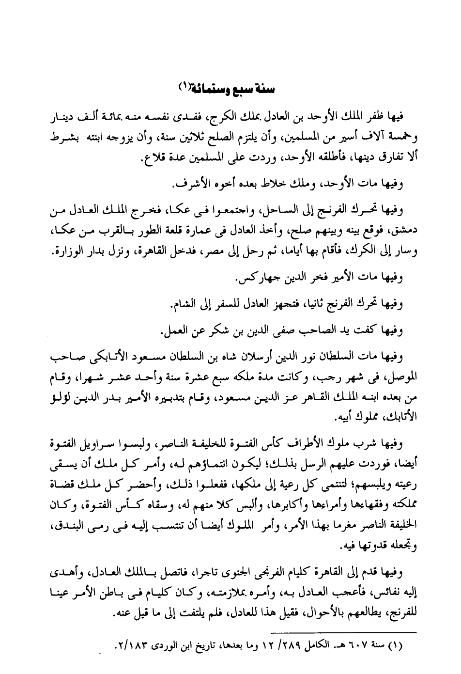 سنة سبع وسِتمِائَة فِيهَا ظفر الْملك الأوحد بن الْعَادِل بِملك الكرج ففدى نَفسه مِنْهُ بِمِائَة ألف دِينَار وَخَمْسَة آلَاف أَسِير من الْمُسلمين وَأَن يلْتَزم الصُّلْح ثَلَاثِينَ سنة وَأَن يُزَوجهُ ابْنَته بِشَرْط أَلا تفارق دينهَا فَأَطْلقهُ الأوحد وَردت على الْمُسلمين عدَّة قلاع. وفيهَا مَاتَ الأوحد وَملك خلاط بعده أَخُوهُ الْأَشْرَف. وفيهَا تحرّك الفرنج إِلَى السَّاحِل واجتمعوا فِي عكا فَخرج الْملك الْعَادِل من دمشق فَوَقع بَينه وَبينهمْ صلح وَأخذ الْعَادِل فِي عمَارَة قلعة الطّور بِالْقربِ من عكا وَسَار إِلَى الكرك فَأَقَامَ بهَا أَيَّامًا ثمَّ رَحل إِلَى مصر فَدخل الْقَاهِرَة وَنزل بدار الوزارة. وفيهَا مَاتَ الْأَمِير فَخر الدّين جهاركس. وفيهَا تحرّك الفرنج ثَانِيًا فتجهز الْعَادِل للسَّفر إِلَى الشَّام. وفيهَا كفت يَد الصاحب صفي الدّين بن شكر عَن الْعَمَل. وفيهَا مَاتَ السُّلْطَان نور الدّين أرسلان شاه بن السُّلْطَان مَسْعُود الأتابكي صَاحب الْموصل فِي شهر رَجَب وَكَانَت مُدَّة ملكه سبع عشرَة سنة وَأحد عشر شهرا وَقَامَ من بعده ابْنه الْملك القاهر عز الدّين مَسْعُود وَقَامَ بتدبيره الْأَمِير بدر الدّين لُؤْلُؤ الأتابك مَمْلُوك ابيه. وفيهَا شرب مُلُوك الْأَطْرَاف كأس الفتوة للخليفة النَّاصِر ولبسوا سَرَاوِيل الفتوة أَيْضا فوردت عَلَيْهِم الرُّسُل بذلك ليَكُون انتماؤهم لَهُ وَأمر كل ملك أَن يسْقِي رَعيته ويلبسهم لتنتمي كل رعية إِلَى ملكهَا فَفَعَلُوا ذَلِك وأحضر كل ملك قُضَاة مَمْلَكَته وفقهاءها وأمراءها وأكابرها وألبس كلا مِنْهُم لَهُ وسقاه كأس الفتوة وَكَانَ الْخَلِيفَة النَّاصِر مغرما بِهَذَا الْأَمر وَأمر الْمُلُوك أَيْضا ان تنتسب إِلَيْهِ فِي رمي البندق وتجعله قدوتها فِيهِ. وفيهَا قدم إِلَى الْقَاهِرَة كليام الفرنجى الجنوي تَاجِرًا فاتصل بِالْملكِ الْعَادِل وَأهْدى إِلَيْهِ نفائس فاعجب الْعَادِل بِهِ وَأمره بملازمته وَكَانَ كليام فِي بَاطِن الْأَمر عينا للفرنج يطالعهم بالأحوال فَقيل هَذَا للعادل فَلم يلْتَفت إِلَى مَا قيل عَنهُ.