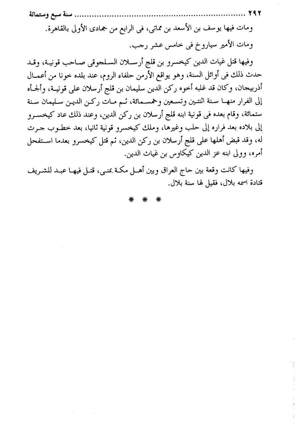 وَمَات فِيهَا يُوسُف بن الأسعد بن مماتي فِي الرَّابِع من جُمَادَى الأولى بِالْقَاهِرَةِ. وَمَات الْأَمر سياروخ فِي خَامِس عشر رَجَب. وفيهَا قتل غياث الدّين كيخسرو بن قلج أرسلان السلجوقي صَاحب قونية وَقد حدث ذَلِك فِي أَوَائِل السّنة وَهُوَ يواقع الأرمن حلفاء الرّوم عِنْد بَلَده خونا من أَعمال أذربيجان وَكَانَ قد غَلبه أَخُوهُ ركن الدّين سُلَيْمَان بن قلج أرسلان على قونية وألجأه إِلَى الْفِرَار مِنْهَا سنة اثْنَتَيْنِ وَتِسْعين وَخَمْسمِائة ثمَّ مَاتَ ركن الدّين سُلَيْمَان سنه سِتّمائَة وَقَامَ بعده فِي قونية ابْنه قلج أرسلان بن ركن الدّين وَعند ذَلِك عَاد كيخسرو إِلَى بِلَاده بعد فراره إِلَى حلب وَغَيرهَا وَملك كيخسرو قونية ثَانِيًا بعد خطوب جرت لَهُ وَقد قبض أَهلهَا على قلج أرسلان بن ركن الدّين ثمَّ قتل كيخسرو بَعْدَمَا استفحل أمره وَولى ابْنه عز الدّين كيكاوس بن غياث الدّين. وفيهَا كَانَت وقْعَة بَين حَاج الْعرَاق وَبَين أهل مَكَّة بمنى قتل فِيهَا عبد للشريف قَتَادَة اسْمه بِلَال فَقيل لَهَا سنة بِلَال.