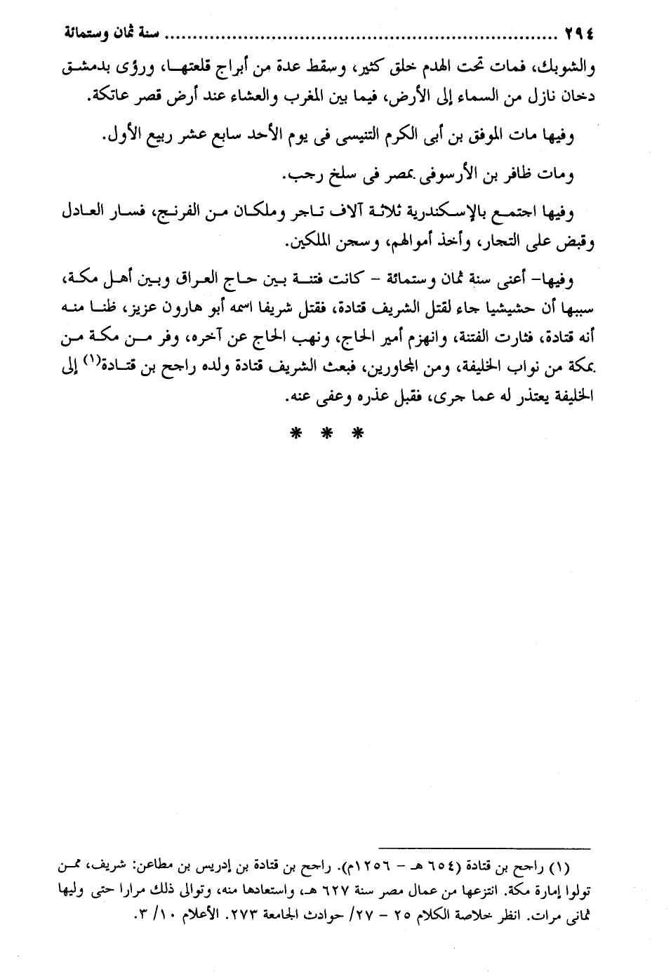 والشوبك فَمَاتَ تَحت الْهدم خلق كثير وَسقط عدَّة من أبراج قلعتها ورؤي بِدِمَشْق دُخان نَازل من السَّمَاء إِلَى الأَرْض فِيمَا بِي الْمغرب وَالْعشَاء عِنْد أَرض قصر عَاتِكَة. وفيهَا مَاتَ الْمُوفق بن أَبى الْكَرم التنيسِي فِي يَوْم الْأَحَد سَابِع عشر ربيع الأول. وَمَات ظافر بن الأرسوفي بِمصْر فِي سلخ رَجَب. وفيهَا اجْتمع بالإسكندرية ثَلَاثَة آلَاف تَاجر وملكان من الفرنج فَسَار الْعَادِل وَقبض على التُّجَّار وَأخذ أَمْوَالهم وسجن الْملكَيْنِ. وفيهَا أَعنِي سنة ثَمَان وسِتمِائَة كَانَت فتْنَة بَين حَاج الْعرَاق وَبَين أهل مَكَّة سَببهَا ان حشيشيا جَاءَ لقتل الشريف قَتَادَة فَقتل شريفا اسْمه أَبُو هَارُون عَزِيز ظنا مِنْهُ أَنه قَتَادَة فثارت الْفِتْنَة وَانْهَزَمَ أَمِير الْحَاج وَنهب الْحَاج عَن أَخّرهُ وفر من مَكَّة من بِمَكَّة من نواب الْخَلِيفَة وَمن المجاورين فَبعث الشريف قَتَادَة وَلَده رَاجِح بن قَتَادَة إِلَى الْخَلِيفَة يعْتَذر لَهُ عَمَّا جرى فَقبل عذره وعفي عَنهُ.
