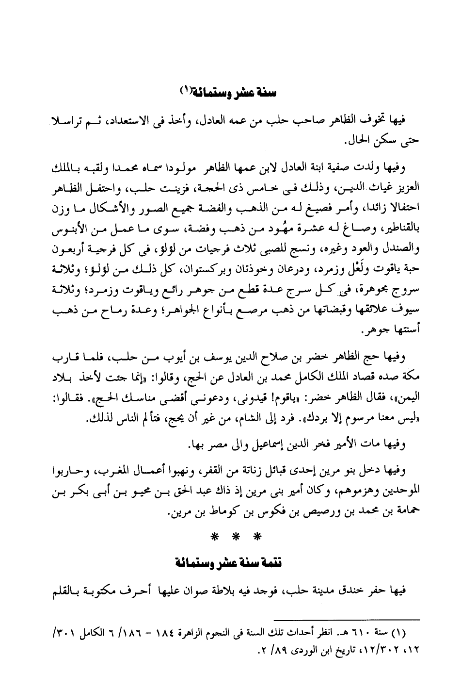 سنة عشر وسِتمِائَة فِيهَا تخوف الظَّاهِر صَاحب حلب من عَمه الْعَادِل وَأخذ فِي الاستعداد ثمَّ تراسلا حَتَّى سكن الْحَال. وفيهَا ولدت صَفِيَّة ابْنة الْعَادِل لِابْنِ عَمها الظَّاهِر مولودا سَمَّاهُ مُحَمَّدًا ولقبه بِالْملكِ الْعَزِيز غياث الدّين وَذَلِكَ فِي خَامِس ذِي الْحجَّة فزينت حلب واحتفل الظَّاهِر احتفالا زَائِدا وَأمر فصيغ لَهُ من الذَّهَب وَالْفِضَّة جَمِيع الصُّور والأشكال مَا وزن بالقناطير وصاغ لَهُ عشرَة مهود من ذهب وَفِضة سوى مَا عمل من الأبنوس والصندل وَالْعود وَغَيره ونسج للصَّبِيّ ثَلَاث فرجيات من لُؤْلُؤ فِي كل فرجية أَرْبَعُونَ حَبَّة ياقوت وَلَعَلَّ وزمرد ودرعان وخوذتان وبركستوان كل ذَلِك من لُؤْلُؤ وَثَلَاثَة سروج مجوهرة فِي كل سرج عدَّة قطع من جَوْهَر رائع وَيَاقُوت وزمرد وَثَلَاثَة سيوف علائقها وقبضاتها من ذهب مرصع بأنواع الْجَوَاهِر وعدة رماح من ذهب أسنتها جَوْهَر. وفيهَا حج الظَّاهِر خضر بن صَلَاح الدّين يُوسُف بن أَيُّوب من حلب فَلَمَّا قَارب مَكَّة صده قصاد الْملك الْكَامِل مُحَمَّد بن الْعَادِل عَن الْحَج وَقَالُوا: إِنَّمَا جِئْت لأخذ بِلَاد الْيمن فَقَالَ الظَّاهِر خضر: ياقوم! قيدوني ودعوني أَقْْضِي مَنَاسِك الْحَج. فَقَالُوا: لَيْسَ مَعنا مرسوم إِلَّا بردك. فَرد إِلَى الشَّام من غير أَن يحجّ فتألم النَّاس لذَلِك. وفيهَا مَاتَ الْأَمِير فَخر الدّين إِسْمَاعِيل والى مصر بهَا. وفيهَا دخل بَنو مرين إِحْدَى قبائل زناتة من القفر ونهبوا أَعمال الْمغرب وحاربوا الْمُوَحِّدين وهزموهم وَكَانَ أَمِير بني مرين إِذْ ذَاك عبد الْحق بن محيو بن أبي بكر بن حمامة بن مُحَمَّد بن ورصيص بن فكوس بن كوماط بن مرين. سنة عشر وسِتمِائَة تَتِمَّة سنة عشر وسِتمِائَة فِيهَا حفر خَنْدَق مَدِينَة حلب فَوجدَ فِيهِ بلاطة صوان عَلَيْهَا أحرف مَكْتُوبَة بالقلم