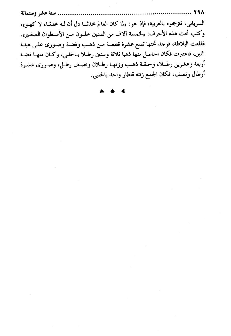 السرياني فترجموه بِالْعَرَبِيَّةِ فَإِذا هُوَ: لما كَانَ الْعَالم مُحدثا دلّ أَن لَهُ مُحدثا لَا كَهُوَ وَكتب تَحت هَذِه الأحرف: لخمسة آلَاف من السنين خلون من الأسطوان الصَّغِير. فَقلعت البلاطة فَوجدَ تحتهَا تسع عشرَة قِطْعَة من ذهب وَفِضة وصورى على هَيْئَة اللَّبن فاعتبرت فَكَانَ الْحَاصِل مِنْهَا ذَهَبا ثَلَاثَة وَسِتِّينَ رطلا بالحلبي وَكَانَ مِنْهَا فضَّة أَرْبَعَة وَعشْرين رطلا وحلقة ذهب وَزنهَا رطلان وَنصف رَطْل وصورى عشرَة أَرْطَال وَنصف فَكَانَ الْجمع زنته قِنْطَار وَاحِد بالحلبي.