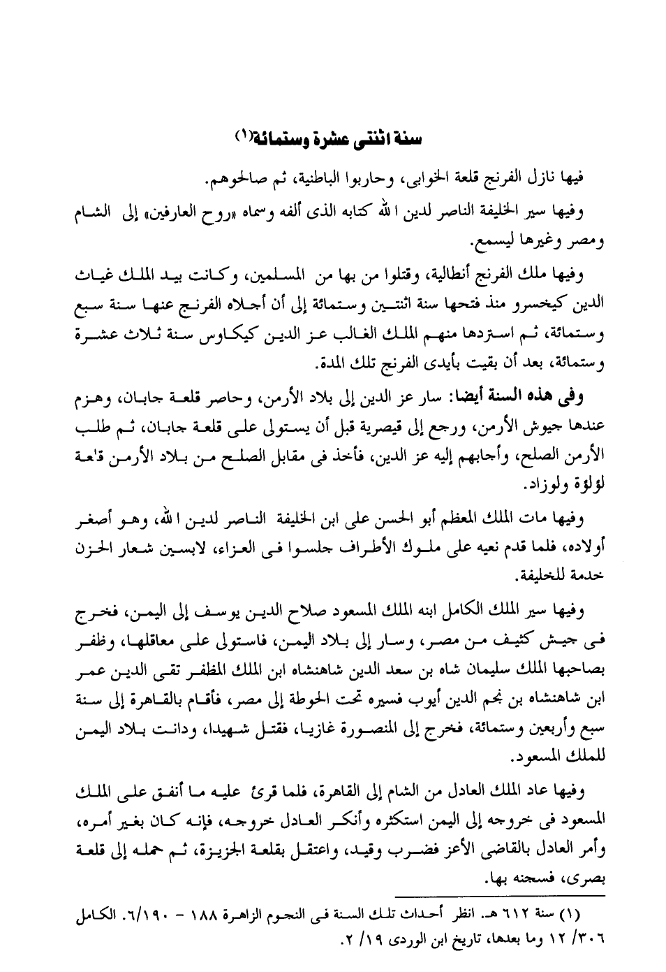 سنة اثْنَتَيْ عشرَة وسِتمِائَة فِيهَا نَازل الفرنج قلعة الخوابي وحاربوا الباطنية ثمَّ صالحوهم. وفيهَا سير الْخَلِيفَة النَّاصِر لدين الله كِتَابه الَّذِي أَلفه وَسَماهُ روح العارفين إِلَى الشَّام ومصر وَغَيرهَا ليسمع. وفيهَا ملك الفرنج أنطالية وَقتلُوا من بهَا من الْمُسلمين وَكَانَت بيد الْملك غياث الدّين كيخسرو مُنْذُ فتحهَا سنة اثْنَتَيْنِ وسِتمِائَة إِلَى أَن أجلاه الفرنج عَنْهَا سنة سبع وسِتمِائَة ثمَّ استردها مِنْهُم الْملك الْغَالِب عز الدّين كيكاوس سنة ثَلَاث عشرَة وسِتمِائَة بعد أَن بقيت بأيدي الفرنج تِلْكَ الْمدَّة. وَفِي هَذِه السّنة أَيْضا: سَار عز الدّين إِلَى بِلَاد الأرمن وحاصر قلعة جَابَان وَهزمَ عِنْدهَا جيوش الأرمن وَرجع إِلَى قيصرية قبل أَن يستولي على قلعة جَابَان ثمَّ طلب الأرمن الصُّلْح وأجابهم إِلَيْهِ عز الدّين فَأخذ فِي مُقَابل الصُّلْح من بِلَاد الأرمن قلعة لؤلؤة ولوزاد. وفيهَا مَاتَ الْملك الْمُعظم أَبُو الْحسن عَليّ ابْن الْخَلِيفَة النَّاصِر لدين الله وَهُوَ أَصْغَر أَوْلَاده فَلَمَّا قدم نعيه على مُلُوك الْأَطْرَاف جَلَسُوا فِي العزاء لابسين شعار الْحزن خدمَة للخليفة. وفيهَا سير الْملك الْكَامِل ابْنه الْملك المسعود صَلَاح الدّين يُوسُف إِلَى الْيمن فَخرج فِي جَيش كثيف من مصر وَسَار إِلَى بِلَاد الْيمن فاستولى على معاقلها وظفر بصاحبها الْملك سُلَيْمَان شاه بن سعد الدّين شاهنشاه ابْن الْملك المظفر تَقِيّ الدّين عمر بن شاهنشاه بن نجم الدّين أَيُّوب فسيره تَحت الحوطة إِلَى مصر فَأَقَامَ بِالْقَاهِرَةِ إِلَى سنة سبع وَأَرْبَعين وسِتمِائَة فَخرج إِلَى المنصورة غازيا فَقتل شَهِيدا ودانت بِلَاد الْيمن للْملك المسعود. وفيهَا عَاد الْملك الْعَادِل من الشَّام إِلَى الْقَاهِرَة فَلَمَّا قرىء عَلَيْهِ مَا أنْفق على الْملك المسعود فِي خُرُوجه إِلَى الْيمن استكثره وَأنكر الْعَادِل خُرُوجه فَإِنَّهُ كَانَ بِغَيْر أمره وَأمر الْعَادِل بِالْقَاضِي الْأَعَز فَضرب وَقيد واعتقل بقلعة الجزيزة ثمَّ حمله إِلَى قلعة بصرى فسجنه بهَا.
