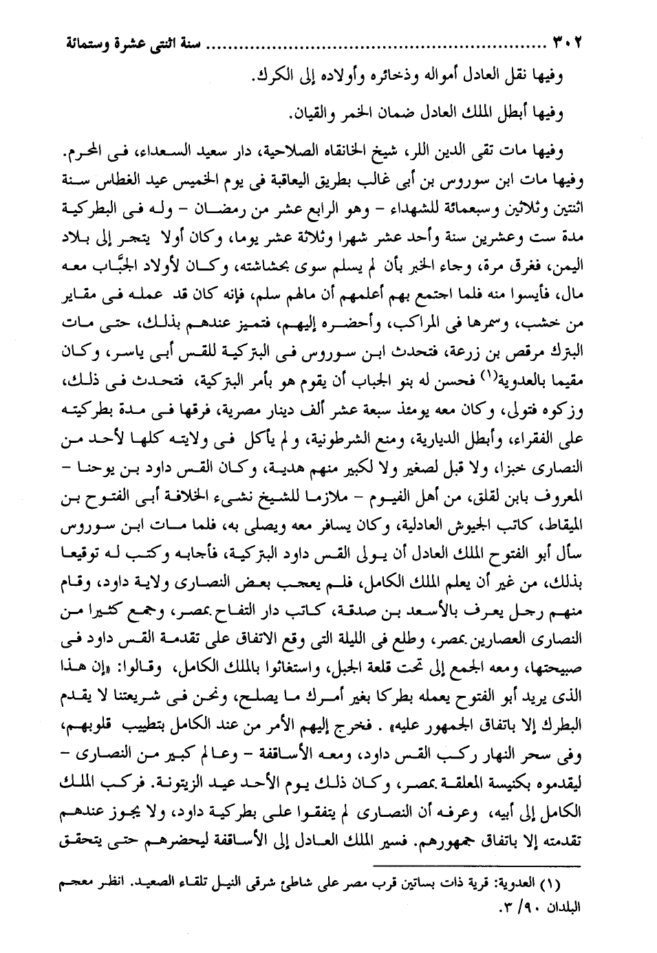 وفيهَا نقل الْعَادِل أَمْوَاله وذخائره وَأَوْلَاده إِلَى الكرك. وفيهَا أبطل الْملك الْعَادِل ضَمَان الْخمر والقيان. وفيهَا مَاتَ تَقِيّ الدّين اللر شيخ الخانقاه الصلاحية دَار سعيد السُّعَدَاء فِي الْمحرم. وفيهَا مَاتَ ابْن سوروس بن أبي غَالب بطرِيق اليعاقبة فِي يَوْم الْخَمِيس عيد الغطاس سنة اثْنَتَيْنِ وَثَلَاثِينَ وَسَبْعمائة للشهداء وَهُوَ الرَّابِع عشر من رَمَضَان وَله فِي البطركية مُدَّة سِتّ وَعشْرين سنة وَأحد عشر شهرا وَثَلَاثَة عشر يَوْمًا وَكَانَ أَولا يتجر إِلَى بِلَاد الْيمن فغرق مرّة وَجَاء الْخَبَر بِأَن لم يسلم سوى بحشاشته وَكَانَ لأَوْلَاد الْجبَاب مَعَه مَال فأيسوا مِنْهُ فَلَمَّا اجْتمع بهم أعلمهم أَن مَالهم سلم فَإِنَّهُ كَانَ قد عمله فِي مَقَابِر من خشب وسمرها فِي المراكب وأحضره إِلَيْهِم فتميز عِنْدهم بذلك حَتَّى مَاتَ البترك مرقص بن زرْعَة فَتحدث ابْن سوروس فِي البتركية للقس أبي يَاسر وَكَانَ مُقيما بالعدوية فَحسن لَهُ بَنو الْجبَاب أَن يقوم هُوَ بِأَمْر البتركية فَتحدث فِي ذَلِك وزكوه فَتَوَلّى وَكَانَ مَعَه يَوْمئِذٍ سَبْعَة عشر ألف دِينَار مصرية فرقها فِي مُدَّة بطركيته على الْفُقَرَاء وأبطل الديارية وَمنع الشرطونية وَلم يَأْكُل فِي ولَايَته كلهَا لأحد من النَّصَارَى خبْزًا وَلَا قبل لصغير وَلَا لكبير مِنْهُم هَدِيَّة وَكَانَ القس دَاوُد بن يوحنا الْمَعْرُوف بِابْن لقلق من أهل الفيوم ملازما للشَّيْخ نشىء الْخلَافَة أبي الْفتُوح بن الميقاط كَاتب الجيوش العادلية وَكَانَ يُسَافر مَعَه وَيصلى بِهِ فَلَمَّا مَاتَ ابْن سوروس سَأَلَ أَبُو الْفتُوح الْملك الْعَادِل أَن يولي القس دَاوُد البتركية فَأَجَابَهُ وَكتب لَهُ توقيعا بذلك من غير أَن يعلم الْملك الْكَامِل فَلم يعجب بعض النَّصَارَى ولَايَة دَاوُد وَقَامَ مِنْهُم رجل يعرف بالأسعد بن صَدَقَة كَاتب دَار التفاح بِمصْر وَجمع كثيرا من النَّصَارَى العصارين بِمصْر وطلع فِي اللَّيْلَة الَّتِي وَقع الِاتِّفَاق على تقدمة القس دَاوُد فِي صبيحتها وَمَعَهُ الْجمع إِلَى تَحت قلعة الْجَبَل واستغاثوا بِالْملكِ الْكَامِل وَقَالُوا: إِن هَذَا الَّذِي يُرِيد أَبُو الْفتُوح يعمله بطركا بِغَيْر أَمرك مَا يصلح وَنحن فِي شريعتنا لَا يقدم البطرك إِلَّا بِاتِّفَاق الْجُمْهُور عَلَيْهِ. فَخرج إِلَيْهِم الْأَمر من عِنْد الْكَامِل بتطييب قُلُوبهم وَفِي سحر النَّهَار ركب القس دَاوُد وَمَعَهُ الأساقفة وعالم كَبِير من النَّصَارَى ليقدموه بكنيسة الْمُعَلقَة بِمصْر وَكَانَ ذَلِك يَوْم الْأَحَد عيد الزيتونة. فَركب الْملك الْكَامِل إِلَى أَبِيه وعرفه أَن النَّصَارَى لم يتفقوا على بطركية دَاوُد وَلَا يجوز عِنْدهم تقدمته إِلَّا بِاتِّفَاق جمهورهم. فسير الْملك الْعَادِل إِلَى الأساقفة ليحضرهم حَتَّى يتَحَقَّق