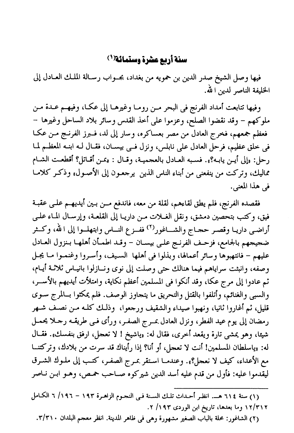 سنة أَربع عشرَة وسِتمِائَة فِيهَا وصل الشَّيْخ صدر الدّين بن حمويه من بَغْدَاد بِجَوَاب رِسَالَة الْملك الْعَادِل إِلَى الْخَلِيفَة النَّاصِر لدين الله. وفيهَا تَتَابَعَت أَمْدَاد الفرنج فِي الْبَحْر من روما وَغَيرهَا إِلَى عكا وَفِيهِمْ عدَّة من مُلُوكهمْ وَقد نقضوا الصُّلْح وعزموا على أَخذ الْقُدس وَسَائِر بِلَاد السَّاحِل وَغَيرهَا فَعظم جمعهم فَخرج الْعَادِل من مصر بعساكره وَسَار إِلَى لد فبرز الفرنج من عكا فِي خلق عَظِيم فَرَحل الْعَادِل على نابلس وَنزل فِي بيسان فَقَالَ لَهُ ابْنه الْمُعظم لما رَحل: إِلَى أَيْن يابه. فَسَبهُ الْعَادِل بالعجمية وَقَالَ: بِمن أقَاتل أقطعت الشَّام مماليك وَتركت من يَنْفَعنِي من أَبنَاء النَّاس الَّذين يرجعُونَ إِلَى الْأُصُول وَذكر كلَاما فِي هَذَا الْمَعْنى. فقصده الفرنج فَلم يطق لقاءهم لقلَّة من مَعَه فَانْدفع من بَين أَيْديهم على عقبَة فيق وَكتب بتحصين دمشق وَنقل الغلات من داريا إِلَى القلعة وإرسال المَاء على أَرَاضِي داريا وَقصر حجاج والشاغور فَفَزعَ النَّاس وابتهلوا إِلَى الله وَكثر ضجيجهم بالجامع فزحف الفرنج على بيسان وَقد اطْمَأَن أَهلهَا بنزول الْعَادِل عَلَيْهِم فانتهبوها وَسَائِر أَعمالهَا وبذلوا فِي أَهلهَا السَّيْف وأسروا وغنموا مَا يجل وَصفه وانبثت سراياهم فِيمَا هُنَالك حَتَّى وصلت إِلَى نوى ونازلوا بانياس ثَلَاثَة أَيَّام ثمَّ عَادوا إِلَى مرج عكا وَقد أنكوا فِي الْمُسلمين أعظم نكاية وامتلأت أَيْديهم بالأسر والسبي والغنائم وأتلفوا بِالْقَتْلِ وَالتَّحْرِيق مَا يتَجَاوَز الْوَصْف. فَلم يمكثوا بالمرج سوى قَلِيل ثمَّ أَغَارُوا ثَانِيًا ونهبوا صيداء والشقيف وَرَجَعُوا وَذَلِكَ كُله من نصف شهر رَمَضَان إِلَى يَوْم عيد الْفطر وَنزل الْعَادِل بمرج الصفر وَرَأى فِي طَرِيقه رجلا يحمل شَيْئا وَهُوَ يمشي تَارَة وَيقْعد أُخْرَى فَقَالَ لَهُ: ياشيخ {لَا تعجل ارْفُقْ بِنَفْسِك. ففال لَهُ: ياسلطان الْمُسلمين} أَنْت لَا تعجل أَو أَنا إِذا رَأَيْنَاك قد سرت من بلادك وَتَرَكتنَا مَعَ الْأَعْدَاء كَيفَ لَا نعجل. وعندما اسْتَقر بمرج الصفر كتب إِلَى مُلُوك الشرق ليقدموا عَلَيْهِ: فَأول من قدم عَلَيْهِ أَسد الدّين شيركوه صَاحب حمص وَهُوَ ابْن نَاصِر
