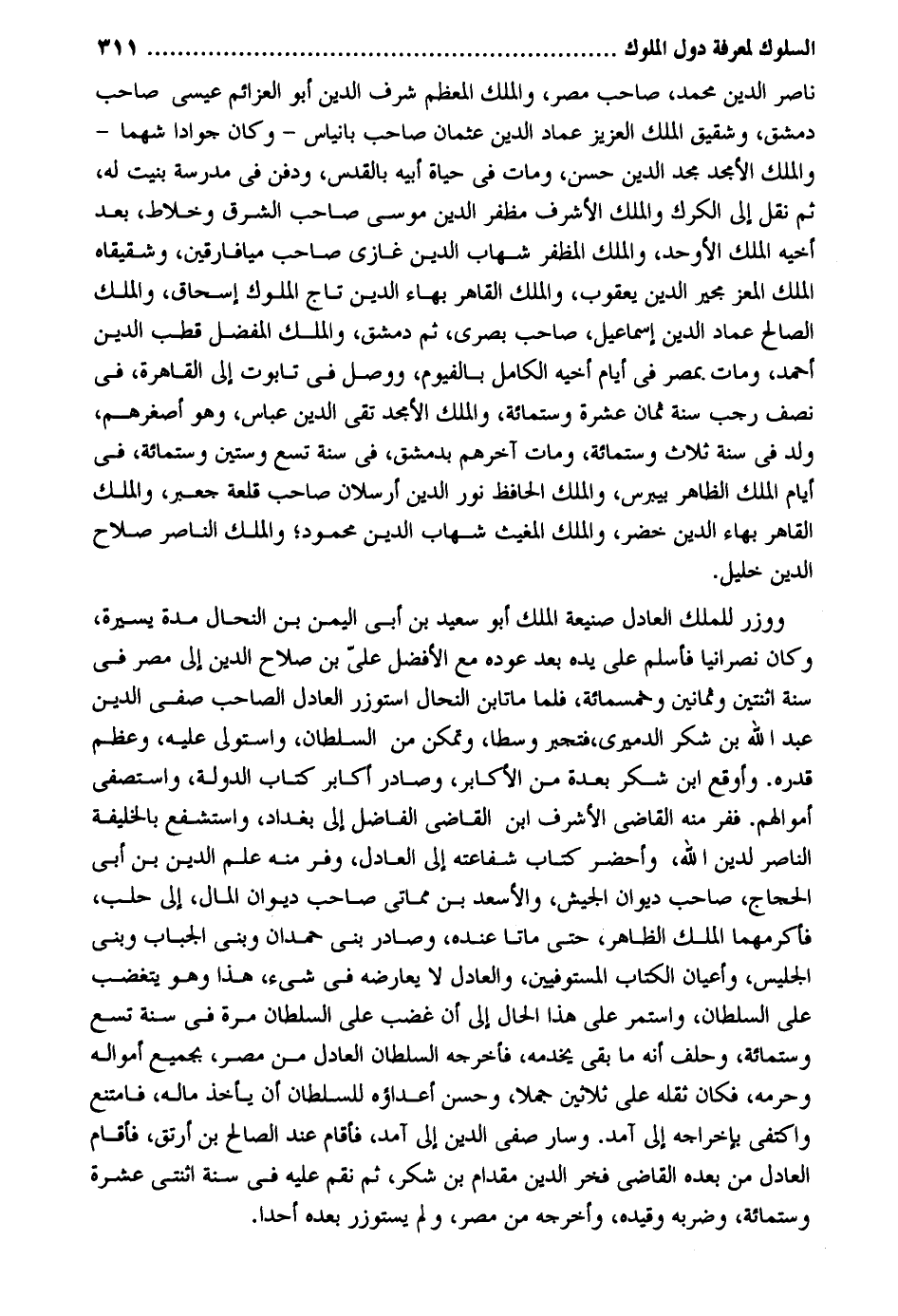 نَاصِر الدّين مُحَمَّد صَاحب مصر وَالْملك الْمُعظم شرف الدّين أَبُو العزائم عِيسَى صَاحب دمشق وشقيق الْملك الْعَزِيز عماد الدّين عُثْمَان صَاحب بانياس وَكَانَ جوادا شهما وَالْملك الأمجد مجد الدّين حسن وَمَات فِي حَيَاة أَبِيه بالقدس وَدفن فِي مدرسة بنيت لَهُ ثمَّ نقل إِلَى الكرك وَالْملك الْأَشْرَف مظفر الدّين مُوسَى صَاحب الشرق وخلاط بعد أَخِيه الْملك الأوحد وَالْملك المظفر شهَاب الدّين غَازِي صَاحب ميافارتن وشقيقاه الْملك الْمعز مجير الدّين يَعْقُوب وَالْملك القاهر بهاء الدّين تَاج الْمُلُوك إِسْحَاق وَالْملك الصا لح عماد الدّين إِسْمَاعِيل صَاحب بصرى ثمَّ دمشق وَالْملك الْمفضل قطب الدّين أَحْمد وَمَات بِمصْر فِي أَيَّام أَخِيه الْكَامِل بالفيوم وَوصل فِي تَابُوت إِلَى الْقَاهِرَة فِي نصف رَجَب سنة ثَمَان عشرَة وسِتمِائَة وَالْملك الأمجد تَقِيّ الدّين عَبَّاس وَهُوَ أَصْغَرهم ولد فِي سنة ثَلَاث وسِتمِائَة وَمَات آخِرهم بِدِمَشْق فِي سنة تسع وَسِتِّينَ وسِتمِائَة فِي أَيَّام الْملك الظَّاهِر بيبرس وَالْملك الْحَافِظ نور الدّين أرسلان صَاحب قلعة جعبر وَالْملك القاهر بهاء الدّين خضر وَالْملك المغيث شهَاب الدّين مَحْمُود وَالْملك النَّاصِر صَلَاح الدّين خَلِيل. ووزر للْملك الْعَادِل صَنِيعَة الْملك أَبُو سعيد بن أبي الْيمن بن النحال مُدَّة يسيرَة وَكَانَ نَصْرَانِيّا فَأسلم على يَده بعد عوده مَعَ الْأَفْضَل عَليّ بن صَلَاح الدّين إِلَى مصر فِي سنة اثْنَتَيْنِ وَثَمَانِينَ وَخَمْسمِائة فَلَمَّا مَاتَ ابْن النحال استوزر الْعَادِل الصاحب صفي الدّين عبد الله بن شكر الدَّمِيرِيّ فتجبر وسطا وَتمكن من السُّلْطَان وَاسْتولى عَلَيْهِ وَعظم قدره. وأوقع ابْن شكر بعدة من الأكابر وصادر أكَابِر كتاب الدولة واستصفى أَمْوَالهم. ففر مِنْهُ القَاضِي الْأَشْرَف ابْن القَاضِي الْفَاضِل إِلَى بَغْدَاد واستشفع بالخليفة النَّاصِر لدين الله وأحضر كتاب شَفَاعَته إِلَى الْعَادِل وفر مِنْهُ علم الدّين بن أبي الْحجَّاج صَاحب ديوَان الْجَيْش والأسعد بن مماتي صَاحب ديوَان المَال إِلَى حلب فأكرمهما الْملك الظَّاهِر حَتَّى مَاتَا عِنْده وصادر بني حمدَان وَبني الْجبَاب وَبني الجليس وأعيان الْكتاب المستوفين والعادل لَا يُعَارضهُ فِي شَيْء هَذَا وَهُوَ يتغضب على السُّلْطَان وَاسْتمرّ على هَذَا الْحَال إِلَى أَن غضب على السُّلْطَان مرّة فِي سنة تسع وسِتمِائَة وَحلف أَنه مَا بَقِي يَخْدمه فَأخْرجهُ السُّلْطَان الْعَادِل من مصر بِجَمِيعِ أَمْوَاله وَحرمه فَكَانَ ثقله على ثَلَاثِينَ جملا وَحسن أعداؤه للسُّلْطَان أَن يَأْخُذ مَاله فَامْتنعَ وَاكْتفى بِإِخْرَاجِهِ إِلَى آمد. وَسَار صفي الدّين إِلَى آمد فَأَقَامَ عِنْد الصَّالح بن أرتق فَأَقَامَ الْعَادِل من بعده القَاضِي فَخر الدّين مِقْدَام بن شكر ثمَّ نقم عَلَيْهِ فِي سنة اثْنَتَيْ عشرَة وسِتمِائَة وضربه وَقَيده وَأخرجه من مصر وَلم يستوزر بعده أحدا.