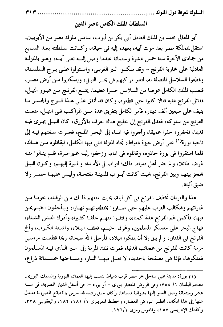السُّلْطَان الْملك الْكَامِل نَاصِر الدّين أَبُو الْمَعَالِي مُحَمَّد بن الْملك الْعَادِل أبي بكر بن أَيُّوب سادس مُلُوك مصر من الأيوبيين اسْتَقل بمملكة مصر بعد موت أَبِيه بعهده إِلَيْهِ فِي حَيَاته وَكَانَت سلطنته بعد السَّابِع من جُمَادَى الْآخِرَة سنة خمس عشرَة وسِتمِائَة عِنْدَمَا وصل إِلَيْهِ نعي أَبِيه وَهُوَ بالمنزلة العادلية على محاربة الفرنج وَقد ملكوا الْبر الغربي واستولوا على برج السلسلة وَقَطعُوا السلَاسِل الْمُتَّصِلَة بِهِ لتعبر مراكبهم فِي بَحر النّيل ويتمكنوا من أَرض مصر فنصب الْملك الْكَامِل عوضا من السلَاسِل جِسْرًا عَظِيما يمْنَع الفرنج من عبور النّيل فقاتل الفرنج عَلَيْهِ قتالا كثيرا حَتَّى قطعوه وَكَانَ قد أنْفق على هَذَا البرج والجسر مَا ينيف على سبعين ألف دِينَار فَأمر الْكَامِل بتغريق عدَّة من المراكب فِي النّيل منعت الفرنج من سلوكه فَعدل الفرنج إِلَى خليج هُنَاكَ يعرف بالأزرق كَانَ النّيل يجرى فِيهِ قَدِيما فحفروه حفرا عميقا وأجروا فِيهِ المَاء إِلَى الْبَحْر الْملح فجرت سفنهم فِيهِ إِلَى نَاحيَة بورة على أَرض جيزة دمياط تجاه الْمنزلَة الَّتِي فِيهَا الْكَامِل ليقاتلوه من هُنَاكَ فَلَمَّا استقروا فِي بورة حاذوه وقاتلوه فِي المَاء وزحفوا إِلَيْهِ غير مرّة فَلم ينالوا مِنْهُ غَرضا طائلا وَلم يضر أهل دمياط ذَلِك لتواصل الأمداد والميرة إِلَيْهِم وَكَون النّيل يحجز بَينهم وَبَين الفرنج بِحَيْثُ كَانَت أَبْوَاب الْمَدِينَة مفتحة وَلَيْسَ عَلَيْهَا حصر وَلَا ضيق أَلْبَتَّة. هَذَا والعربان تخطف الفرنج فِي كل لَيْلَة بِحَيْثُ مَنعهم ذَلِك من الرقاد خوفًا من غاراتهم فتكالب الْعَرَب عَلَيْهِم حَتَّى صَارُوا يختطفونهم نَهَارا وَيَأْخُذُونَ الخيم بِمن فِيهَا فأكمن لَهُم الفرنج عدَّة كمناء وَقتلُوا مِنْهُم خلقا كثيرا وَأدْركَ النَّاس الشتَاء فهاج الْبَحْر على معسكر الْمُسلمين وغرق الخيم فَعظم الْبلَاء وَاشْتَدَّ الكرب وألح الفرنج فِي الْقِتَال وَلم يبْق إِلَّا أَن يملكُوا الْبِلَاد فَأرْسل الله سُبْحَانَهُ ريحًا قطعت مراسي مرمة كَانَت للفرنج من عجائب الدُّنْيَا فمرت تِلْكَ المرمة إِلَى الْبر الَّذِي فِيهِ الْمُسلمُونَ فملكوها فَإِذا هِيَ مصفحة بالحديد لَا تعْمل فِيهَا النَّار ومساحتها خَمْسمِائَة ذِرَاع