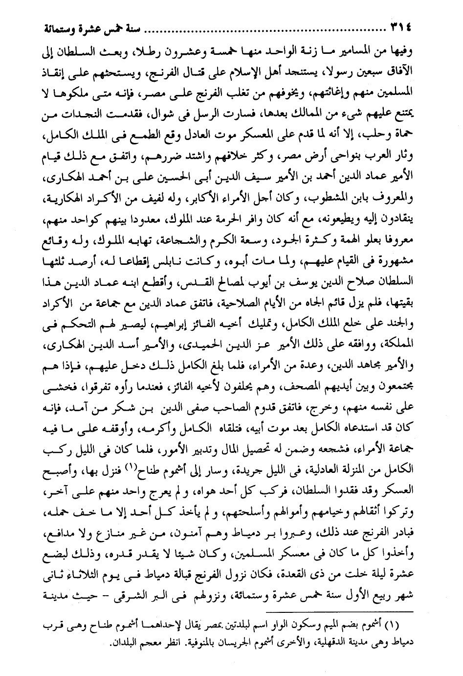 وفيهَا من المسامير مَا زنة الْوَاحِد مِنْهَا خَمْسَة وَعِشْرُونَ رطلا وَبعث السُّلْطَان إِلَى الْآفَاق سبعين رَسُولا يستنجد أهل الْإِسْلَام على قتال الفرنج ويستحثهم على إنقاذ الْمُسلمين مِنْهُم واغاثتهم ويخوفهم من تغلب الفرنج على مصر فَإِنَّهُ مَتى ملكوها لَا يمْتَنع عَلَيْهِم شَيْء من الممالك بعْدهَا فسارت الرُّسُل فِي شَوَّال فَقدمت النجدات من حماة وحلب إِلَّا أَنه لما قدم على المعسكر موت الْعَادِل وَقع الطمع فِي الْملك الْكَامِل وثار الْعَرَب بنواحي أَرض مصر وَكثر خلافهم وَاشْتَدَّ ضررهم وَاتفقَ مَعَ ذَلِك قيام الْأَمِير عماد الدّين أَحْمد بن الْأَمِير سيف الدّين أبي الْحسن عَليّ بن أَحْمد الهكاري وَالْمَعْرُوف بِابْن المشطوب وَكَانَ أجل الْأُمَرَاء الأكابر وَله لفيف من الأكراد الهكارية ينقادون إِلَيْهِ ويطيعونه مَعَ أَنه كَانَ وافر الْحُرْمَة عِنْد الْمُلُوك معدودا بَينهم كواحد مِنْهُم مَعْرُوفا بعلو الهمة وَكَثْرَة الْجُود وسعة الْكَرم والشجاعة تهابه الْمُلُوك وَله وقائع مَشْهُورَة فِي الْقيام عَلَيْهِم وَلما مَاتَ أَبوهُ وَكَانَت نابلس إقطاعا لَهُ أرصد ثلثهَا السُّلْطَان صَلَاح الدّين يُوسُف بن أَيُّوب لمصَالح الْقُدس وأقطع ابْنه عماد الدّين هَذَا بقيتها فَلم يزل قَائِم الجاه من الْأَيَّام الصلاحية فاتفق عماد الدّين مَعَ جمَاعَة من الأكراد والجند على خلع الْملك الْكَامِل وتمليك أَخِيه الفائز إِبْرَاهِيم ليصير لَهُم التحكم فِي المملكة وَوَافَقَهُ على ذَلِك الْأَمِير عز الدّين الْحميدِي والأمير أَسد الدّين الهكاري والأمير مُجَاهِد الدّين وعدة من الْأُمَرَاء فَلَمَّا بلغ الْكَامِل ذَلِك دخل عَلَيْهِم فَإِذا هم مجتمعون وَبَين أَيْديهم الْمُصحف وهم يحلفُونَ لِأَخِيهِ الفائز فعندما رَأَوْهُ تفَرقُوا فخشي على نَفسه مِنْهُم وَخرج فاتفق قدوم الصاحب صفي الدّين بن شكر من آمد فَإِنَّهُ كَانَ قد استدعاه الْكَامِل بعد موت أَبِيه فَتَلقاهُ الْكَامِل وأكرمه وَأَوْقفهُ على مَا فِيهِ جمَاعَة الْأُمَرَاء فشجعه وَضمن لَهُ تَحْصِيل المَال وتدبير الْأُمُور فَلَمَّا كَانَ فِي اللَّيْل ركب الْكَامِل من الْمنزلَة العادلية فِي اللَّيْل جَرِيدَة وَسَار إِلَى أشموم طناح فَنزل بهَا وَأصْبح الْعَسْكَر وَقد فقدوا السُّلْطَان فَركب كل أحد هَوَاهُ وَلم يعرج وَاحِد مِنْهُم على آخر وَتركُوا أثقالهم وخيامهم وَأَمْوَالهمْ وأسلحتهم وَلم يَأْخُذ كل أحد إِلَّا مَا خف حمله فبادر الفرنج عِنْد ذَلِك وعبروا بر دمياط وهم آمنون من غير مُنَازع وَلَا مدافع وَأخذُوا كل مَا كَانَ فِي معسكر الْمُسلمين وَكَانَ شَيْئا لَا يقدر قدره وَذَلِكَ لبضع عشرَة لَيْلَة خلت من ذِي الْقعدَة فَكَانَ نزُول الفرنج قبالة دمياط فِي يَوْم الثُّلَاثَاء ثَانِي شهر ربيع الأول سنة خمس عشرَة وسِتمِائَة ونزولهم فِي الْبر الشَّرْقِي حَيْثُ مَدِينَة