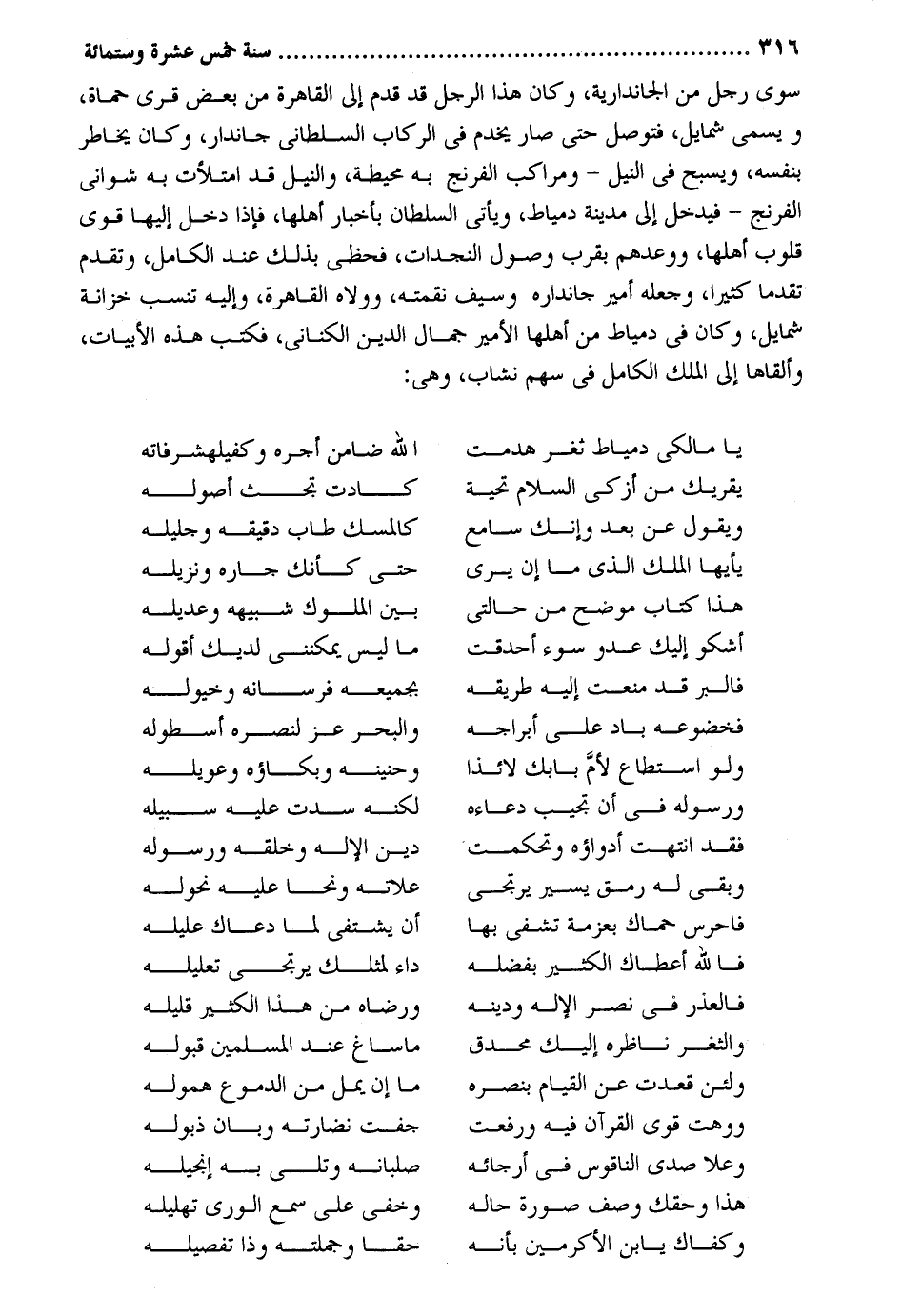 سوى رجل من الجاندارية وَكَانَ هَذَا الرجل قد قدم إِلَى الْقَاهِرَة من بعض قرى حماة وَيُسمى شمايل فتوصل حَتَّى صَار يخْدم فِي الركاب السلطاني جاندار وَكَانَ يخاطر بِنَفسِهِ ويسبح فِي النّيل ومراكب الفرنج بِهِ مُحِيطَة والنيل قد امْتَلَأت بِهِ شواني الفرنج فَيدْخل إِلَى مَدِينَة دمياط وَيَأْتِي السُّلْطَان بأخبار أَهلهَا فَإِذا دخل إِلَيْهَا قوى قُلُوب أَهلهَا وَوَعدهمْ بِقرب وُصُول النجدات فحظي بذلك عِنْد الْكَامِل وَتقدم تقدما كثيرا وَجعله أَمِير جانداره وَسيف نقمته وولاه الْقَاهِرَة وَإِلَيْهِ تنْسب خزانَة شمايل وَكَانَ فِي دمياط من أَهلهَا الْأَمِير جمال الدّين الْكِنَانِي فَكتب هَذِه الأبيات وَأَلْقَاهَا إِلَى الْملك الْكَامِل فِي سهم نشاب وهى: يَا مالكي دمياط ثغر هدمت الله ضَامِن أجره وكفيلهشرفاته يقريك من أزكى السَّلَام تَحِيَّة كَادَت تجث أُصُوله وَيَقُول عَن بعد وَإنَّك سامع كالمسك طَابَ دقيقه وجليله يأيها الْملك الَّذِي مَا إِن يرى حَتَّى كَأَنَّك جَاره ونزيله هَذَا كتاب موضح من حالتي بِي الْمُلُوك شبيهه وعديله أَشْكُو إِلَيْك عَدو سوء أحدقت مَا لَيْسَ يمكنني لديك أقوله فالبر قد منعت إِلَيْهِ طَرِيقه بِجَمِيعِهِ فرسانه وخيوله وَلَو اسْتَطَاعَ لأم بابك لائذا وحنينه وبكاؤه وعويله وَرَسُوله فِي أَن تجيب دعاءه لكنه سدت عَلَيْهِ سَبيله فقد انْتَهَت أدواؤه وتحكمت دين الْإِلَه وخلقه وَرَسُوله وَبَقِي لَهُ رَمق يسيريرتجى علاته ونحا عَلَيْهِ نحوله فاحرس حماك بعزمة تشفى بهَا أَن يشتفي لما دعَاك عليله فَالله أَعْطَاك الْكثير بفضله دَاء لمثلك يرتجى تَعْلِيله فالعذر فِي نصر الْإِلَه وَدينه وَرضَاهُ من هَذَا الْكثير قَلِيله والثغر ناظره إِلَيْك محدق مَا سَاغَ عِنْد الْمُسلمين قبُوله وَلَئِن قعدت عَن الْقيام بنصره مَا إِن يمل من الدُّمُوع هموله ووهت قوى الْقُرْآن فِيهِ وَرفعت جَفتْ نضارته وَبَان ذبوله وَعلا صدى الناقوس فِي أرجائه صلبانه وتلى بِهِ إنجيله هَذَا وحقك وصف صُورَة حَاله وخفي على سمع الورى تهليله (وَكَفاك يَابْنَ الأكرمين بِأَنَّهُ حَقًا وَجُمْلَته وَذَا تَفْصِيله حقق رَجَاء فِيك يَا من ام تجب أضحى عَلَيْك من الورى تعويله واذخر ليَوْم فعلا صَالحا أبدا لراجي جوده تأميله)
