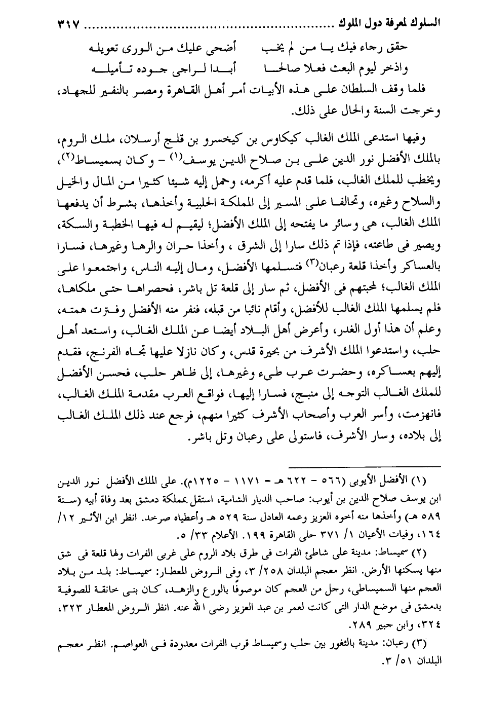 فَلَمَّا وقف السُّلْطَان على هَذِه الأبيات أَمر أهل الْقَاهِرَة ومصر بالنفير للْجِهَاد وَخرجت السّنة وَالْحَال على ذَلِك. وفيهَا استدعى الْملك الْغَالِب كيكاوس بن كيخسرو بن قلج أرسلان ملك الرّوم بِالْملكِ الْأَفْضَل نور الدّين عَليّ بن صَلَاح الدّين يُوسُف وَكَانَ بسميساط ويخطب للْملك الْغَالِب فَلَمَّا قدم عَلَيْهِ أكْرمه وَحمل إِلَيْهِ شَيْئا كثيرا من المَال وَالْخَيْل وَالسِّلَاح وَغَيره وتحالفا على الْمسير إِلَى المملكة الحلبية وَأَخذهَا بِشَرْط أَن يَدْفَعهَا الْملك الْغَالِب هِيَ وَسَائِر مَا يَفْتَحهُ إِلَى الْملك الْأَفْضَل ليقيم لَهُ فِيهَا الْخطْبَة وَالسِّكَّة وَيصير فِي طَاعَته فَإِذا تمّ ذَلِك سارا إِلَى الشرق وأخذا حران والرها وَغَيرهَا فسارا يالعساكر وأخذا قلعة رعبان فتسلمها الْأَفْضَل وَمَال إِلَيْهِ النَّاس واجتمعوا على الْملك الْغَالِب لمحبتهم فِي الْأَفْضَل ثمَّ سَار إِلَى قلعة تل بَاشر فحصراها حَتَّى ملكاها فَلم يُسَلِّمهَا الْملك الْغَالِب للأفضل وَأقَام نَائِبا من قبله فنفر مِنْهُ الْأَفْضَل وفترت همته وَعلم أَن هذأ أول الْغدر وَأعْرض أهل الْبِلَاد أَيْضا عَن الْملك الْغَالِب واستعد أهل حلب واستدعوا الْملك الْأَشْرَف من بحيرة قدس وَكَانَ نازلا عَلَيْهَا تجاه الفرنج فَقدم إِلَيْهِم بعساكره وَحَضَرت عرب طَيء وَغَيرهَا إِلَى ظَاهر حلب فَحسن الْأَفْضَل للْملك الْغَالِب التَّوَجُّه إِلَى منبج فسارا إِلَيْهَا فواقع الْعَرَب مُقَدّمَة الْملك الْغَالِب إِلَى بِلَاده وَسَار الْأَشْرَف فاستولى على رعبان وتل بَاشر.