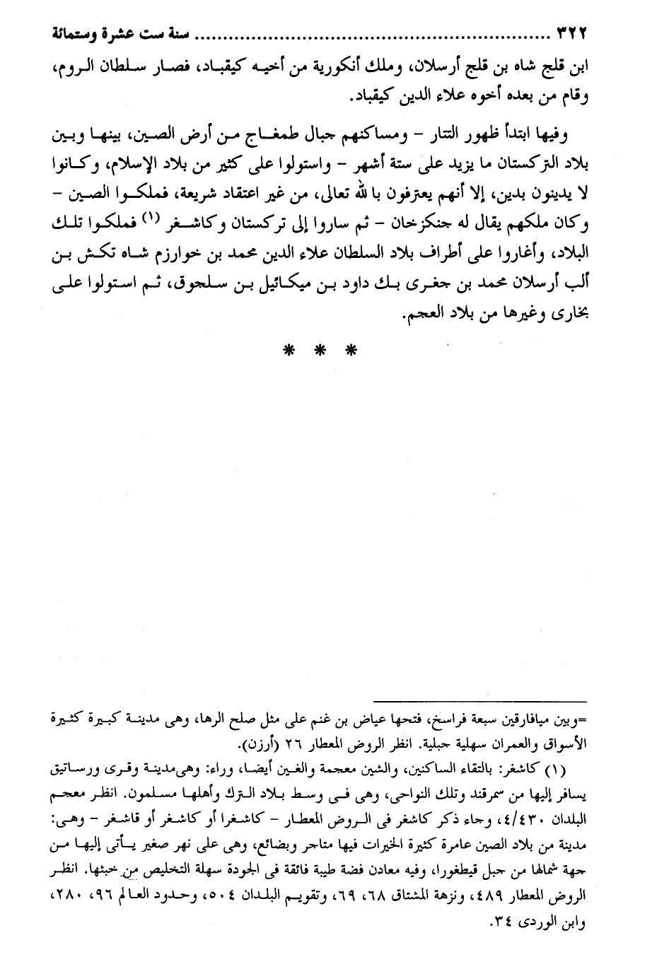 ابْن قلج شاه بن قلج أرسلان وَملك أنكورية من أَخِيه كيقباد فَصَارَ سُلْطَان الرّوم وَقَامَ من بعده أَخُوهُ عَلَاء الدّين كيقباد. وفيهَا ابْتَدَأَ ظُهُور التتار - ومساكنهم جبال طمغاج من أَرض الصين بَينهَا وَبَين بِلَاد التركستان مَا يزِيد على سِتَّة أشهر - واستولوا على كثير من بِلَاد الْإِسْلَام وَكَانُوا لَا يدينون بدين إِلَّا أَنهم يعْرفُونَ بِاللَّه تَعَالَى من غير اعْتِقَاد شَرِيعَة فملكوا الصين - وَكَانَ ملكهم يُقَال لَهُ جنكزخان - ثمَّ سَارُوا إِلَى تركستان وكاشغر فملكوا تِلْكَ الْبِلَاد وأغاروا على أَطْرَاف بِلَاد السُّلْطَان عَلَاء الدّين مُحَمَّد بن خوارزم شاه تكش بن ألب أرسلان مُحَمَّد بن جغري بك دَاوُد بن مِيكَائِيل بن سلجوق ثمَّ استولوا على بخاري وَغَيرهَا من بِلَاد الْعَجم.