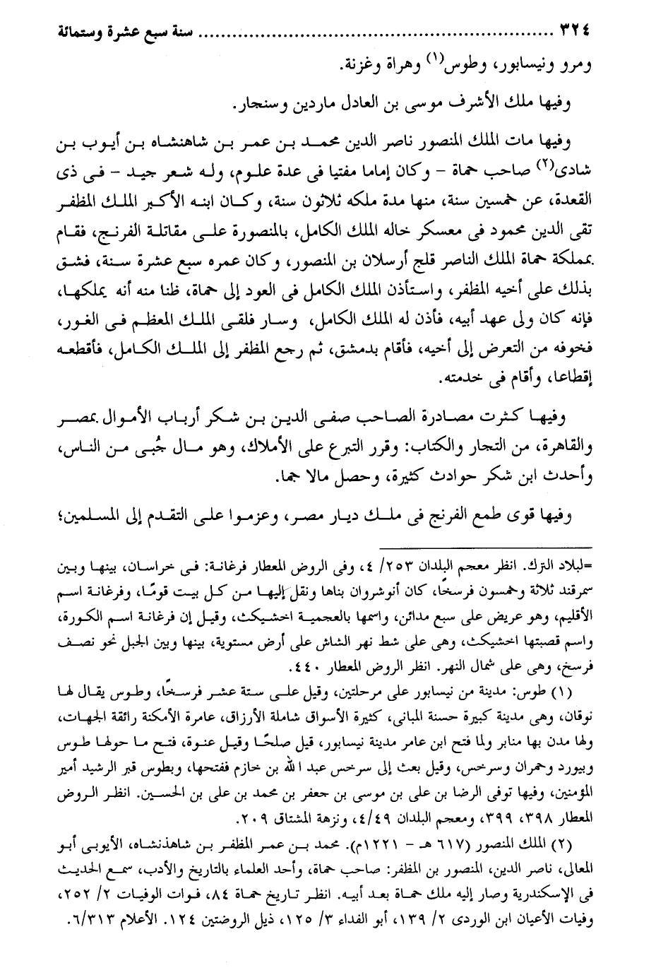 ومرو ونيسابور وطوس وهراة وغزنة. وفيهَا ملك الْأَشْرَف مُوسَى بن الْعَادِل ماردين وسنجار. وفيهَا مَاتَ الْملك الْمَنْصُور نَاصِر الدّين مُحَمَّد بن عمر بن شاهنشاه بن أَيُّوب بن شادي صَاحب حماة - وَكَانَ إِمَامًا مفتياً فِي عدَّة عُلُوم وَله شعر جيد - فِي ذِي الْقعدَة عَن خمسين سنة مِنْهَا مُدَّة ملكه ثَلَاثُونَ سنة وَكَانَ ابْنه الْأَكْبَر الْملك المظفر تَقِيّ الدّين مَحْمُود فِي معسكر خَاله الْملك الْكَامِل بالمنصورة على مقاتلة الفرنج فَقَامَ بمملكة حماة الْملك النَّاصِر قلج أرسلان بن الْمَنْصُور وَكَانَ عمره سبع عشرَة سنة فشق بذلك على أَخِيه المظفر وَاسْتَأْذَنَ الْملك الْكَامِل فِي الْعود إِلَى حماة ظنا مِنْهُ أَنه يملكهَا فَإِنَّهُ كَانَ ولي عهد أَبِيه فَأذن لَهُ الْملك الْكَامِل وَسَار فلقى الْملك الْمُعظم فِي الْغَوْر فخوفه من التَّعَرُّض إِلَى أَخِيه فَأَقَامَ بِدِمَشْق ثمَّ رَجَعَ المظفر إِلَى الْملك الْكَامِل فأقطعه إقطاعاً وَأقَام فِي خدمته. وفيهَا كثرت مصادرة الصاحب صفي الدّين بن شكر أَرْبَاب الْأَمْوَال بِمصْر والقاهرة من التُّجَّار وَالْكتاب: وَقرر التَّبَرُّع على الْأَمْلَاك وَهُوَ مَال جبي من النَّاس وأحدث ابْن شكر حوادث كَثِيرَة وَحصل مَالا جماً. وفيهَا قوي طمع الفرنج فِي ملك ديار مصر وعزموا على التَّقَدُّم إِلَى الْمُسلمين