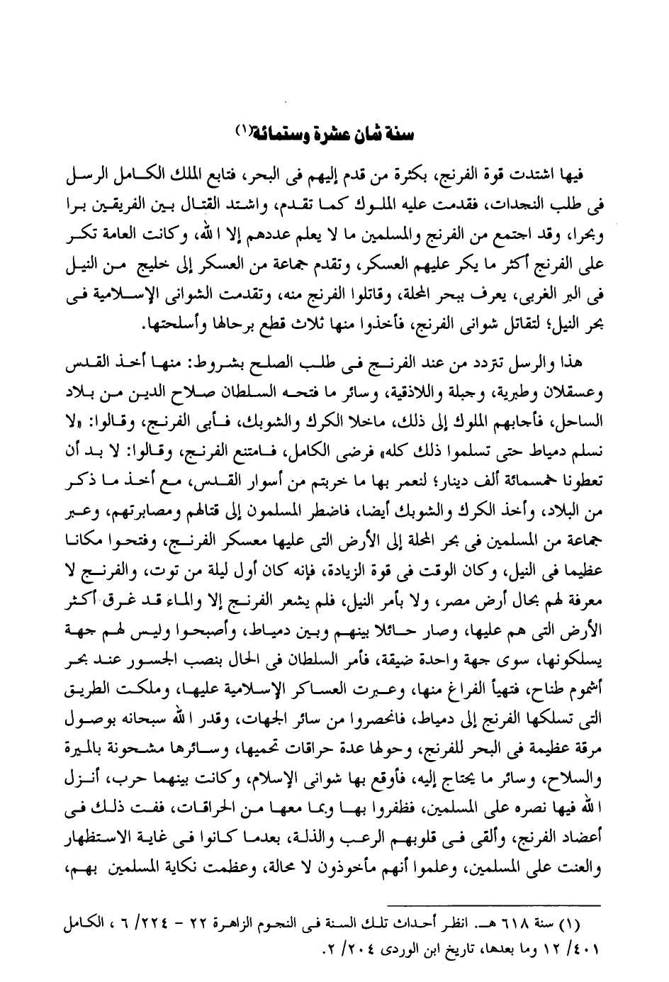 سنة ثَمَان عشرَة وسِتمِائَة فِيهَا اشتدت قُوَّة الفرنج بِكَثْرَة من قدم إِلَيْهِم فِي الْبَحْر فتابع الْملك الْكَامِل الرُّسُل فِي طلب النجدات فَقدمت عَلَيْهِ الْمُلُوك كَمَا تقدم وَاشْتَدَّ الْقِتَال بَين الْفَرِيقَيْنِ برا وبحراً وَقد اجْتمع من الفرنج وَالْمُسْلِمين مَا لَا يعلم عَددهمْ إِلَّا الله وَكَانَت الْعَامَّة تكر على الفرنج أَكثر مَا يكر عَلَيْهِم الْعَسْكَر وَتقدم جمَاعَة من الْعَسْكَر إِلَى خليج من النّيل فِي الْبر الغربي يعرف ببحر الْمحلة وقاتلوا الفرنج مِنْهُ وَتَقَدَّمت الشواني الإسلامية فِي بَحر النّيل لتقاتل شواني الفرنج فأخفوا مِنْهَا ثَلَاث قطع برحالها وأسلحتها. هَذَا وَالرسل تَزْدَدْ من عِنْد الفرنج فِي طلب الصُّلْح بِشُرُوط: مِنْهَا أَخذ الْقُدس وعسقلان وطبرية وجبلة واللاذقية وَسَائِر مَا فَتحه السُّلْطَان صَلَاح الدّين من بِلَاد السَّاحِل فأجابهم الْمُلُوك إِلَى ذَلِك ماخلا الكرك والشوبك فَأبى الفرنج وَقَالُوا: لَا نسلم دمياط حَتَّى تسلموا ذَلِك كُله فَرضِي الْكَامِل فَامْتنعَ الفرنج وَقَالُوا: لَا بُد أَن تعطونا خَمْسمِائَة ألف دِينَار لنعمر بهَا مَا خربتم من أسوار الْقُدس مَعَ أَخذ مَا ذكر من الْبِلَاد وَأخذ الكرك والشوبك أَيْضا فاضطر الْمُسلمُونَ إِلَى قِتَالهمْ ومصابرتهم وَعبر جمَاعَة من الْمُسلمين فِي بَحر الْمحلة إِلَى الأَرْض الَّتِي عَلَيْهَا معسكر الفرنج وفتحوا مَكَانا عَظِيما فِي النّيل وَكَانَ الْوَقْت فِي قُوَّة الزِّيَادَة فَإِنَّهُ كَانَ أول لَيْلَة من توت والفرنج لَا معرفَة لَهُم بِحَال أَرض مصر وَلَا بِأَمْر النّيل فَلم يشْعر الفرنج إِلَّا وَالْمَاء قد غرق أَكثر الأَرْض الَّتِي هم عَلَيْهَا وَصَارَ حَائِلا بَينهم وَبَين دمياط وَأَصْبحُوا وَلَيْسَ لَهُم جِهَة يسلكونها سوي جِهَة وَاحِدَة ضيقَة فَأمر السُّلْطَان فِي الْحَال بِنصب الجسور عِنْد بَحر أشموم طناح فتهيأ الْفَرَاغ مِنْهَا وعبرت العساكر الإسلامية عَلَيْهَا وملكت الطَّرِيق الَّتِي تسلكها الفرنج إِلَى دمياط فانحصروا من سَائِر الْجِهَات وَقدر الله سُبْحَانَهُ بوصول فرقة عَظِيمَة فِي الْبَحْر للفرنج وحولها عدَّة حراقات تحميها وسائرها مشحونة بالميرة وَالسِّلَاح وَسَائِر مَا يحْتَاج إِلَيْهِ فأوقع بهَا شواني الْإِسْلَام وَكَانَت بَينهمَا حَرْب أنزل الله فِيهَا نَصره على الْمُسلمين فظفروا بهَا وَبِمَا مَعهَا من الحراقات ففت ذَلِك فِي أعضاد الفرنج وَأُلْقِي فِي قُلُوبهم الرعب والذلة بَعْدَمَا كَانُوا فِي غَايَة الِاسْتِظْهَار والعنت على الْمُسلمين وَعَلمُوا أَنهم مأخوذون لَا محَالة وعظمت نكاية الْمُسلمين بهم