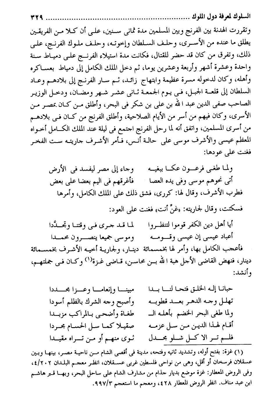 وتقررت الْهُدْنَة بَين الفرنج وَبَين الْمُسلمين مُدَّة ثَمَانِي سِنِين على أَن كلا من الْفَرِيقَيْنِ يُطلق مَا عِنْده من الأسرى وَحلف السُّلْطَان وَإِخْوَته وَحلف مُلُوك الفرنج على ذَلِك وتفرق من كَانَ قد حضر لِلْقِتَالِ فَكَانَت مُدَّة اسْتِيلَاء الفرنج على دمياط سنة وَاحِدَة وَعشرَة أشهر وَأَرْبَعَة وَعشْرين يَوْمًا ثمَّ دخل الْملك الْكَامِل إِلَى دمياط بعساكره وَأَهله وَكَانَ لدُخُوله مَسَرَّة عَظِيمَة وابتهاج زَائِد ثمَّ سَار الفرنج إِلَى بِلَادهمْ وَعَاد السُّلْطَان إِلَى قلعة الْجَبَل فِي يَوْم الْجُمُعَة ثَانِي عشر شهر ومضان وَدخل الْوَزير الصاحب صفي الدّين عبد الله بن عَليّ بن شكر فِي الْبَحْر وَأطلق من كَانَ بِمصْر من الأسرى وَكَانَ فيهم من أسر من الْأَيَّام الصلاحية وَأطلق الفرنج من كَانَ فِي بِلَادهمْ من أسرى الْمُسلمين وَاتفقَ أَنه لما رَحل الفرنج اجْتمع فِي لَيْلَة عِنْد الْملك الْكَامِل أَخَوَاهُ الْمُعظم عِيسَى والأشرف مُوسَى على حَالَة أنس فَأمر الْأَشْرَف جَارِيَته سِتّ الْفَخر فغنت على عودهَا: وَلما طَغى فِرْعَوْن عكا ببغيه وَجَاء إِلَى مصر ليفسد فِي الأَرْض أَتَى نحوهم مُوسَى وَفِي يَده الْعَصَا فأغرقهم فِي اليم بَعْضًا على بعض فطرب الْأَشْرَف وَقَالَ لَهَا: كرري فشق ذَلِك على الْملك الْكَامِل وأمرها فَسَكَتَتْ وَقَالَ لجاريته: غن أَنْت فغنت على الْعود: أيا أهل دين الْكفْر قومُوا لتنظروا لما قد جرى فِي وقتنا وتجددا أعباد عِيسَى إِن عِيسَى وَقَومه ومُوسَى جَمِيعًا ينْصرُونَ مُحَمَّدًا فأعجب الْكَامِل بهَا وَأمر لَهَا بِخَمْسِمِائَة دِينَار ولجارية أَخِيه الْأَشْرَف بِخَمْسِمِائَة دِينَار فَنَهَضَ القَاضِي الْأَجَل هبة الله بن محَاسِن قَاضِي غَزَّة وَكَانَ فِي جُمْلَتهمْ وانشد: حبانا إِلَه الْخلق فتحنا لنا بدا مُبينًا وإنعاماً وَعزا مجددا وَلما طَغى الْبَحْر الْخصم بأَهْله ال - طغاة وأضحى بالمراكب مزبدا أَقَامَ لهَذَا الدّين من سل عزمه صقيلاً كَمَا سل الحسام المجردا فَلم تَرَ إِلَّا كل شلو مجدل ثوى مِنْهُم أَو من ترَاهُ مُقَيّدا
