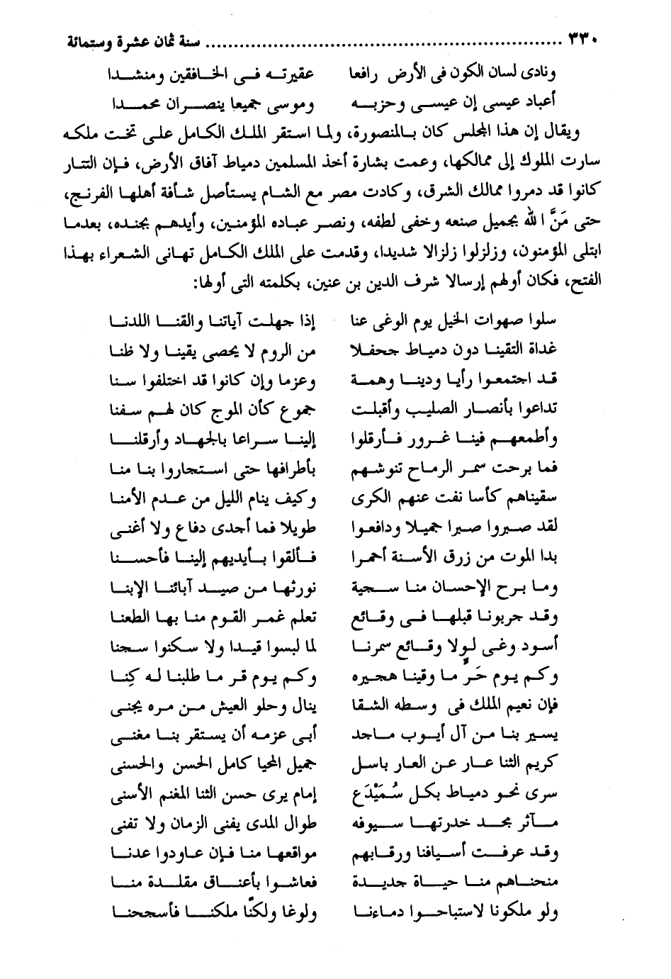 ونادى لِسَان الْكَوْن فِي الأَرْض رَافعا عقيرته فِي الْخَافِقين ومنشدا أعباد عِيسَى إِن عِيسَى وَحزبه ومُوسَى جَمِيعًا ينصران مُحَمَّدًا وَيُقَال إِن هَذَا الْمجْلس كَانَ بالمنصورة وَلما اسْتَقر الْملك الْكَامِل على تخت ملكه سَارَتْ الْمُلُوك إِلَى ممالكها وعمت بِشَارَة أَخذ الْمُسلمين دمياط أَفَاق الأَرْض فَإِن التتار كَانُوا قد دمروا ممالك الشرق وكادت مصر مَعَ الشَّام يستأصل شأفة أَهلهَا الفرنج حَتَّى من الله بجميل صنعه وخفي لطفه وَنصر عباده الْمُؤمنِينَ وأيدهم بجنده بَعْدَمَا ابتلى الْمُؤْمِنُونَ وزلزلوا زلزالاً شَدِيدا وقدمت على الْملك الْكَامِل تهاني الشُّعَرَاء بهَا الْفَتْح فَكَانَ أَوَّلهمْ إرْسَالًا شرف الدّين بن عنين بكلمته الَّتِي أَولهَا: سلوا صهوات الْخَيل يَوْم الوغى عَنَّا إِذا جهلت آيَاتنَا والقنا اللدنا غَدَاة الْتَقَيْنَا دون دمياط جحفلاً من الرّوم لَا يُحْصى يَقِينا وَلَا ظنا قد اجْتَمعُوا رَأيا وديناً وهمة وعزماً وَإِن كَانُوا قد اخْتلفُوا سنا وأطمعهم فِينَا غرور فأرقلوا إِلَيْنَا سرَاعًا بِالْجِهَادِ وأرقلنا فَمَا بَرحت سمر الرماح تنوشهم بأطرافها حَتَّى استجاروا بِنَا منا سقيناهم كأساً نفت عَنْهُم الْكرَى وَكَيف ينَام اللَّيْل من عدم الأمنا لقد صَبَرُوا صبرا جميلاً ودافعوا طَويلا فَمَا أجدى دفاع وَلَا أغْنى بِمَا الْمَوْت من زرق الأسنة أحمرا فَألْقوا بِأَيْدِيهِم إِلَيْنَا فأحسنا وَمَا برح الْإِحْسَان منا سجية نورثها من صيد آبَائِنَا الإبنا وَقد جربونا قبلهَا فِي وقائع تعلم غمر الْقَوْم منا بهَا الطعنا أسود وغى لَوْلَا وقائع سمرنا لما لبسوا فِيمَا وَلَا سكنوا سجنا وَكم يَوْم حر مَا وقينا هجيره وَكم يَوْم قر مَا طلبنا لَهُ كُنَّا فَإِن نعيم الْملك فِي وَسطه الشقا ينَال وحلو الْعَيْش من مره يجنى يسير بِنَا من آل أَيُّوب ماجد أبي عزمه أَن يسْتَقرّ بِنَا مغنى كريم الثنا عَار عَن الْعَار باسل جميل الْمحيا كَامِل الْحسن وَالْحُسْنَى منحناهم منا حَيَاة جَدِيدَة فعاشوا بأعناق مقلدة منا وَلَو ملكونا لاستباحوا دمائنا ولوغا وَلَكنَّا ملكنا فأسجحنا