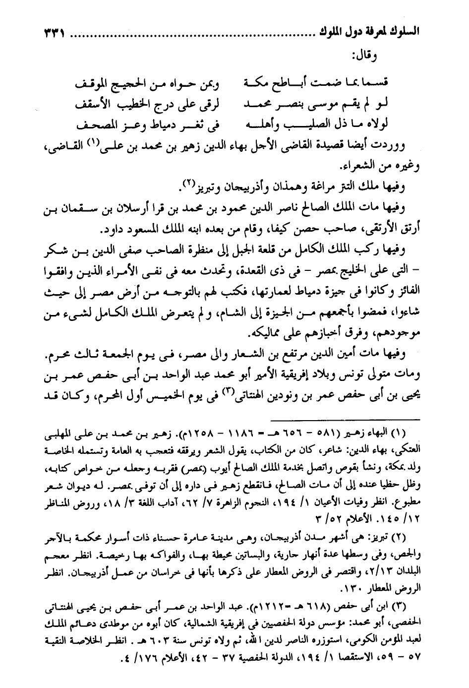 وَقَالَ: قسما بِمَا ضمت أباطح مَكَّة وبمن حواه من الحجيج الْموقف لَو لم يقم مُوسَى بنصر مُحَمَّد لرقى على درج الْخطب الأسقف لولاه مَا ذل الصَّلِيب وَأَهله فِي ثغر دمياط وَعز الْمُصحف ووردت أَيْضا قصيدة القَاضِي الْأَجَل بهاء الدّين زُهَيْر بن مُحَمَّد بن عَليّ القَاضِي وَغَيره من الشُّعَرَاء. وفيهَا ملك التتر مراغة وهمذان وأفربيجان وتبريز. وفيهَا مَاتَ الْملك الصَّالح نَاصِر الدّين مَحْمُود بن مُحَمَّد بن قرا أرسلان بن سقمان بن أرتق الأرتقي صَاحب حصن كيفا وَقَامَ من بعده ابْنه الْملك المسعود دَاوُد. وفيهَا ركب الْملك الْكَامِل من قلعة الْجَبَل إِلَى منظرة الصاحب صفي الدّين بن شكر - الَّتِي على الخليج بِمصْر - فِي ذِي الْقعدَة وتحدث مَعَه فِي نفي الْأُمَرَاء الَّذين وافقوا الفائز وَكَانُوا فِي جيزة دمياط لعمارتها فَكتب لَهُم بالتوجه من أَرض مصر إِلَى حَيْثُ شَاءُوا فَمَضَوْا بأجمعهم من الجيزة إِلَى الشَّام وَلم يتَعَرَّض الْملك الْكَامِل لشَيْء من موجودهم وَفرق أخبازهم على مماليكه. وفيهَا مَاتَ أَمِين الدّين مُرْتَفع بن الشعار وَالِي مصر فِي يَوْم الْجُمُعَة ثَالِث محرم. وَمَات مُتَوَلِّي تونس وبلاد إفريقية الْأَمِير أَبُو مُحَمَّد عبد الْوَاحِد بن أبي حَفْص عمر بن يحيى بن أبي حَفْص عمر بن ونودين الهنتاتي فِي يَوْم الْخَمِيس أول الْمحرم وَكَانَ قد