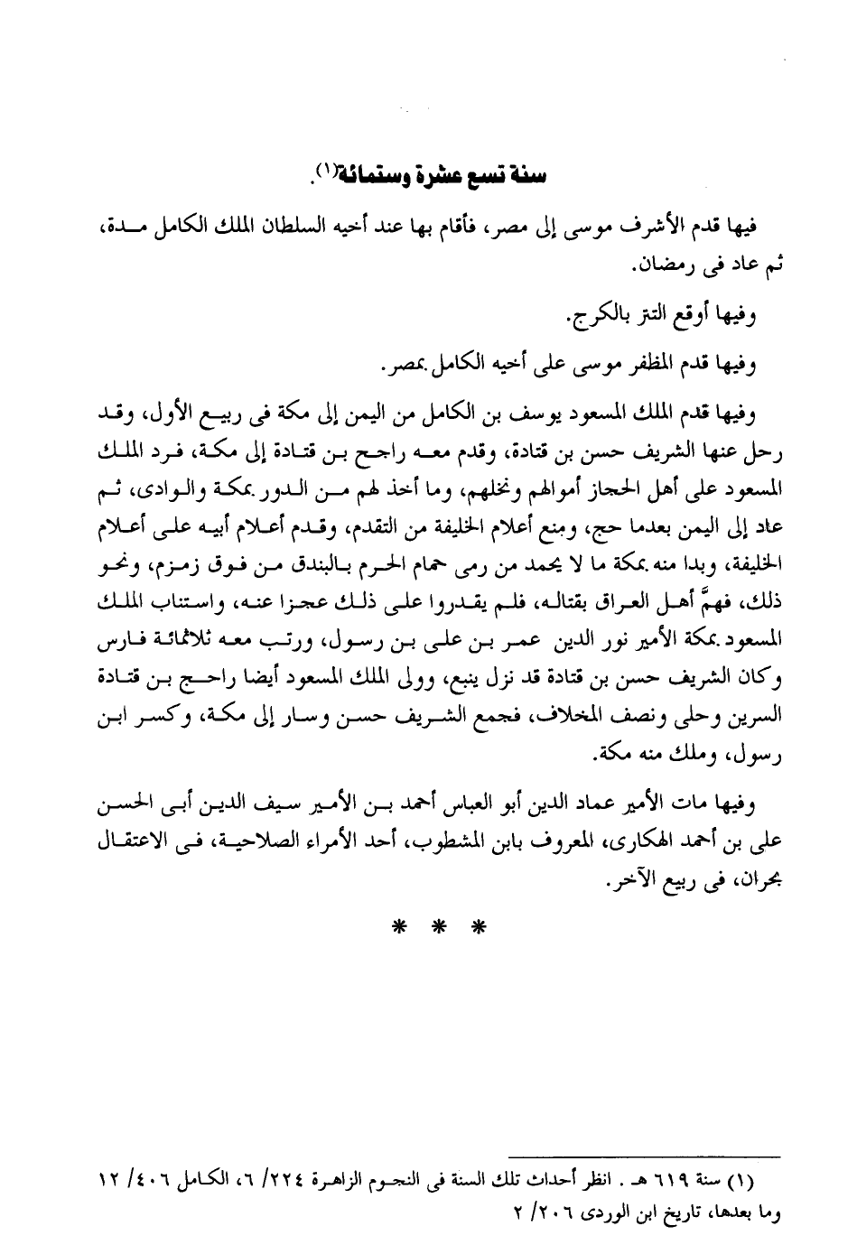 سنة تسع عشرَة وسِتمِائَة فِيهَا قدم الْأَشْرَف مُوسَى إِلَى مصر فَأَقَامَ بهَا عِنْد أَخِيه السُّلْطَان الْملك الْكَامِل مُدَّة ثمَّ عَاد فِي رَمَضَان. وفيهَا أوقع التتر بالكرج. وفيهَا قدم الْملك المسعود يُوسُف بن الْكَامِل من الْيمن إِلَى مَكَّة فِي ربيع الأول وَقد وَحل عَنْهَا الشريف حسن بن قَتَادَة وَقدم مَعَه رَاجِح بن قَتَادَة إِلَى مَكَّة فَرد الْملك المسعود على أهل الْحجاز أَمْوَالهم ونخلهم وَمَا أَخذ لَهُم من الْحور بِمَكَّة والوادي ثمَّ عَاد إِلَى الْيمن بَعْدَمَا حج وَمنع أَعْلَام الْخَلِيفَة من التَّقَدُّم وَقدم أَعْلَام أَبِيه على أَعْلَام الْخَلِيفَة وبدا مِنْهُ بِمَكَّة مَا لَا يحمد من رمي حمام الْحرم بالبندق من فَوق زَمْزَم وَنَحْو ذَلِك فهم أهل الْعرَاق بقتاله فَلم يقدروا على ذَلِك عَجزا عَنهُ واستناب الْملك المسعود بِمَكَّة الْأَمِير نور الدّين عمر بن عَليّ بن رَسُول ورتب مَعَه ثَلَاثمِائَة فَارس وَكَانَ الشريف حسن بن قَتَادَة قد نزل يَنْبع وَولي الْملك المسعود أَيْضا راحج بن قَتَادَة السرين وحلى وَنصف المخلاف فَجمع الشريف حسن وَسَار إِلَى مَكَّة وَكسر ابْن رَسُول وَملك مِنْهُ مَكَّة. وفيهَا مَاتَ الْأَمِير عماد الدّين أَبُو الْعَبَّاس أَحْمد بن الْأَمِير سيف الدّين أبي الْحسن عَليّ بن أَحْمد الهكاري الْمَعْرُوف بِابْن المشطوب أحد الْأُمَرَاء الصلاحية فِي الاعتقال بحران فِي ربيع الآخر.