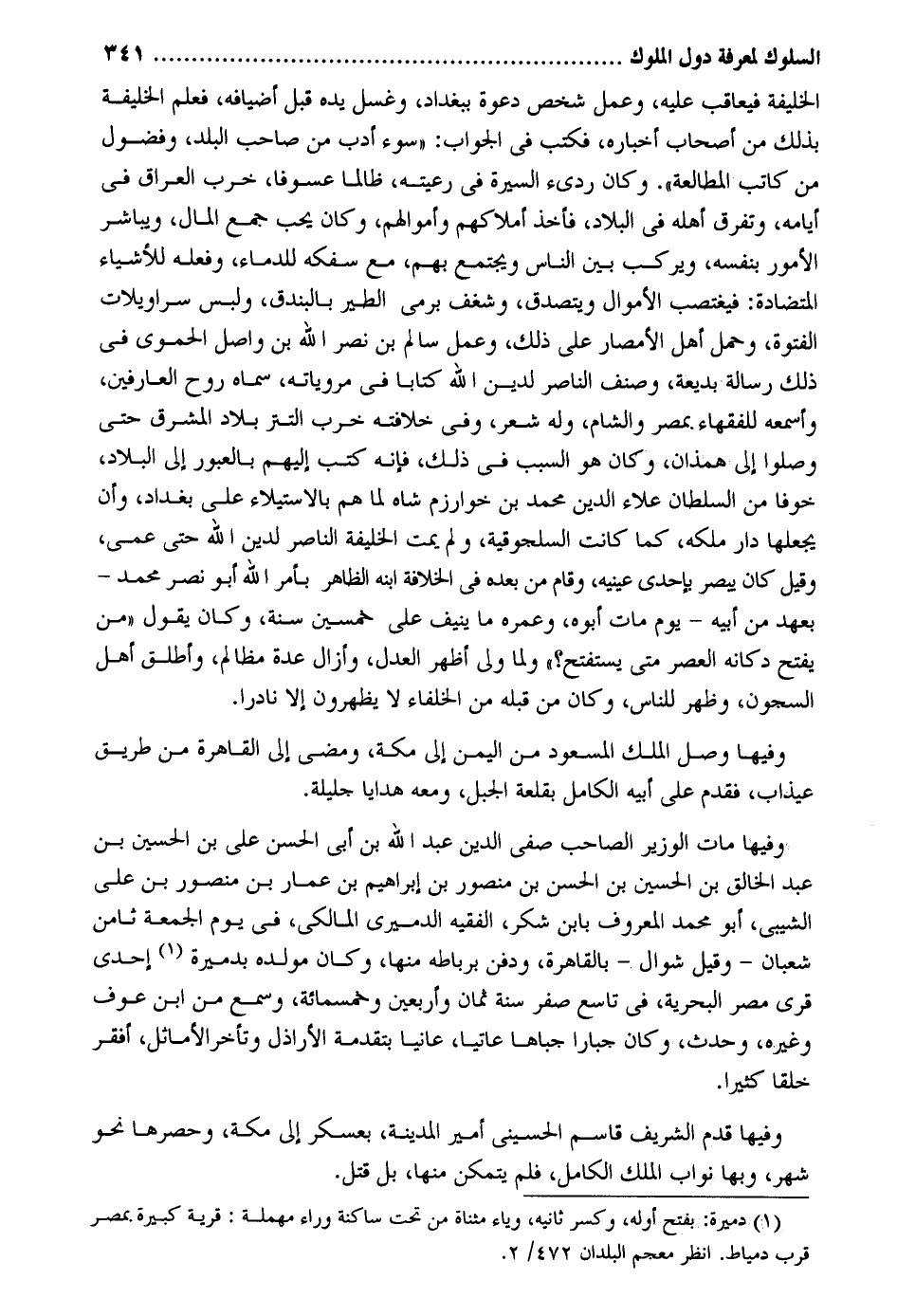 الخليقة فيعاقب عَلَيْهِ وَعمل شخص دَعْوَة بِبَغْدَاد وَغسل يَده قبل أضيافه فَعلم الْخَلِيفَة بذلك من أَصْحَاب أخباره فَكتب فِي الْجَواب: سوء أدب من صَاحب الْبَلَد وفضول من كَاتب المطالعة. وَكَانَ رَدِيء السِّيرَة فِي رَعيته ظَالِما عسوفاً خرب الْعرَاق فِي أَيَّامه وتفرق أَهله فِي الْبِلَاد فَأخذ أملاكهم وَأَمْوَالهمْ وَكَانَ يحب جمع المَال ويباشر الْأُمُور بِنَفسِهِ ويركب بَين النَّاس ويجتمع بهم مَعَ سفكه للدماء وَفعله للأشياء المتضادة: فيغتصب الْأَمْوَال وَيتَصَدَّق وشغف برمي الطير بالبندق وَلبس سراويلات الفتوة وَحمل أهل الْأَمْصَار على ذَلِك وَعمل سَالم بن نصر الله بن وَاصل الْحَمَوِيّ فِي ذَلِك رِسَالَة بديعة وصنف النَّاصِر لدين الله كتابا فِي مروياته سَمَّاهُ روح العارفين وأعده للفقهاء بِمصْر وَالشَّام وَله شعر وَفِي خِلَافَته خرب التتر بِلَاد الْمشرق حَتَّى وصلوا إِلَى همذان وَكَانَ هُوَ السَّبَب فِي ذَلِك فَإِنَّهُ كتب إِلَيْهِم بالعبور إِلَى الْبِلَاد خوفًا من السُّلْطَان عَلَاء الدّين مُحَمَّد بن خوارزم شاه لما هم بِالِاسْتِيلَاءِ على بَغْدَاد وَأَن يَجْعَلهَا دَار ملكه كَمَا كَانَت السلجوقية وَلم يمت الْخَلِيفَة النَّاصِر لدين الله حَتَّى عمي وَقيل كَانَ يبصر بِإِحْدَى عَيْنَيْهِ وَقَامَ من بعده فِي الْخلَافَة ابْنه الظَّاهِر بِأَمْر الله أَبُو نصر مُحَمَّد - بِعَهْد من أَبِيه - يَوْم مَاتَ أَبوهُ وعمره مَا ينيف على خمسين سنة وَكَانَ يَقُول من يفتح دكانه الْعَصْر مَتى يستفتح. وَلما ولي أظهر الْعدْل وأزال عدَّة مظالم وَأطلق أهل السجون وَظهر للنَّاس وَكَانَ من قبله من الْخُلَفَاء لَا يظهرون إِلَّا نَادرا. وفيهَا وصل الْملك المسعود من الْيمن إِلَى مَكَّة وَمضى إِلَى الْقَاهِرَة من طَرِيق عيذاب فَقدم على أَبِيه الْكَامِل بقلعة الْجَبَل وَمَعَهُ هَدَايَا جليلة. وفيهَا مَاتَ الْوَزير الصاحب صفي الدّين عبد الله بن أبي الْحسن عَليّ بن الْحُسَيْن بن عبد الْخَالِق بن الْحُسَيْن بن الْحسن بن مَنْصُور بن إِبْرَاهِيم بن عمار بن مَنْصُور بن عَليّ الشيبي أَبُو مُحَمَّد الْمَعْرُوف بِابْن شكر الْفَقِيه الدَّمِيرِيّ الْمَالِكِي فِي يَوْم الْجُمُعَة ثامن شعْبَان - وَقيل شَوَّال - بِالْقَاهِرَةِ وَدفن برباطه مِنْهَا وَكَانَ مولده بدميرة إِحْدَى قرى مصر البحرية فِي تَاسِع صفر سنة ثَمَان وَأَرْبَعين وَخَمْسمِائة وَجمع من ابْن عَوْف وَغَيره وَحدث وَكَانَ جباراً جباها عاتياً عانيا بتقدمة الأراذل وَتَأَخر الأماثل أفقر علقاً كثيرا. وفيهَا قدم الشريف قَاسم الْحُسَيْنِي أَمِير الْمَدِينَة بعسكر إِلَى مَكَّة وحصرها نَحْو شهر وَبهَا نواب الْملك الْكَامِل فَلم يتَمَكَّن مِنْهَا بل قتل.