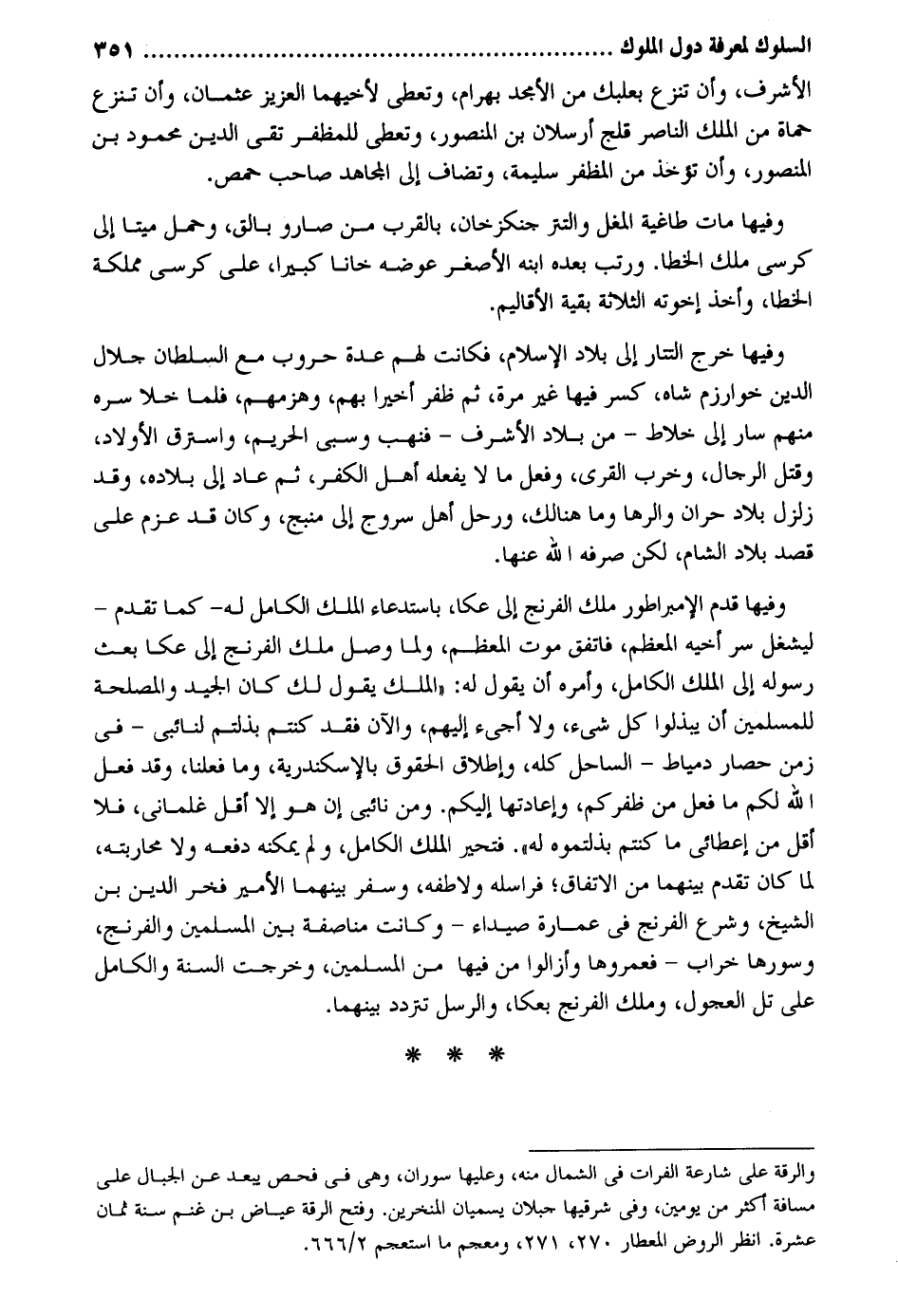 الْأَشْرَف وَأَن تنْزع بعلبك من الأمجد بهْرَام وتعطى لأخيهما الْعَزِيز عُثْمَان وَأَن تنْزع حماة من الْملك النَّاصِر قلج أرسلان بن الْمَنْصُور وتعطى للمظفر تَقِيّ الدّين مَحْمُود بن الْمَنْصُور وَأَن تُؤْخَذ من المظفر سليمَة وتضاف إِلَى الْمُجَاهِد صَاحب حمص. وفيهَا مَاتَ طاغية الْمغل والتتر جنكزخان بِالْقربِ من صارو بالق وَحمل مَيتا إِلَى كرْسِي ملك الخطا. ورتب بعده ابْنه الْأَصْغَر عوضه خَانا كَبِيرا على كرْسِي مملكة الخطا وَأخذ إخْوَته الثَّلَاثَة بَقِيَّة الأقاليم. وفيهَا خرج التتار إِلَى بِلَاد الْإِسْلَام فَكَانَت لَهُم عدَّة حروب مَعَ السُّلْطَان جلال الدّين خوارزم شاه كسر فِيهَا غير مرّة ثمَّ ظفر أخيراً بهم وَهَزَمَهُمْ فَلَمَّا خلا سره مِنْهُم سَار إِلَى خلاط - من بِلَاد الْأَشْرَف - فنهب وَسبي الْحَرِيم واسترق الْأَوْلَاد وَقتل الرِّجَال وَخرب الْقرى وَفعل مَا لَا يَفْعَله أهل الْكفْر ثمَّ عَاد إِلَى بِلَاده وَقد زلزل بِلَاد حران والرها وَمَا هُنَالك ورحل أهل سروج إِلَى منبج وَكَانَ قد عزم على قصد بِلَاد الشَّام لَكِن صرفه الله عَنْهَا. وفيهَا قُم الإمبراطور ملك الفرنج إِلَى عكا باستدعاء الْملك الْكَامِل لَهُ - كَمَا تقدم - ليشغل سر أَخِيه الْمُعظم فاتفق موت الْمُعظم وَلما وصل ملك الفرنج إِلَى عكا بعث رَسُوله إِلَى الْملك الْكَامِل وَأمره أَن يَقُول لَهُ: الْملك يَقُول لَك كَانَ الْجيد والمصلحة للْمُسلمين أَن يبلوا كل شَيْء وَلَا أجيء إِلَيْهِم والآن فقد كُنْتُم بذلتم لنائبي - فِي زمن حِصَار دمياط - السَّاحِل كُله وَإِطْلَاق الْحُقُوق بالإسكندرية وَمَا فعلنَا وَقد فعل الله لكم مَا فعل من ظفركم وإعادتها إِلَيْكُم. وَمن نائبي إِن هُوَ إِلَّا أقل غلماني فَلَا أقل من إعطائي مَا كُنْتُم بذلتموه لَهُ. فتحير الْملك الْكَامِل وَلم يُمكنهُ دَفعه وَلَا محاربته لما كَانَ تقدم بَينهمَا من الِاتِّفَاق فراسله ولاطفه وسفر بَينهمَا الْأَمِير فَخر الدّين بن الشَّيْخ وَشرع الفرنج فِي عمَارَة صيداء - وَكَانَت مُنَاصَفَة بَين الْمُسلمين والفرنج وسورها خراب - فعمروها وأزالوا من فِيهَا من الْمُسلمين وَخرجت السّنة والكامل على تل العجول وَملك الفرنج بعكا وَالرسل تَتَرَدَّد بَينهمَا.