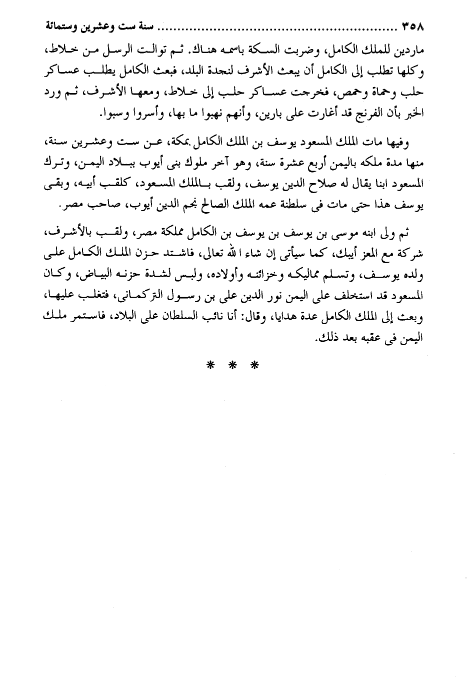 ماردين للْملك الْكَامِل وَضربت السِّكَّة بأحده هُنَاكَ. ثمَّ توالت الرُّسُل من خلاط وَكلهَا تطلب إِلَى الْكَامِل أَن يبْعَث الْأَشْرَف لنجدة الْبَلَد فَبعث الْكَامِل يطْلب عَسَاكِر حلب وحماة وحمص فَخرجت عَسَاكِر حلب إِلَى خلاط وَمَعَهَا الْأَشْرَف ثمَّ ورد الْخَبَر بِأَن الفرنج قد أغارت على بارين وَأَنَّهُمْ نهبوا مَا بهَا وأسروا وَسبوا. وفيهَا مَاتَ الْملك المسعود يُوسُف بن الْملك الْكَامِل بِمَكَّة عَن سِتّ وَعشْرين سنة مِنْهَا مُدَّة ملكه بِالْيمن أَربع عشرَة سنة وَهُوَ آخر مُلُوك بني أَيُّوب بِبِلَاد الْيمن وَترك المسعود ابْنا يُقَال لَهُ صَلَاح الدّين يُوسُف ولقب بِالْملكِ المسعود ولقب أَبِيه وَبَقِي يُوسُف هَذَا حَتَّى مَاتَ فِي سلطنة عَمه الْملك الصَّالح نجم الدّين أَيُّوب صَاحب مصر. ثمَّ ولي ابْنه مُوسَى بن يُوسُف بن يُوسُف بن الْكَامِل مملكة مصر ولقب بالأشرف شركَة مَعَ الْمعز أيبك كَمَا سَيَأْتِي إِن شَاءَ الله تَعَالَى فَاشْتَدَّ حزن الْملك الْكَامِل على وَلَده يُوسُف وتسلم مماليكه وخزائنه وَأَوْلَاده وَلبس لشدَّة حزنه الْبيَاض وَكَانَ المسعود قد اسْتخْلف على الْيمن نور الدّين عَليّ بن رَسُول التركماني فتغلب عَلَيْهَا وَبعث إِلَى الْملك الْكَامِل عدَّة هَدَايَا وَقَالَ: أَنا نَائِب السُّلْطَان على الْبِلَاد فاستمر ملك الْيمن فِي عقبه بعد ذَلِك.