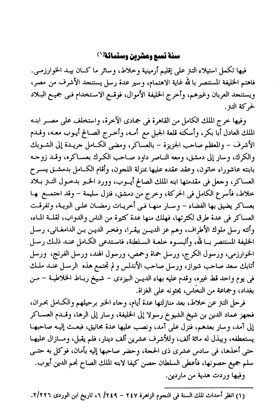 سنة تسع وَعشْرين وسِتمِائَة فيهمَا تكمل اسْتِيلَاء التتر على إقليم أرمينية وخلاط وَسَائِر مَا كَانَ بيد الْخَوَارِزْمِيّ. فاهتم الْخَلِيفَة الْمُسْتَنْصر بِاللَّه غَايَة الاهتمام وسير عدَّة رسل يستنجد الْأَشْرَف من مصر ويستنجد العربان وَغَيرهم وَأخرج الْخَلِيفَة الْأَمْوَال فَوَقع الِاسْتِخْدَام فِي جَمِيع الْبِلَاد لحركة التتر. وفيهَا خرج الْملك الْكَامِل من الْقَاهِرَة فِي جُمَادَى الْآخِرَة واستخلف على مصر ابْنه الْملك الْعَادِل أَبَا بكر وَأَسْكَنَهُ قلعة الْجَبَل مَعَ أمه واخرج الصَّالح أَيُّوب مَعَه وَقدم الْأَشْرَف - والمعظم صَاحب الجزيرة - بالعساكر وَمضى الْكَامِل جَرِيدَة إِلَى الشوبك والكرك وَسَار إِلَى دمشق وَمَعَهُ النَّاصِر دَاوُد صَاحب الكرك بعساكره وَقد زوجه بابنته عَاشُورَاء خاتون وَعقد عقده عَلَيْهَا بِمَنْزِلَة اللجون وَأقَام الْكَامِل بِدِمَشْق يسرح العساكر وَجعل فِي مقدمتها ابْنه الْملك الصَّالح أَيُّوب وَورد الْخَبَر بِدُخُول التتر بِلَاد خلاط فأسرع الْكَامِل فِي الْحَرَكَة وَخرج من دمشق فَنزل سليمَة - وَقد اجْتمع فِيهَا بعساكر يضيق بهَا الفضاء - وَسَار مِنْهَا فِي أخريات رَمَضَان على الْبَريَّة وَتَفَرَّقَتْ العساكر فِي عدَّة طرق لكثرتها فَهَلَك مِنْهَا عدَّة كَثِيرَة من النَّاس وَالدَّوَاب لقلَّة المَاء وأتته رسل مُلُوك الْأَطْرَاف وهم عز الدّين بيقرا وفخر الدّين بن الدَّامغَانِي رسل الْخَلِيفَة الْمُسْتَنْصر بِاللَّه وألبسوه خلعة السلطنة فاستدعي الْكَامِل عِنْد ذَلِك رسل الْخَوَارِزْمِيّ وَرَسُول الكرج ورسل حماة وحمص وَرَسُول الْهِنْد ورسل الفرنج ورسل أتابك سعد صَاحب شيراز ورسل صَاحب الأندلس وَلم تَجْتَمِع هَذِه الرُّسُل عِنْد ملك فِي يَوْم وَاحِد قطّ غَيره وَقدم عَلَيْهِ بهاء اللين اليزدي - شيخ رِبَاط الخلاطية - من بَغْدَاد وَجَمَاعَة من النخاس يحثونه على الْغُزَاة. فَرَحل التتر عَن خلاط بعد منازلتها عدَّة أَيَّام وَجَاء الْخَبَر برحيلهم والكامل بحران فَجهز عماد الدّين بن شيخ الشُّيُوخ رَسُولا إِلَى الْخَلِيفَة وَسَار إِلَى الرها وَقدم العساكر إِلَى آمد وَسَار بعدهمْ فَنزل على آمد وَنصب عَلَيْهَا عدَّة مجانيق فَبعث إِلَيْهِ صَاحبهَا يستعطفه ويبذل لَهُ مائَة ألف وللأشرف عشْرين ألف دِينَار فَلم يقبل ومازال عَلَيْهَا حَتَّى أَخذهَا فِي سادس عشري ذِي الْحجَّة وَحضر صَاحبهَا إِلَيْهِ بِأَمَان فَوكل بِهِ حَتَّى سلم جَمِيع حصونها فاعطى السُّلْطَان حصن كيفا لِابْنِهِ الْملك الصَّالح نجم الدّين أَيُّوب - وفيهَا وَردت هَدِيَّة من ماردين.