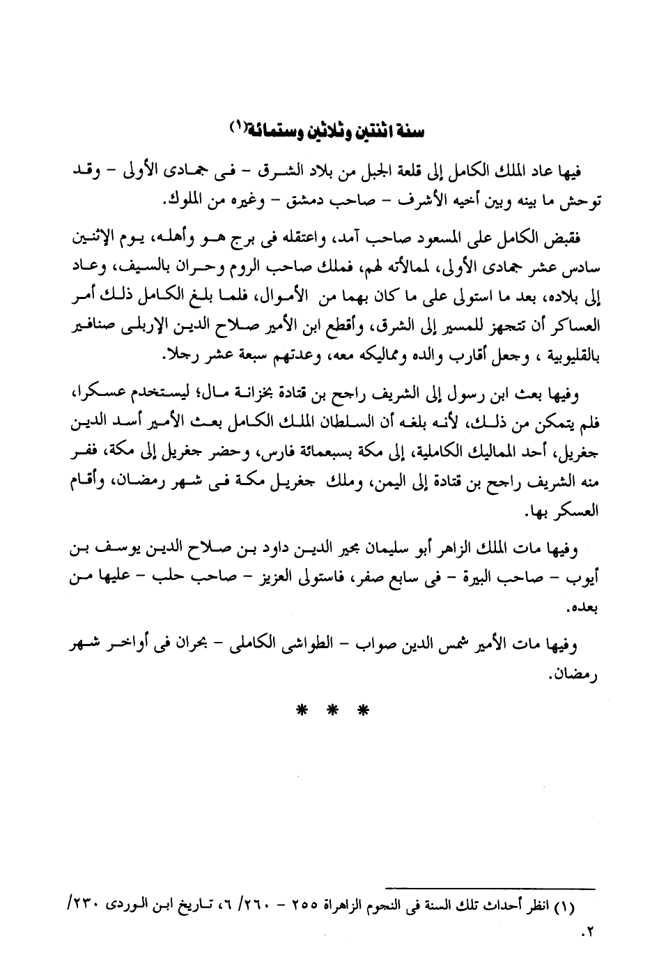 سنة اثْنَتَيْنِ وَثَلَاثِينَ وسِتمِائَة فِيهَا عَاد الْملك الْكَامِل إِلَى قلعة الْجَبَل من بِلَاد الشرق - فِي جُمَادَى الأولى - وَقد توحش مَا بَينه وَبَين أَخِيه الْأَشْرَف - صَاحب دمشق - وَغَيره من الْمُلُوك. فَقبض الْكَامِل على المسعود صَاحب آمد واعتقله فِي برج هُوَ وَأَهله يَوْم الِاثْنَيْنِ سادس عشر جُمَادَى الأولى لممالأته لَهُم فَملك صَاحب الرّوم وحران بِالسَّيْفِ وَعَاد إِلَى بِلَاده بعد مَا استولى على مَا كَانَ بهما من الْأَمْوَال فَلَمَّا بلغ الْكَامِل ذَلِك أَمر العساكر أَن تتجهز للمسير إِلَى الشرق وأقطع ابْن الْأَمِير صَلَاح الدّين الإربلي صنافير بالقليوبية وَجعل أقَارِب وَالِده ومماليكه مَعَه وعدتهم سَبْعَة عشر رجلا. وفيهَا بعث ابْن رَسُول إِلَى الشريف رَاجِح بن قَتَادَة بخزانة مَال ليستخدم عسكراً فَلم يتَمَكَّن من ذَلِك لِأَنَّهُ بلغه أَن السُّلْطَان الْملك الْكَامِل بعث الْأَمِير أَسد الدّين جغريل أحد المماليك الكاملية إِلَى مَكَّة بسبعمائة فَارس وَحضر جغريل إِلَى مَكَّة ففر مِنْهُ الشريف رَاجِح بن قَتَادَة إِلَى الْيمن وَملك جغريل مَكَّة فِي شهر رَمَضَان وَأقَام الْعَسْكَر بهَا. وفيهَا مَاتَ الْملك الزَّاهِر أَبُو سُلَيْمَان مجير الدّين دَاوُد بن صَلَاح الدّين يُوسُف بن أَيُّوب - صَاحب البيرة - فِي سَابِع صفر فاستولى الْعَزِيز - صَاحب حلب - عَلَيْهَا من بعده. وفيهَا مَاتَ الْأَمِير شمس الدّين صَوَاب - الطواشي الكاملي - بحران فِي أَوَاخِر شهر رَمَضَان.