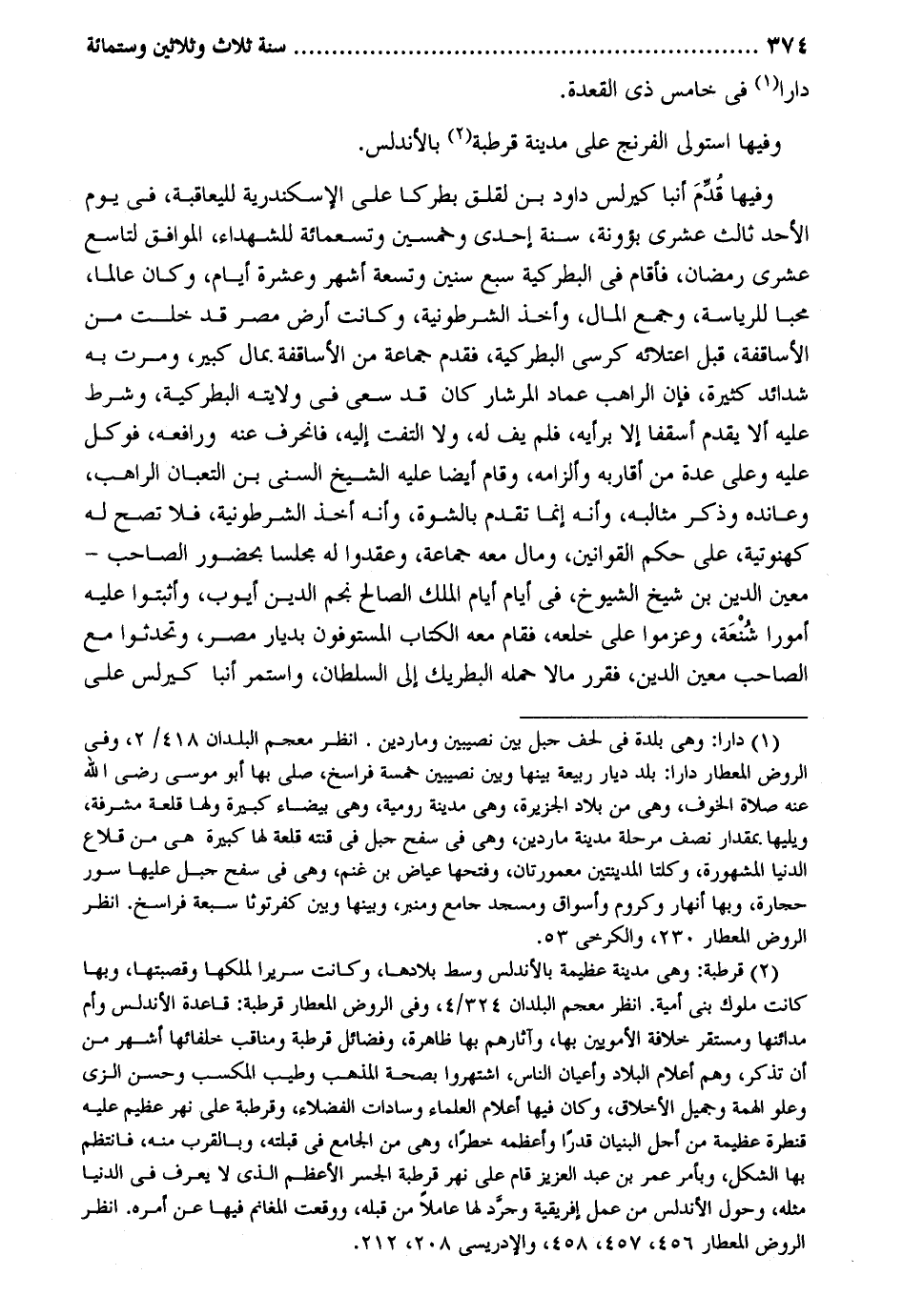 دَارا فِي خَامِس ذِي الْقعدَة. وفيهَا استولى الفرنج على مَدِينَة قرطبة بالأندلس. وفيهَا قدم أنبا كيرلس دَاوُد بن لقلق بطركا على الْإسْكَنْدَريَّة لليعاقبة فِي يَوْم الْأَحَد ثَالِث عشري بؤونة سنة إِحْدَى وَخمسين وَتِسْعمِائَة للشهداء الْمُوَافق لتاسع عشري رَمَضَان فَأَقَامَ فِي البطركية سبع سِنِين وَتِسْعَة أشهر وَعشرَة أَيَّام وَكَانَ عَالما محباً للرياسة وَجمع المَال وَأخذ الشرطونية وَكَانَت أَرض مصر قد خلت من الأساقفة قبل اعتلائه كرْسِي البطركية فَقدم جمَاعَة من الأساقفة بِمَال كَبِير وَمَرَّتْ بِهِ شَدَائِد كَثِيرَة فَإِن الراهب عماد المرشار كَانَ قد سعى فِي ولَايَته البطركية وَشرط عَلَيْهِ أَلا يقدم أسقفا إِلَّا بِرَأْيهِ فَلم يَفِ لَهُ وَلَا الْتفت إِلَيْهِ فانحرف عَنهُ ورافعه فَوكل عَلَيْهِ وعَلى عدَّة من أَقَاربه وألزامه وَقَامَ أَيْضا عَلَيْهِ الشَّيْخ السّني بن التعبان الراهب وعانده وَذكر مثالبه وَأَنه إِنَّمَا تقدم بالشوة وَأَنه أَخذ الشرطونية فَلَا تصح لَهُ كهنوتية على حكم القوانين وَمَال مَعَه جمَاعَة وعقدوا لَهُ مَجْلِسا بِحُضُور الصاحب - معِين الدّين بن شيخ الشُّيُوخ فِي أَيَّام الْملك الصَّالح نجم الدّين أَيُّوب وأثبتوا عَلَيْهِ أموراً شنعة وعزموا على خلعه فَقَامَ مَعَه الْكتاب المستوفون بديار مصر وتحدثوا مَعَ الصاحب معِين الدّين فقرر مَالا حمله البطريك إِلَى السُّلْطَان وَاسْتمرّ أنبا كيرلس على