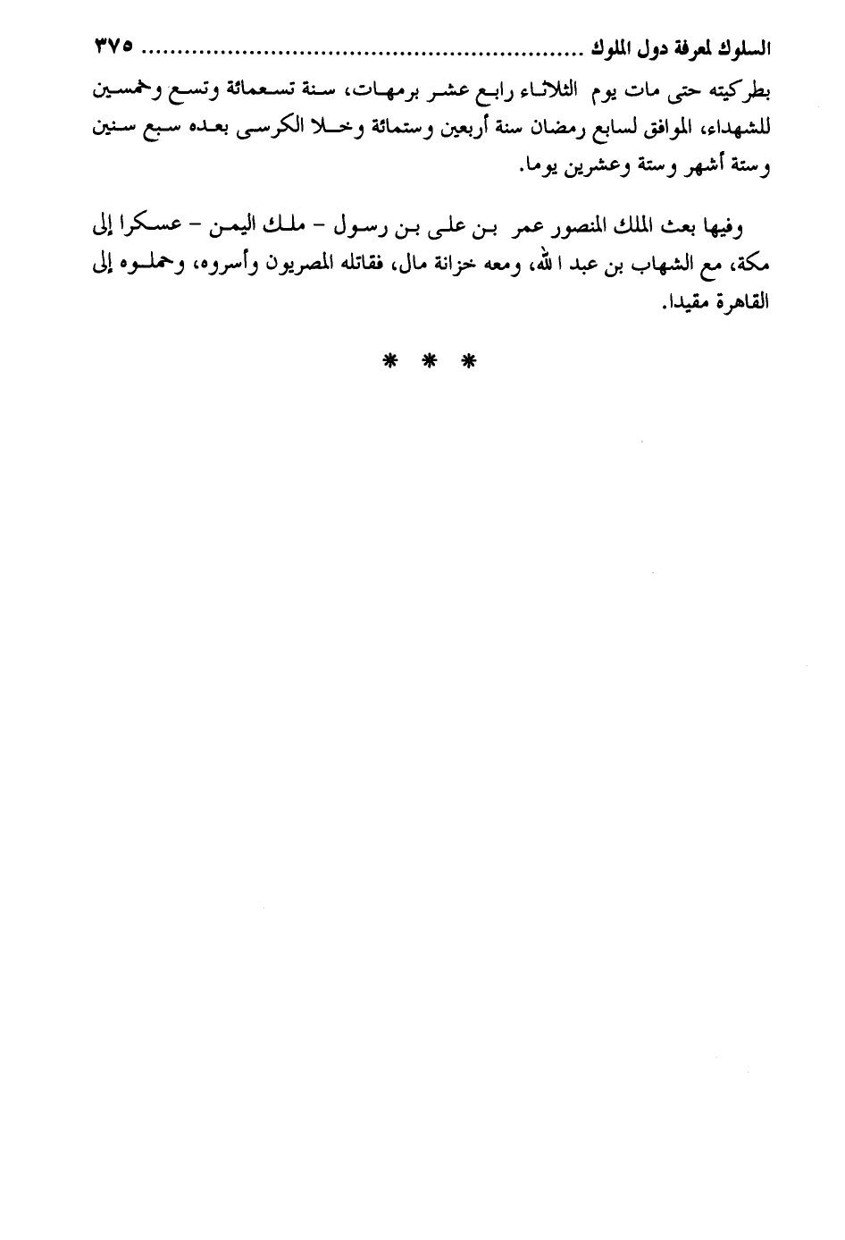 بطركيته حَتَّى مَاتَ يَوْم الثُّلَاثَاء رَابِع عشر برمهات سنة تِسْعمائَة وتسع وَخمسين للشهداء الْمُوَافق لسابع رَمَضَان سنة أَرْبَعِينَ وسِتمِائَة وخلا الْكُرْسِيّ بعده سبع سِنِين وَسِتَّة أشهر وَسِتَّة وَعشْرين يَوْمًا. وفيهَا بعث الْملك الْمَنْصُور عمر بن عَليّ بن رَسُول - ملك الْيمن - عسكراً إِلَى مَكَّة مَعَ الشهَاب بن عبد الله وَمَعَهُ خزانَة مَال فقاتله المصريون وأسروه وَحَمَلُوهُ إِلَى الْقَاهِرَة مُقَيّدا.