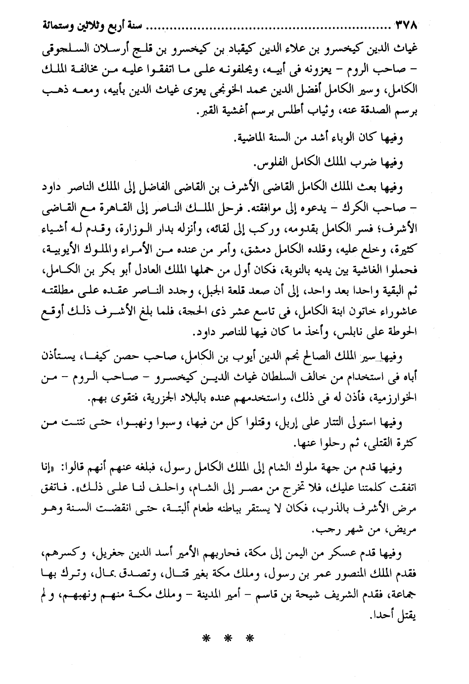 غياث الدّين كيخسرو بن عَلَاء الدّين كيقباد بن كيخسرو بن قلج أرسلان السلجوقي - صَاحب الرّوم - يعزونه فِي أَبِيه ويحلفونه على مَا اتَّفقُوا عَلَيْهِ من مُخَالفَة الْملك الْكَامِل وَشر الْكَامِل أفضل الدّين مُحَمَّد الخونجي يعزي غياث الدّين بِأَبِيهِ وَمَعَهُ ذهب برسم الصَّدَقَة عَنهُ وَثيَاب أطلس برسم أغشية الْقَبْر. وفيهَا كَانَ الوباء أَشد من السّنة الْمَاضِيَة. وفيهَا ضرب الْملك الْكَامِل الْفُلُوس. وفيهَا بعث الْملك الْكَامِل القَاضِي الْأَشْرَف بن القَاضِي الْفَاضِل إِلَى الْملك النَّاصِر دَاوُد - صَاحب الكرك - يَدعُوهُ إِلَى مُوَافَقَته. فَرَحل الْملك النَّاصِر إِلَى الْقَاهِرَة مَعَ القَاضِي الْأَشْرَف فسر الْكَامِل بقدومه وَركب إِلَى لِقَائِه وأنزله بحار الوزارة وَقدم لَهُ أَشْيَاء كَثِيرَة وخلع عَلَيْهِ وقلده الْكَامِل دمشق وَأمر من عِنْده من الْأُمَرَاء والملوك الأيوبية فحملوا الغاشية بَين يَدَيْهِ بالنوبة فَكَانَ أول من حملهَا الْملك الْعَادِل أَبُو بكر بن الْكَامِل ثمَّ الْبَقِيَّة وَاحِدًا بعد وَاحِد إِلَى أَن صعد قلعة الْجَبَل وجدد النَّاصِر عقده على مطلقته عَاشُورَاء خاتون ابْنة الْكَامِل فِي تَاسِع عشر ذِي الْحجَّة فَلَمَّا بلغ الْأَشْرَف ذَلِك أوقع الحوطة على نابلس وَأخذ مَا كَاد فِيهَا للناصر دَاوُد. وفيهَا سير الْملك الصَّالح نجم الدّين أَيُّوب بن الْكَامِل صَاحب حصن كيفا يسْتَأْذن أَبَاهُ فِي اسْتِخْدَام من خَالف السُّلْطَان غياث الدّين كيخسرو - صَاحب الرّوم - من الخوارزمية فَأذن لَهُ فِي ذَلِك واستخدمهم عِنْده بالبلاد الجزرية فتقوى بهم. وفيهَا استولى التتار على إربل وَقتلُوا كل من فِيهَا وَسبوا ونهبوا حَتَّى نتنت من كَثْرَة الْقَتْلَى ثمَّ رحلوا عَنْهَا. وفيهَا قدم من جِهَة مُلُوك الشَّام إِلَى الْملك الْكَامِل رَسُول فَبَلغهُ عَنْهُم أَنهم قَالُوا: إِنَّا اتّفقت كلمتنا عَلَيْك فَلَا تخرج من مصر إِلَى الشَّام واحلف لنا على ذَلِك. فاتفق مرض الْأَشْرَف بِالْقربِ فَكَانَ لَا يسْتَقرّ بباطنه طَعَام الْبَتَّةَ حَتَّى انْقَضتْ السّنة وَهُوَ مَرِيض من شهر رَجَب. وفيهَا قدم عَسْكَر من الْيمن إِلَى مَكَّة فحاربهم الْأَمِير أَسد الدّين جغريل وكسرهم فَقدم الْملك الْمَنْصُور عمر بن رَسُول وَملك مَكَّة بِغَيْر قتال وَتصدق بِمَال وَترك بهَا جمَاعَة فَقدم الشريف شيحة بن قَاسم - أَمِير الْمَدِينَة - وَملك مَكَّة مِنْهُم ونهبهم وَلم يقتل أحدا.