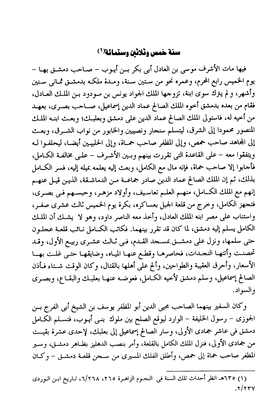 فِيهَا مَاتَ الْأَشْرَف مُوسَى بن الْعَادِل أبي بكر بن أَيُّوب - صَاحب دمشق بهَا - يَوْم الْخَمِيس رَابِع الْمحرم وعمره نَحْو من سِتِّينَ سنة وَمُدَّة ملكه بِدِمَشْق ثَمَانِي سِنِين وَأشهر وَلم يتْرك سوى ابْنة تزَوجهَا الْملك الْجواد يُونُس بن مودود بن الْملك الْعَادِل فَقَامَ من بعده بِدِمَشْق أَخُوهُ الْملك الصَّالح عماد الدّين إِسْمَاعِيل صَاحب بصرى بِعَهْد من أَخِيه لَهُ فاستوفى الْملك الصَّالح عماد الدّين على دمشق وبعلبك وَبعث ابْنه الْملك الْمَنْصُور مَحْمُودًا إِلَى الشرق ليتسلم سنجار ونصيبين والخابور من نواب الشرق وَبعث إِلَى الْمُجَاهِد صَاحب حمص وَالِي المظفر صَاحب حماة وَإِلَى الحلبيين أَيْضا ليحلفوا لَهُ ويتفقوا مَعَه - على الْقَاعِدَة الَّتِي تقررت بَينهم وَبَين الْأَشْرَف - على مُخَالفَة الْكَامِل فَأَجَابُوا إِلَّا صَاحب حماة فَإِنَّهُ مَال مَعَ الْكَامِل وَبعث إِلَيْهِ يُعلمهُ بميله إِلَيْهِ فسر الْكَامِل بذلك ثمَّ إِن الْملك الصَّالح عماد الدّين صادر جمَاعَة من الدماشقة الَّذين قيل عَنْهُم إِنَّهُم مَعَ الْملك الْكَامِل مِنْهُم الْعلم تعاسيف وَأَوْلَاد مزهر وحبسهم فِي بصرى فتجهز الْكَامِل وَخرج من قلعة الْجَبَل بعساكره بكرَة يَوْم الْخَمِيس ثَالِث عشري صفر واستناب على مصر ابْنه الْملك الْعَادِل وَأخذ مَعَه النَّاصِر دَاوُد وَهُوَ لَا يشك أَن الْملك الْكَامِل يسلم إِلَيْهِ دمشق لما كَانَ قد تقرر بَينهمَا. فكاتب الْكَامِل نَائِب قلعة عجلون حَتَّى سلمهَا وَنزل على دمشق بِمَسْجِد الْقدَم فِي ثَالِث عشري ربيع الأول وَقد تخصنت وأتتها النجدات فحاصرها وَقطع عَنْهَا الْمِيَاه وضايقها حَتَّى غلت بهَا الأسعار وأحرق العقيبة والطواحين وألح على أَهلهَا بِالْقِتَالِ وَكَانَ الْوَقْت شتاء فَأذن الصَّالح إِسْمَاعِيل وَسلم دمشق لِأَخِيهِ الْكَامِل فَعوضهُ عَنْهَا بعلبك وَالْبِقَاع وَبصرى والسواد. وَكَانَ السفير بَينهمَا الصاحب محيي الدّين أَبُو المظفر يُوسُف بن الشَّيْخ أبي الْفرج بن الْجَوْزِيّ - رَسُول الْخَلِيفَة - الْوَارِد ليوقع الصُّلْح بَين مُلُوك بني أَيُّوب فتسلم الْكَامِل دمشق فِي عَاشر جُمَادَى الأولى وَسَار الصَّالح إِسْمَاعِيل إِلَى بعلبك لإحدى عشرَة بقيت من جُمَادَى الأولى فَنزل الْملك الْكَامِل بالقلعة وَأمر بِنصب الدهليز بِظَاهِر دمشق وسير المظفر صَاحب حماة إِلَى حمص وَأطلق الْفلك المسيري من سجن قلعة دمشق - وَكَانَ